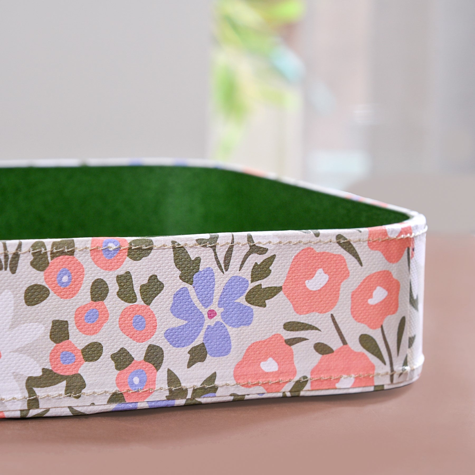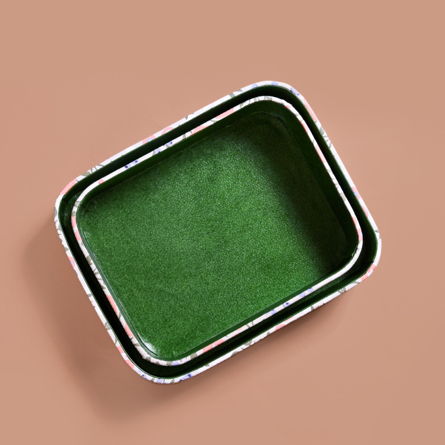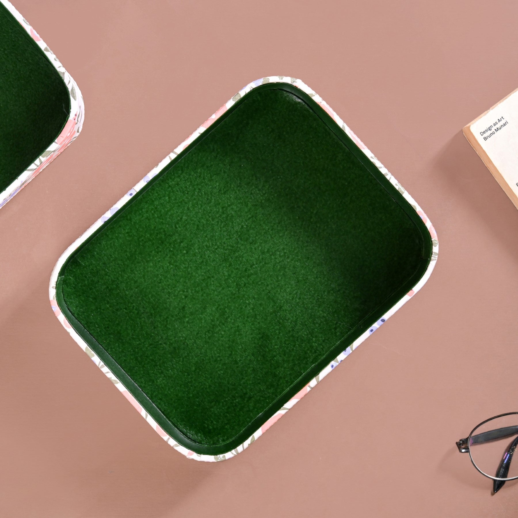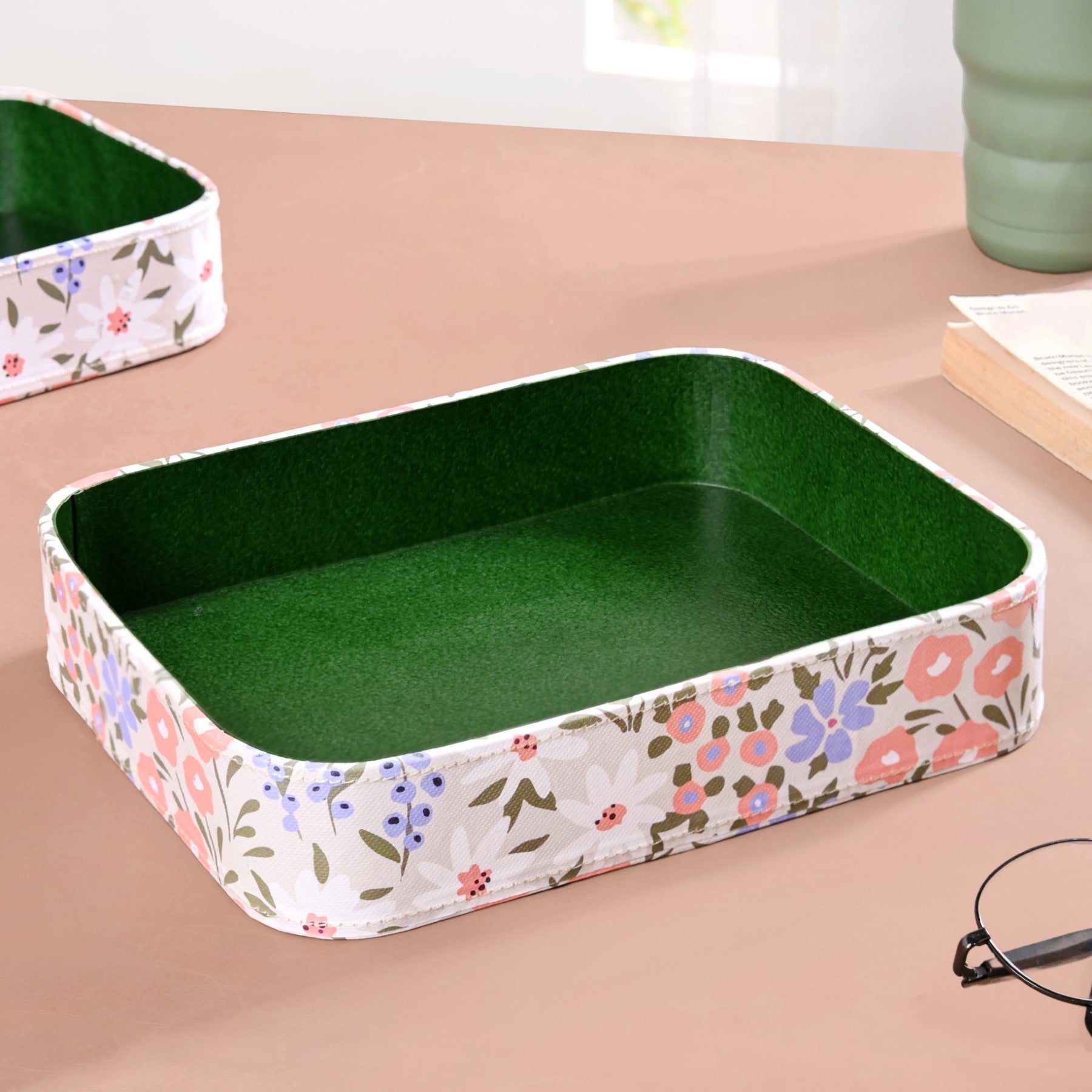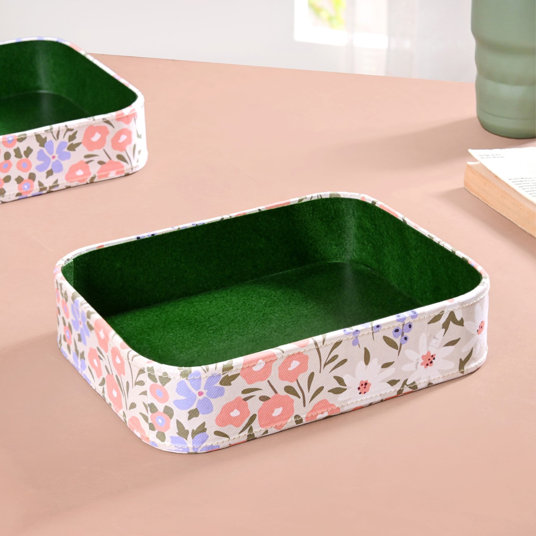 Design: Whether placed on your vanity, desk, or coffee table, these trays offer a decorative and practical solution to organise daily essentials. The exterior features a pastel floral print in soft hues of coral, lilac, and sage, contrasted by a clean green interior. The base of the tray is also completely floral. Whether placed on your vanity, desk, or coffee table, these trays offer a decorative and practical solution to organise daily essentials.