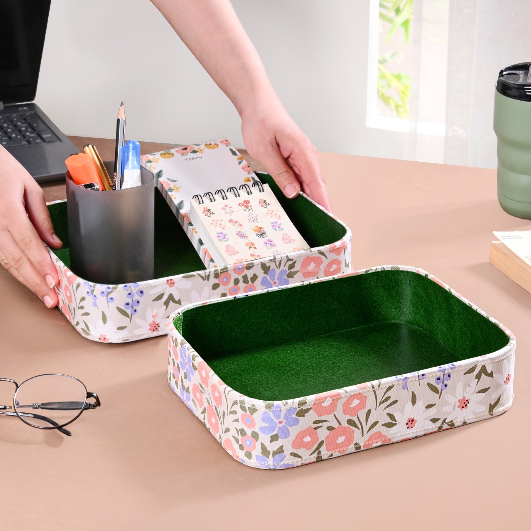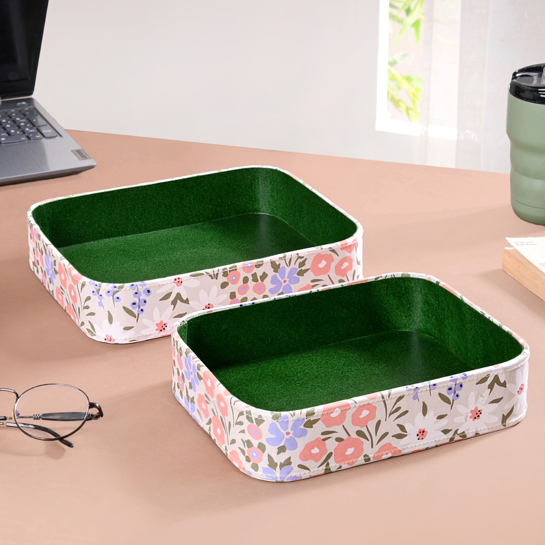Whimsical florals meet everyday functionality in this charming organiser duo, designed to uplift your space with effortless style. A seamless blend of utility and elegance, this set of 2 floral eco-leatherette organiser trays is perfect for curating a tidy and beautiful space.