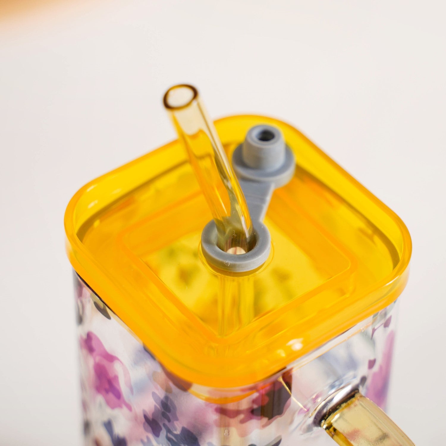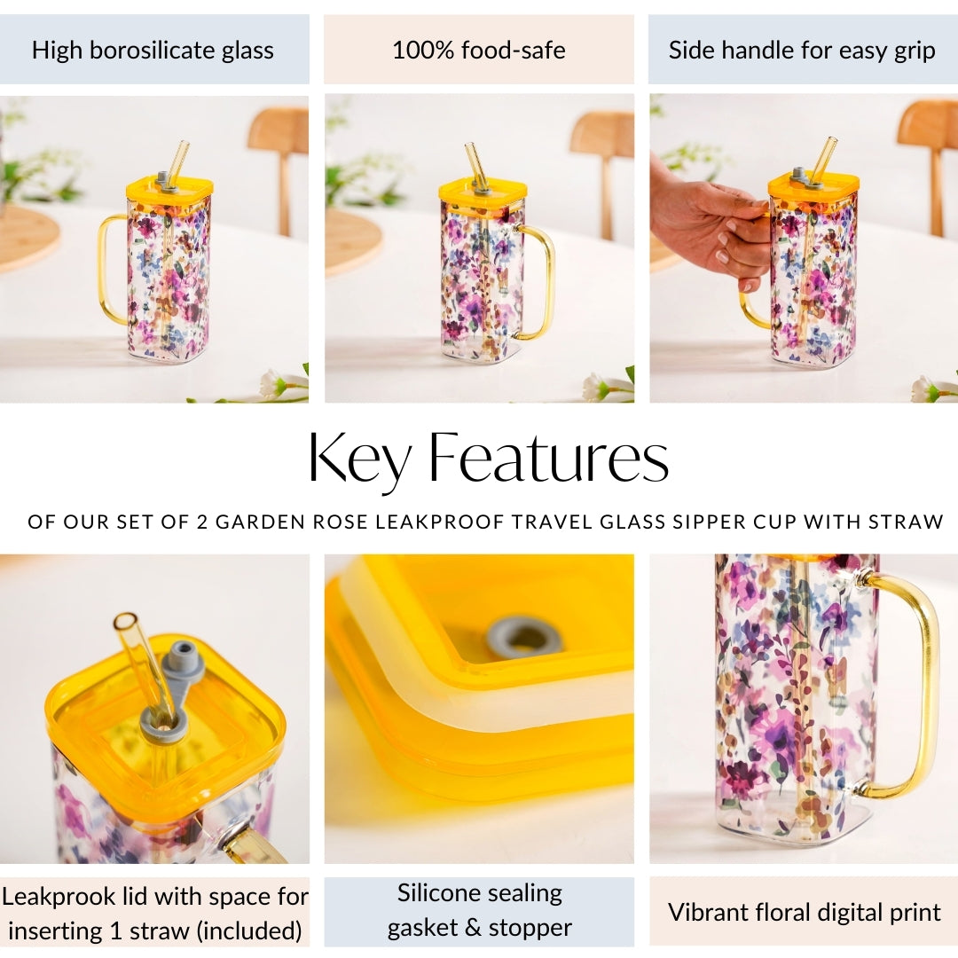 Design: Designed to keep up with a busy lifestyle, this sipper cup is a stylish statement piece. Featuring a stunning digital floral print with garden roses in shades of yellow, pink, purple, and blue, it brings a fresh, nature-inspired touch to your drinkware. The square shape adds a modern twist, while the yellow handle, lid, and straw provide a bold yet elegant contrast. Designed with comfort in mind, the sturdy side handle ensures a secure grip, allowing you to enjoy your beverages while on the go with ease.
