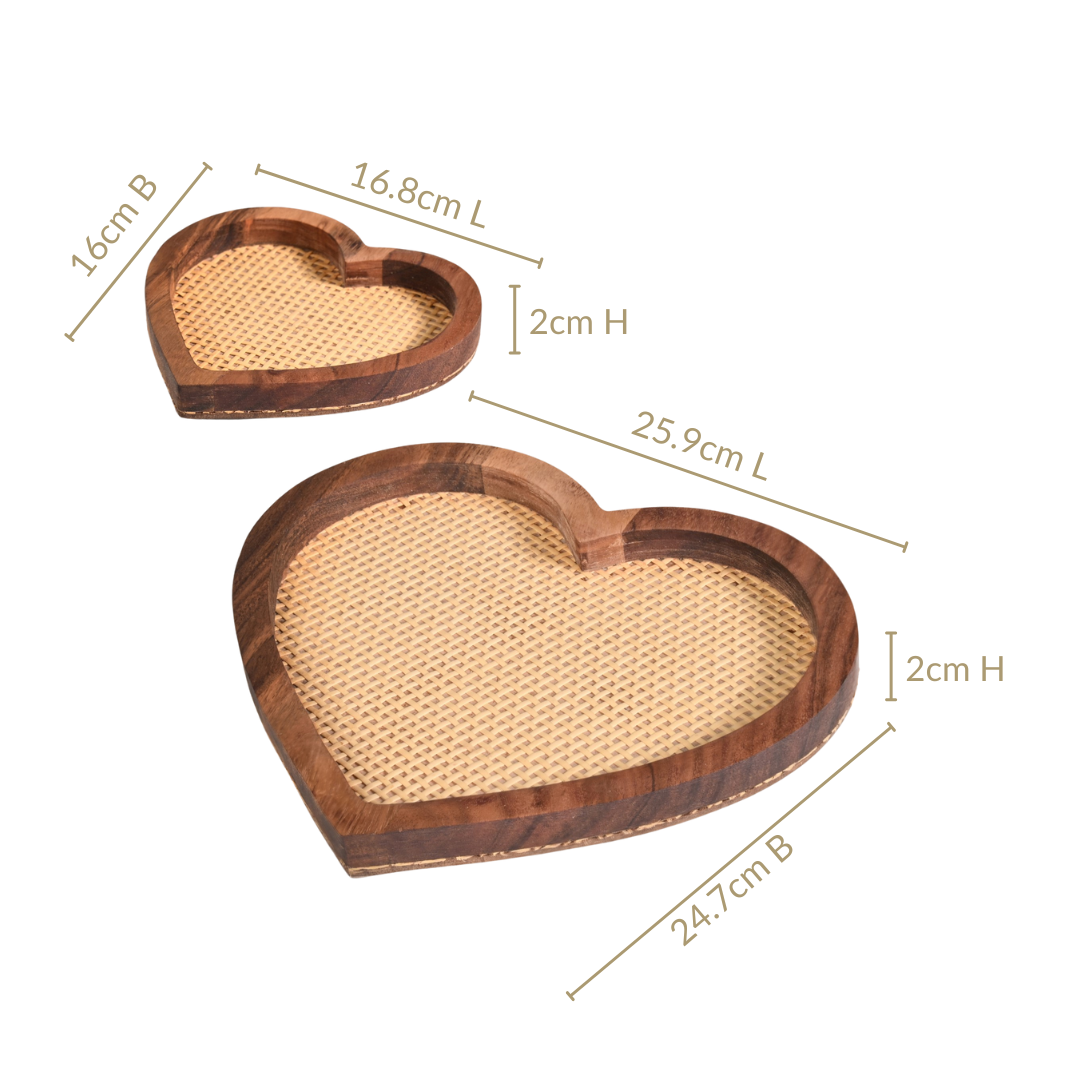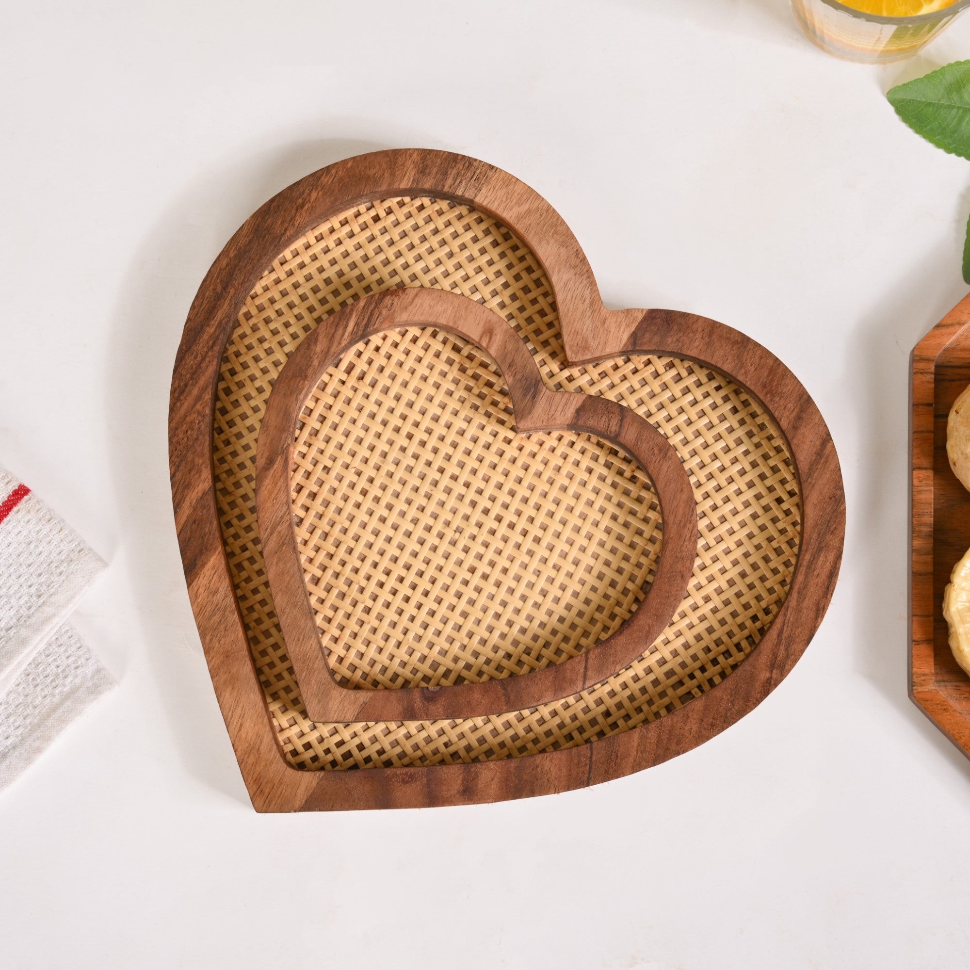 Set Of 2 Heart Wooden Platter With Organic Rattan Weave