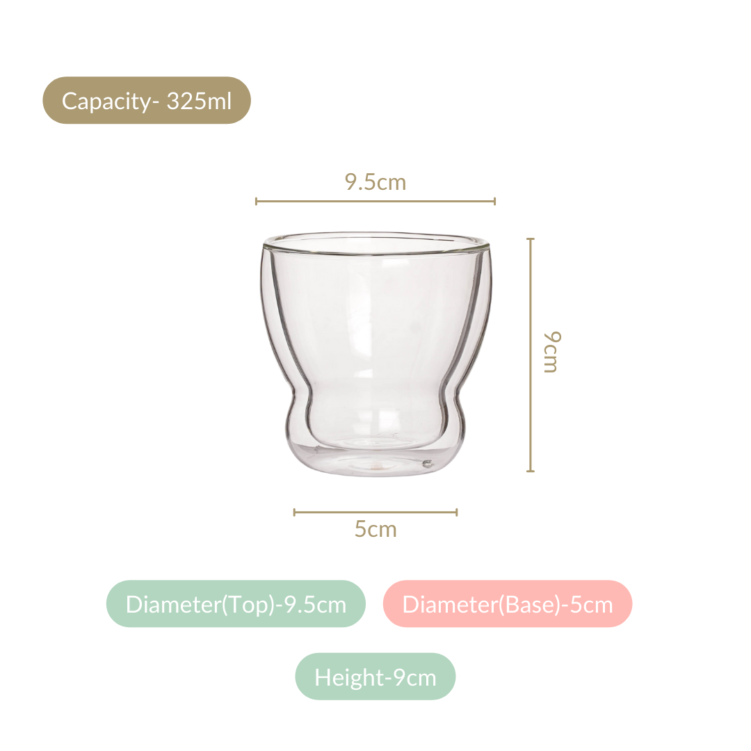Design: Featuring a sleek and curvy profile with a narrow base and broad mouth, these drinking glasses offer both aesthetic appeal and practical use. The double-wall construction ensures your drinks stay at the ideal temperature while adding a touch of modern sophistication.