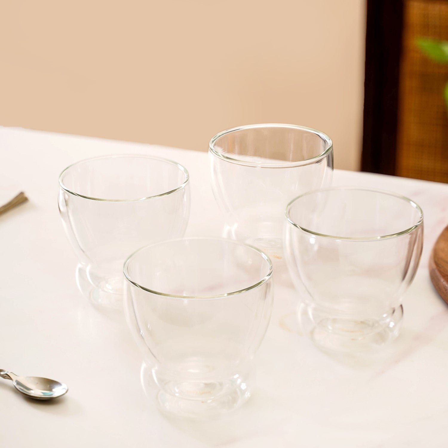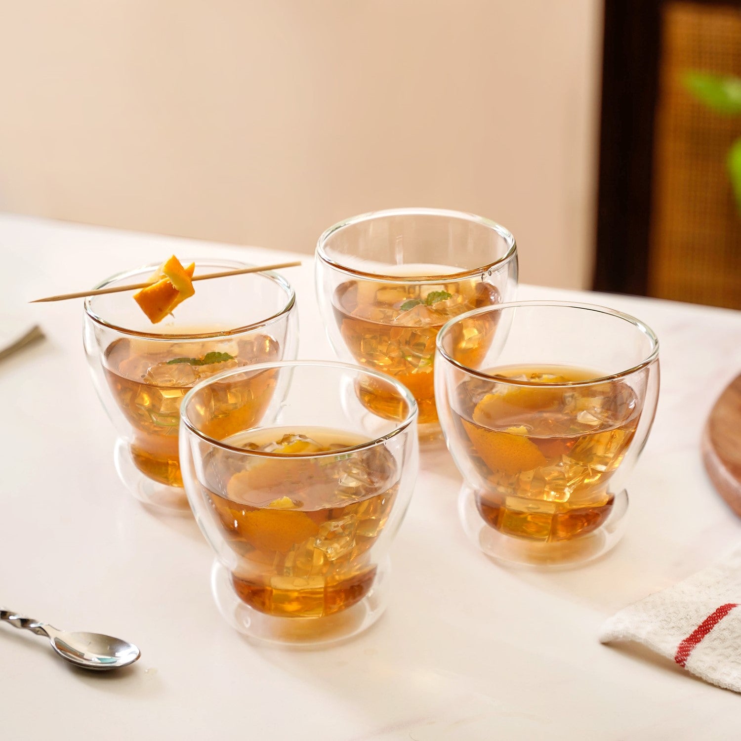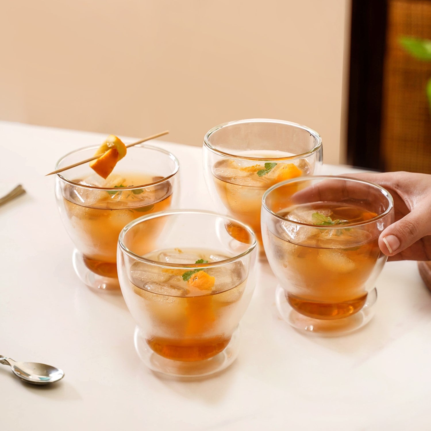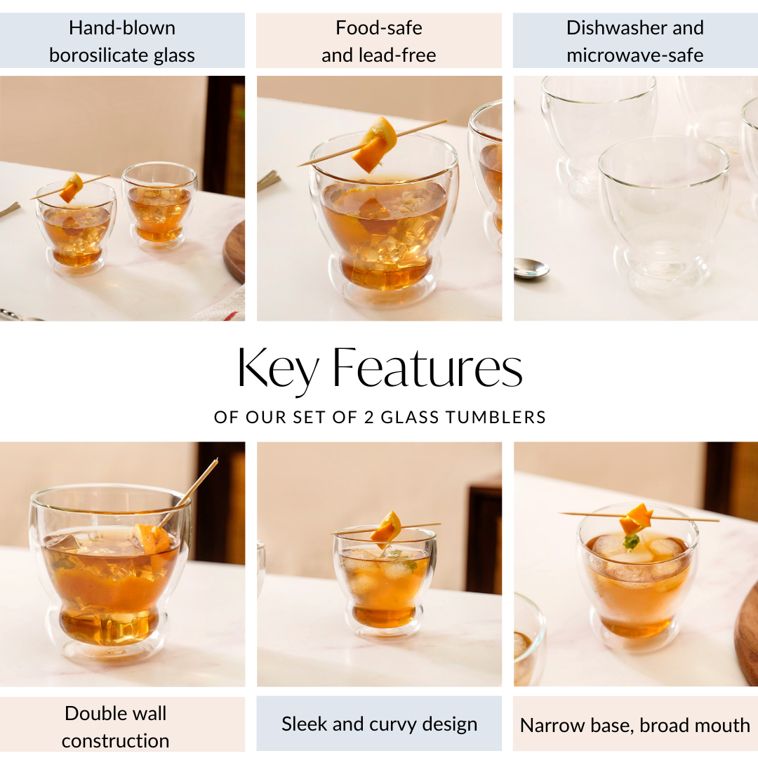 Benefits: Crafted from hand-blown borosilicate glass, these juice glasses are food-safe, lead-free, and durable. They are microwave and dishwasher-safe for easy usage and cleaning, combining convenience with safety in every sip. The double-wall glasses are also perfect for serving iced lattes, matcha lattes, iced lemon tea, turmeric milk, and more.