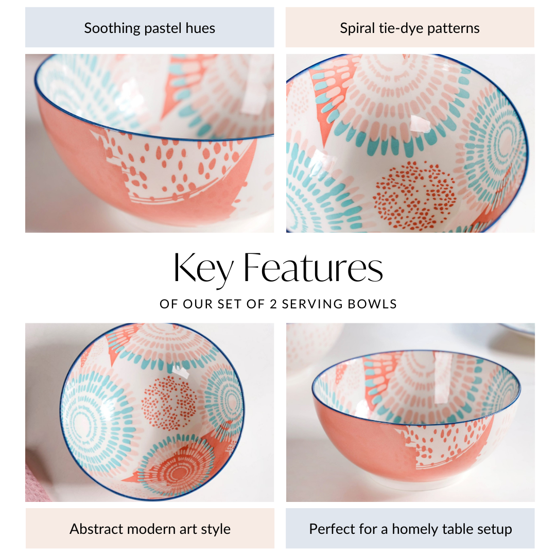 Transform your dining experience with our exquisite set of 2 ceramic serving bowls, meticulously designed for both style and functionality. Crafted from 100% food-safe ceramic, these serving bowls adhere to international food-grade standards, ensuring your safety with lead-free, non-toxic materials. Microwave and dishwasher-safe, they offer convenience without compromising on elegance. Featuring soothing pastel hues and captivating spiral tie-dye patterns in an abstract modern art style, these ceramic bowls effortlessly enhance any table setup. Whether hosting a gathering or searching for the perfect gift, these bowls are the epitome of sophistication and utility, catering to those with discerning tastes.