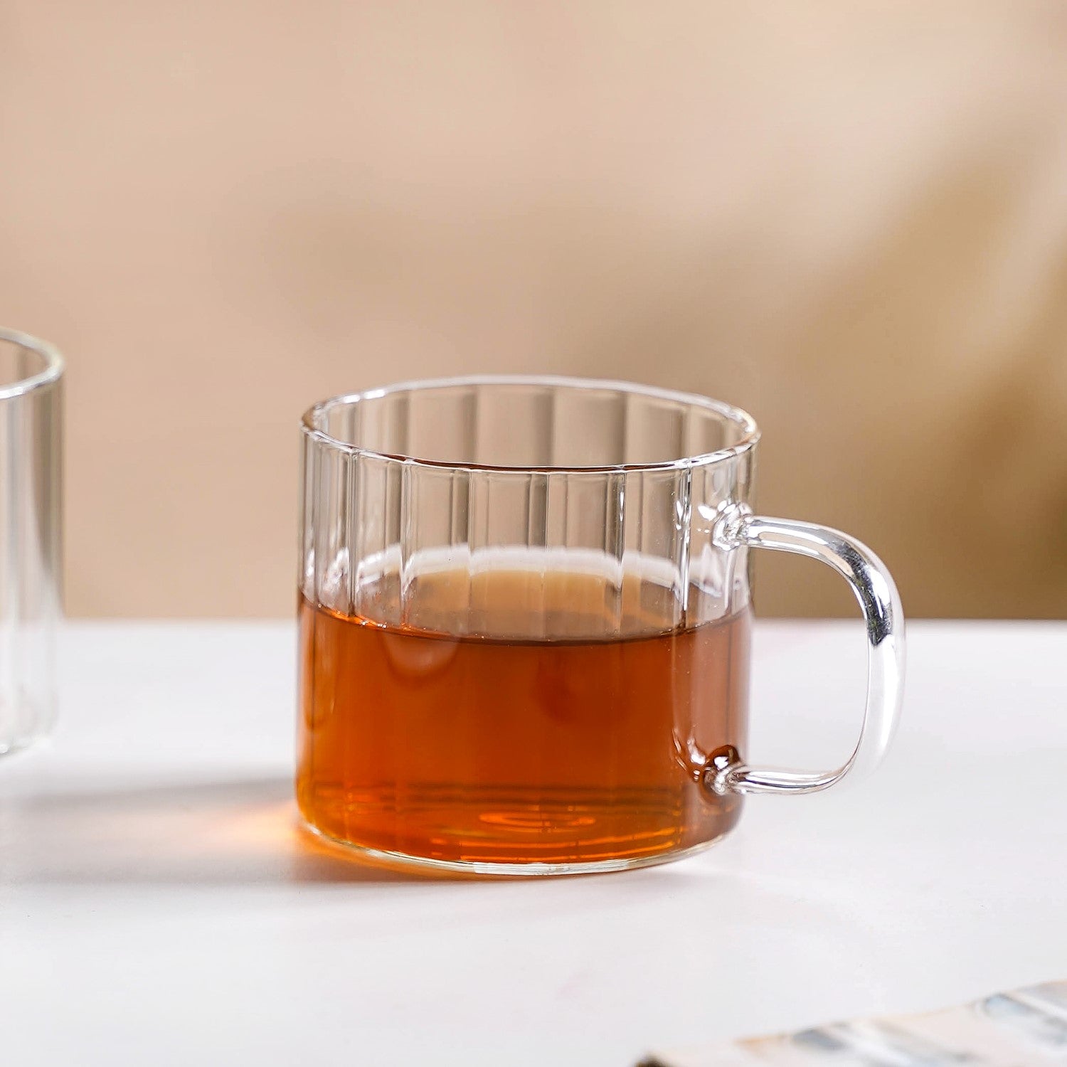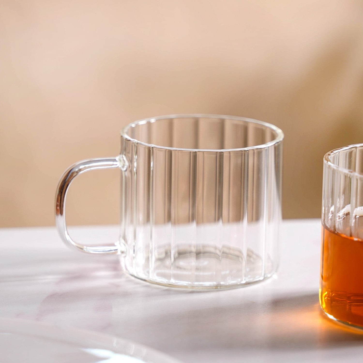 Benefits: Crafted from durable borosilicate glass, this cup is heat-resistant and built for everyday use. The vertical ribbed texture enhances grip, while the flat base prevents tipping. The thickened rim and rounded handle provide comfort and balance. Its minimalist design adds a stylish, modern element to any setting. Lightweight and easy to stack, it’s perfect for efficient storage in smaller kitchens or offices. The clarity of the glass enhances its versatility, making it ideal for both casual and more formal settings.