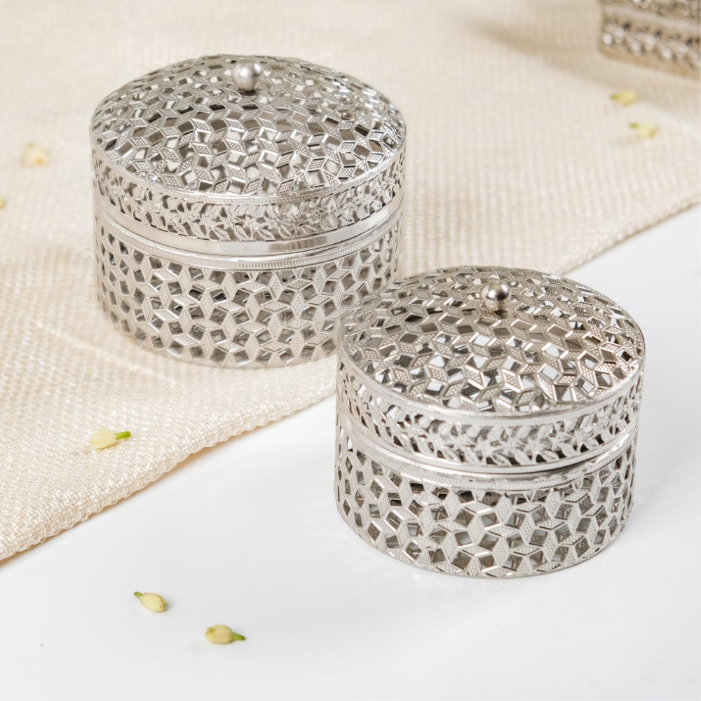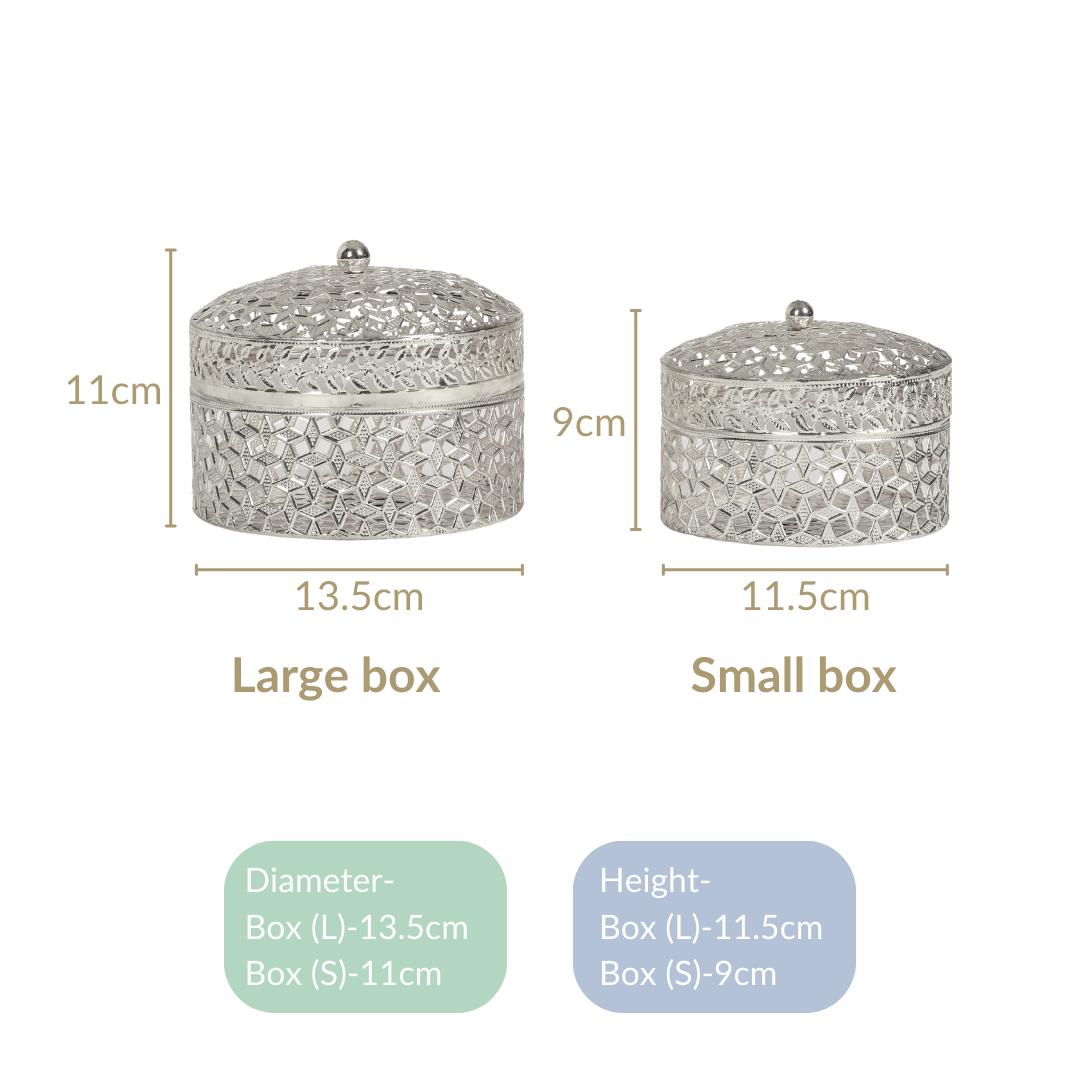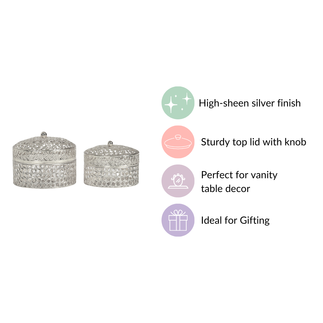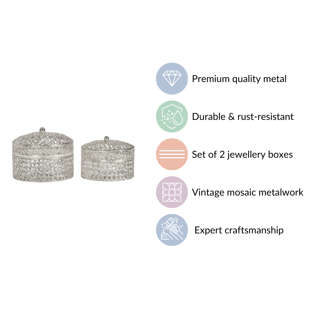 Introducing our exquisite set of 2 metal jewellery boxes - the epitome of luxury and functionality. Crafted with utmost precision, these boxes boast premium quality metal, ensuring both durability and rust resistance. The vintage mosaic metalwork showcases expert craftsmanship, while the high-sheen silver finish radiates elegance. The sturdy top lid, complete with a delicate knob, adds a touch of sophistication. This set is not only perfect for your vanity table, keeping your treasures organised, but also makes for an ideal and thoughtful gift.