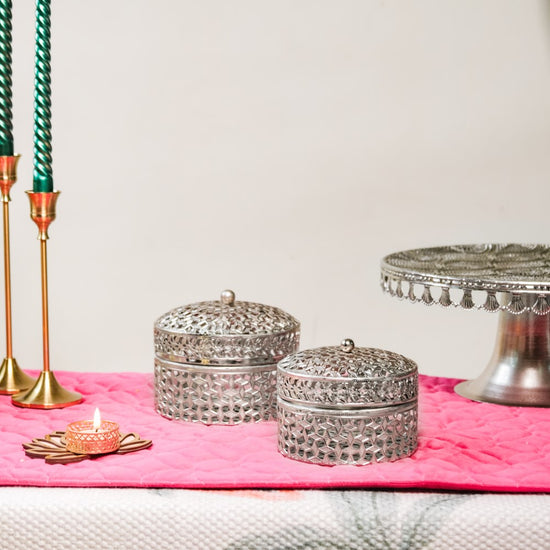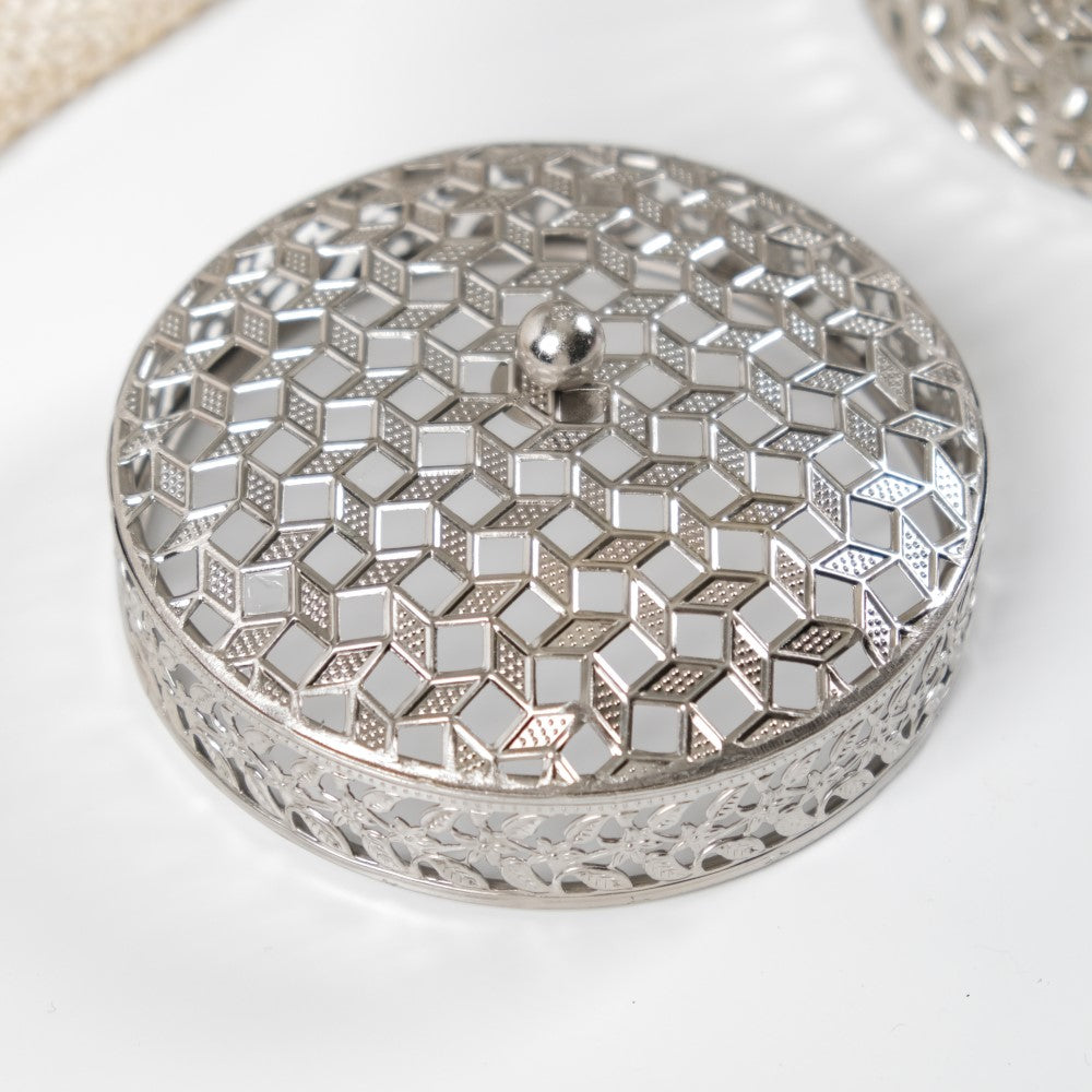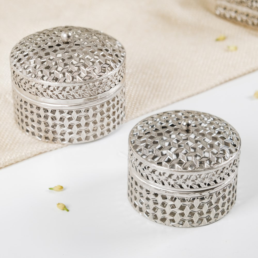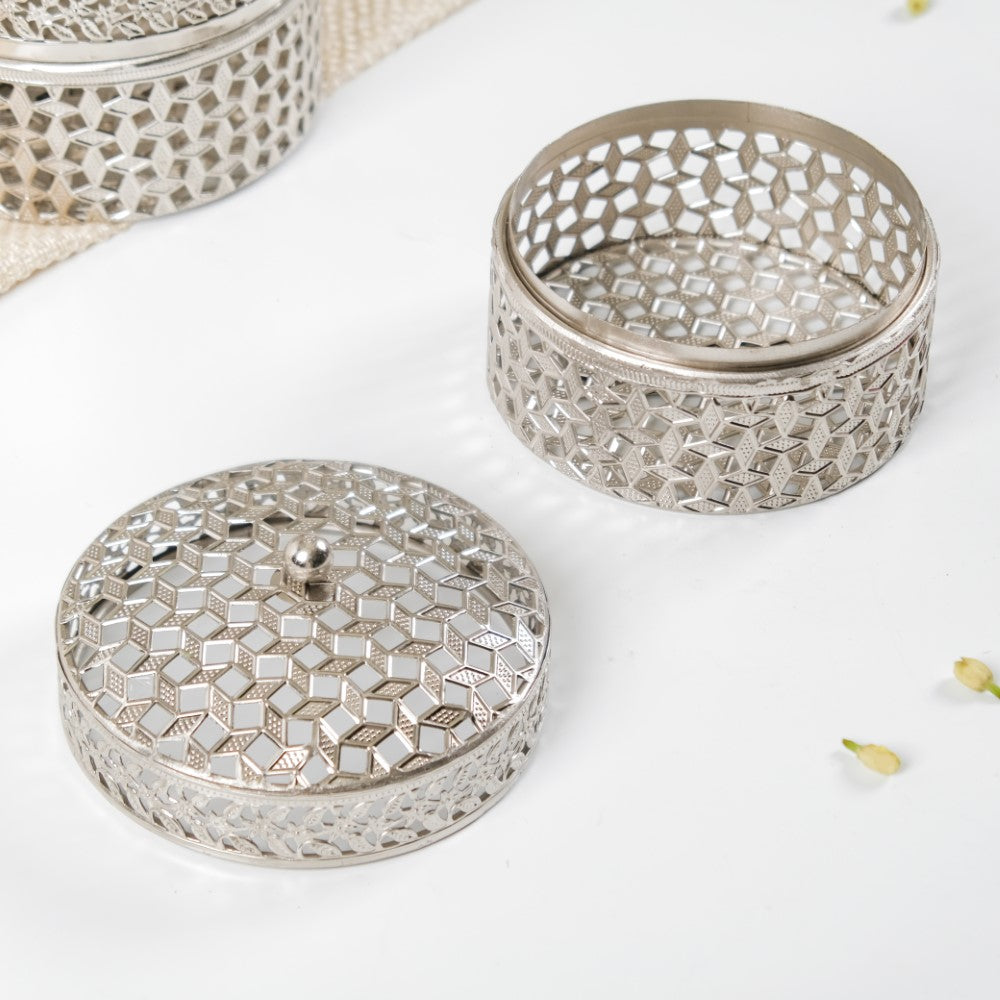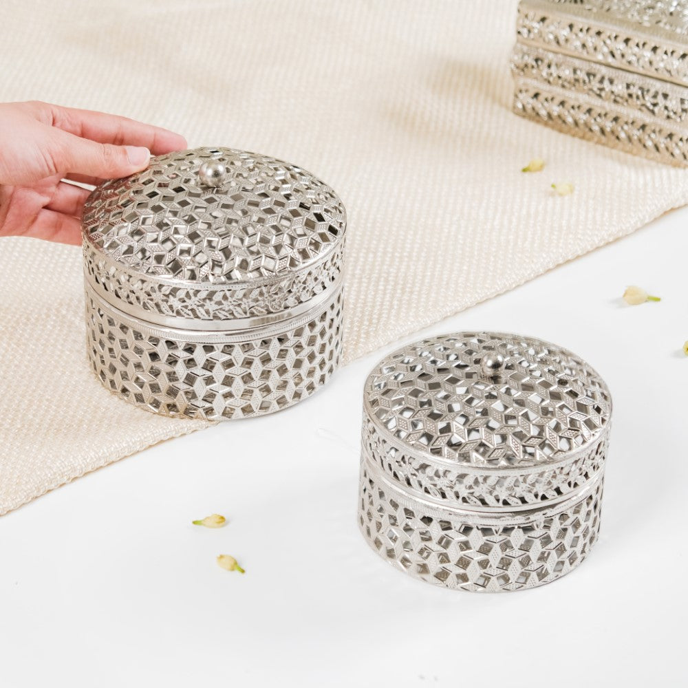 Introducing our exquisite set of 2 metal jewellery boxes - the epitome of luxury and functionality. Crafted with utmost precision, these boxes boast premium quality metal, ensuring both durability and rust resistance. The vintage mosaic metalwork showcases expert craftsmanship, while the high-sheen silver finish radiates elegance. The sturdy top lid, complete with a delicate knob, adds a touch of sophistication. This set is not only perfect for your vanity table, keeping your treasures organised, but also makes for an ideal and thoughtful gift.