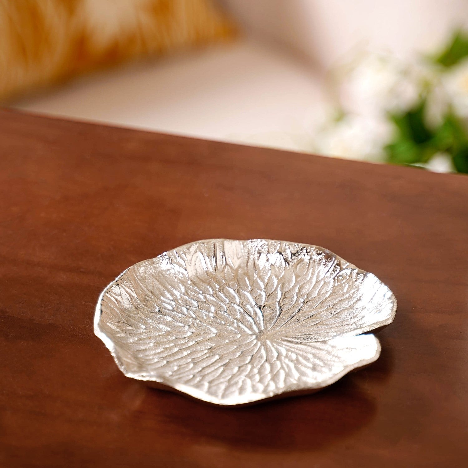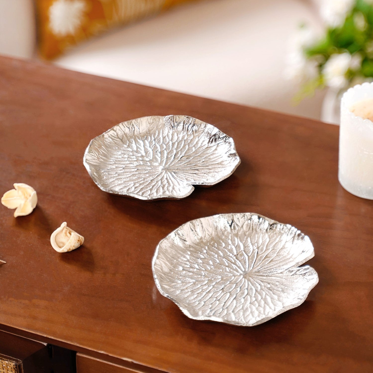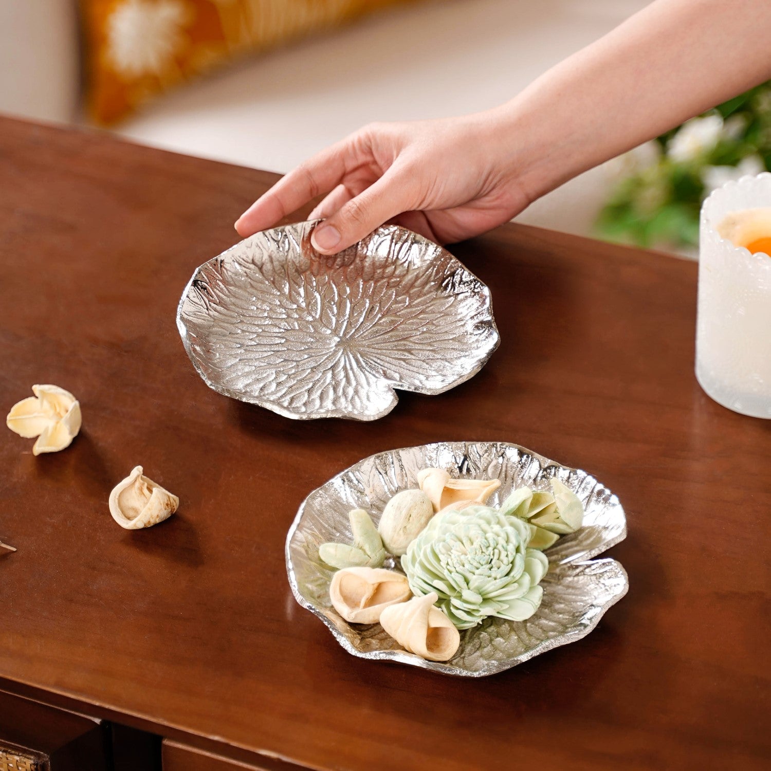 To create a cohesive look, pair the trinket trays with other metallic accents or items that share similar design elements, such as gold photo frames, decorative bowls, or vases with similar leaf motifs.