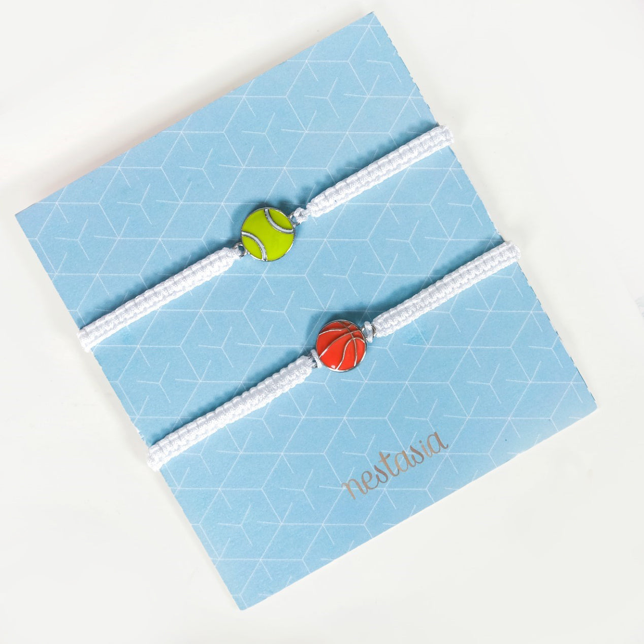 Here's something cheeky for the little ones and even adults who wish to relive their childhood days - our set of 2 bracelets. Get ready to be whiskered away to open fields, rustling glass, your favourite pals, and the fun outdoor games that would bring gleeful smiles. The simple bracelets feature clean white braided bands with tennis ball and basketball charms, capturing the true essence of sports. Whether worn with a plain graphic tee or given to the munchkins to show off to their friends, the tie-bracelets add some fun and flair to your everyday look.