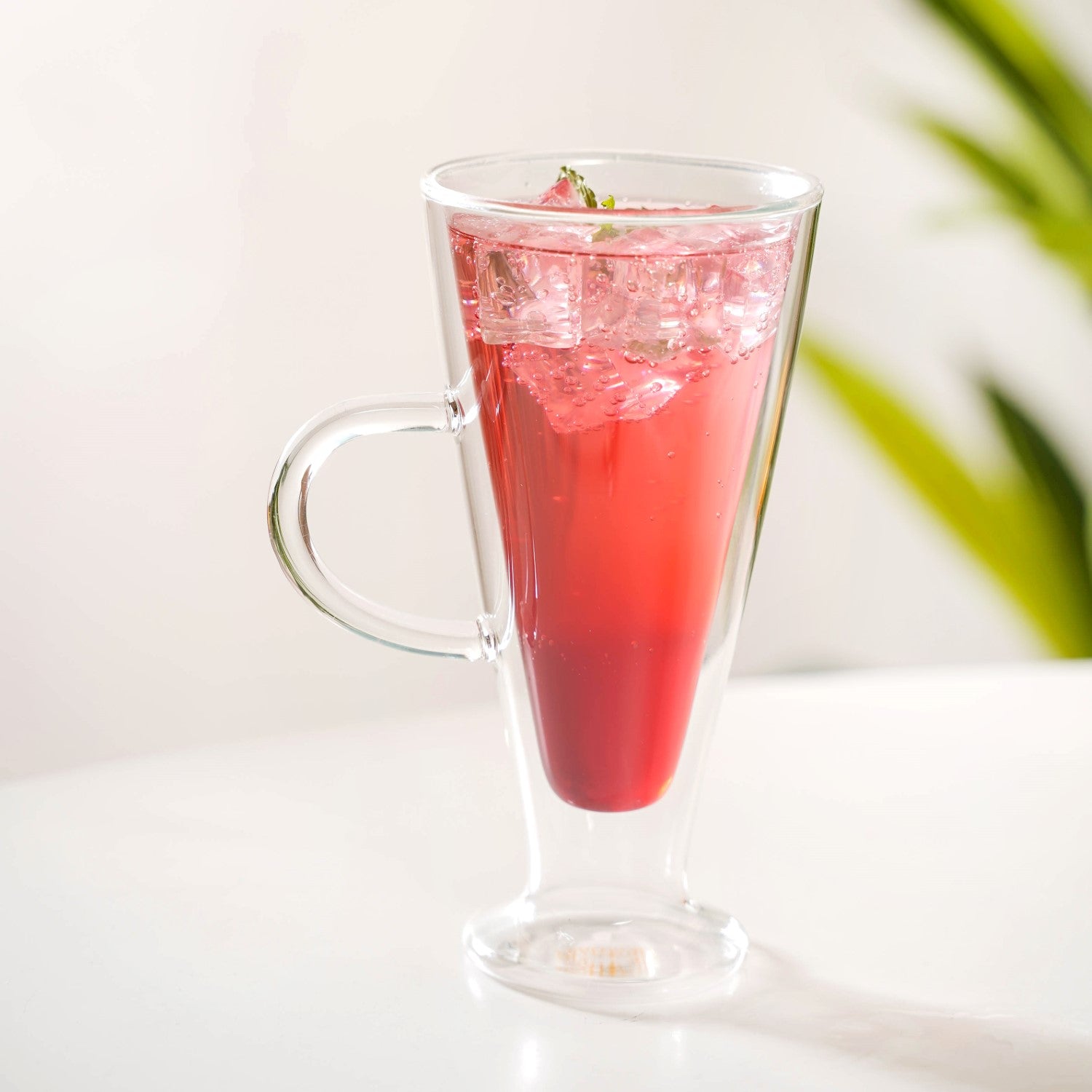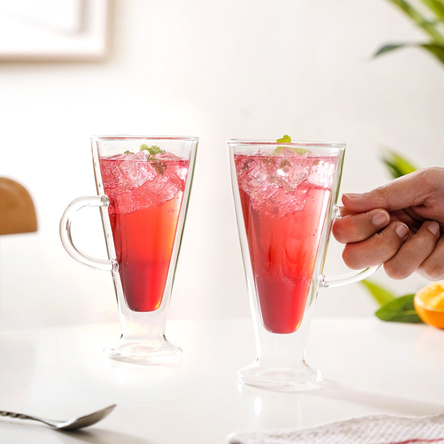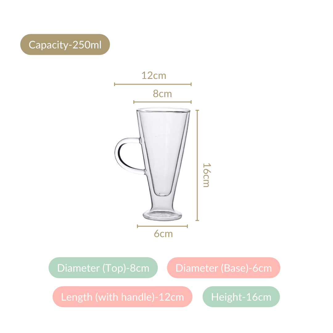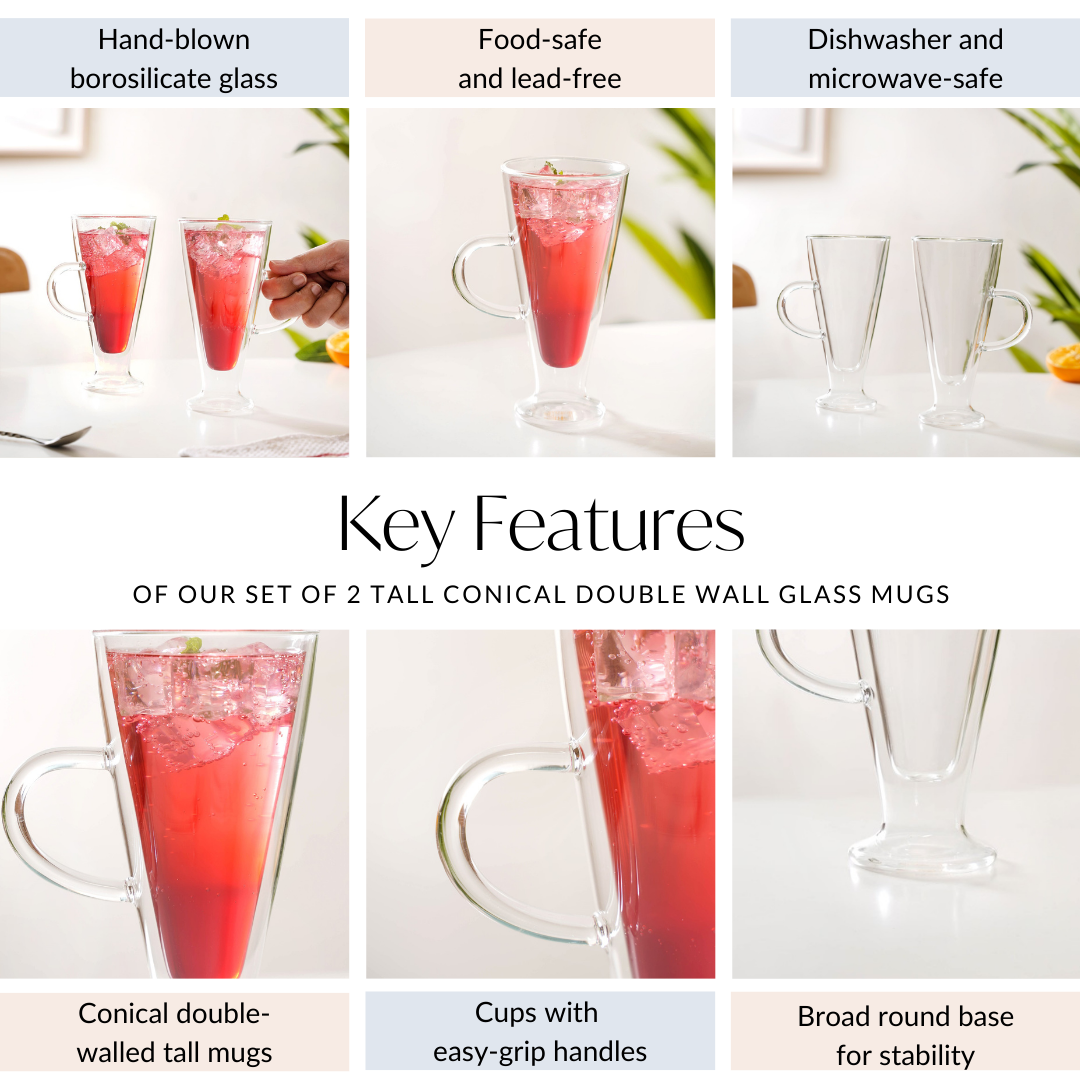 Design: The tall conical shape of these mugs is not only visually striking but also practical, making them ideal for serving a variety of beverages. The narrow top helps to retain the aroma of hot drinks like coffee and tea, while the spacious base is perfect for showcasing layered beverages, smoothies, or refreshing iced drinks. The double-walled construction maintains the temperature of your drinks longer, and the easy-grip ergonomic handle ensures comfort while holding. The broad round base adds stability, reducing the risk of tipping.