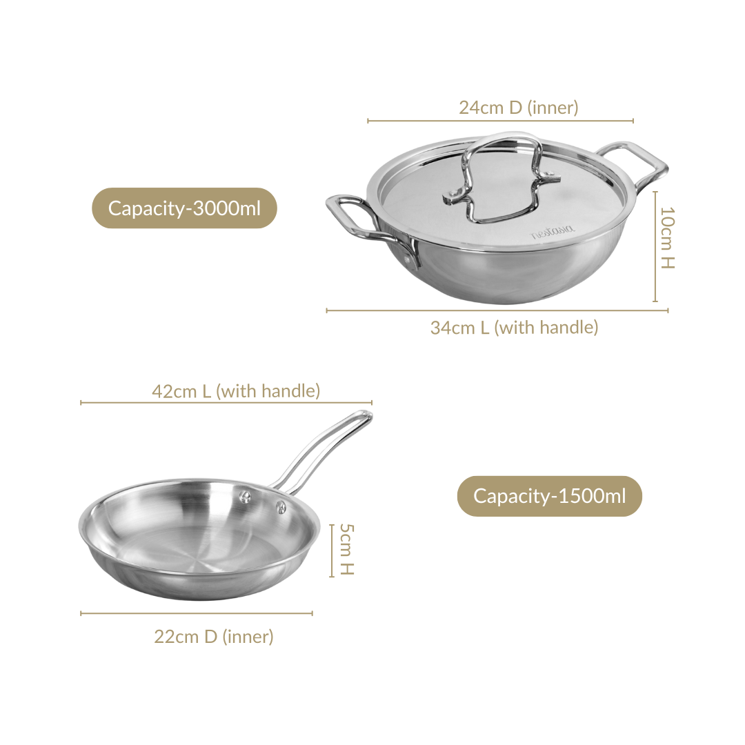 Set Of 2 Triply Stainless Steel Kadai With Lid And Frying Pan