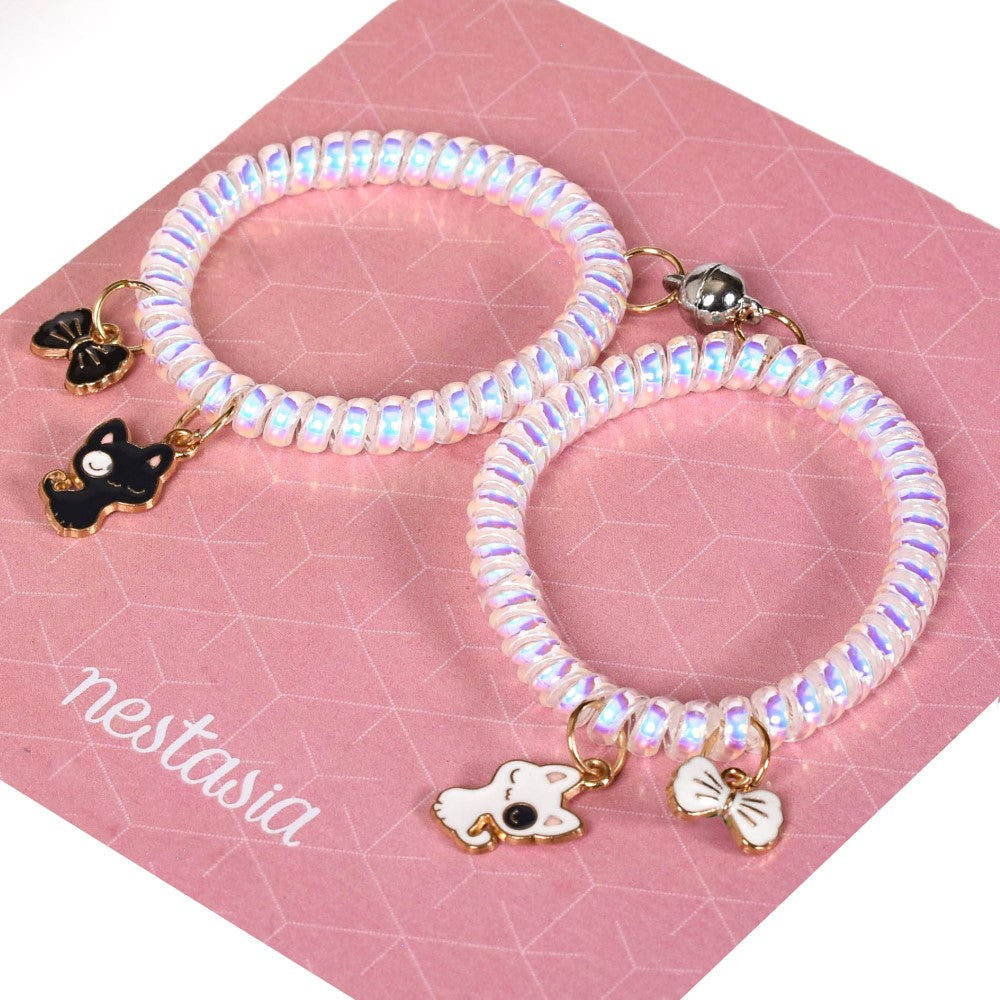 Here's something cheeky for all the crazy cat lovers - our set of 2 charm bracelets. Crafted beautifully for children and adults alike, the bracelets come in a black-and-white colour combination. Featuring coiled high-sheen iridescent bands, each bracelet highlights an adorable winking kitten and a cute bow charm alongside. But that's not all! The bracelets attract one another through a clever magnet mechanism that creates an added element of interest.