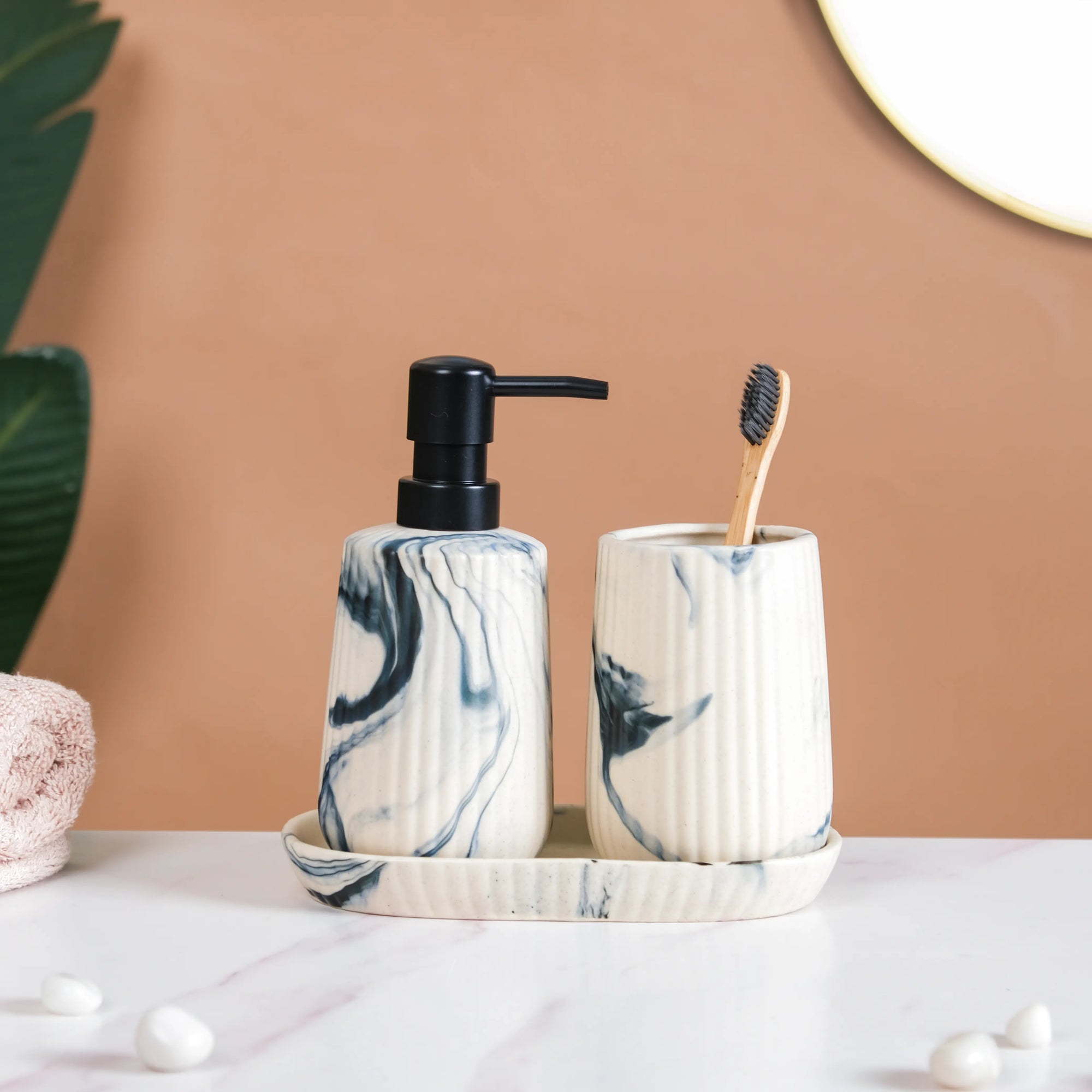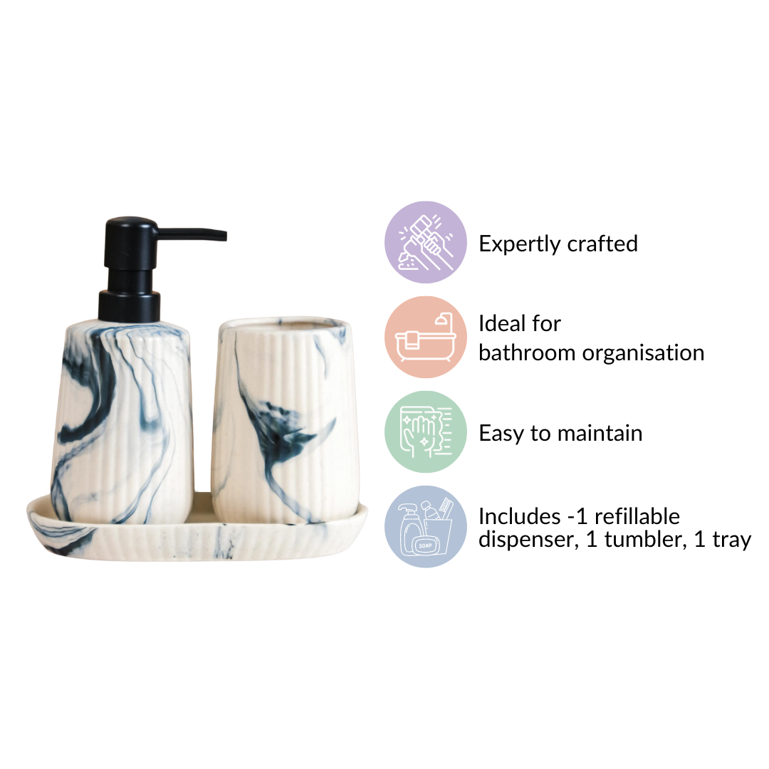 Our exceptional bathroom accessories set not only enhances the aesthetics of your bathroom but also offers practical organization. The soap dispenser ensures effortless hygiene, the tumbler adds a touch of elegance, and the toothbrush holder keeps your dental essentials neatly organized. Together, they transform your bathroom into a refined and efficient space, elevating your daily routine to a new level of luxury and convenience.