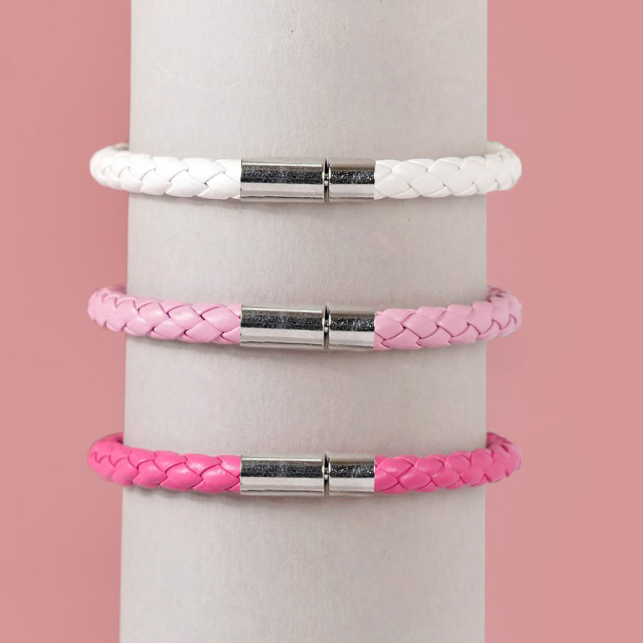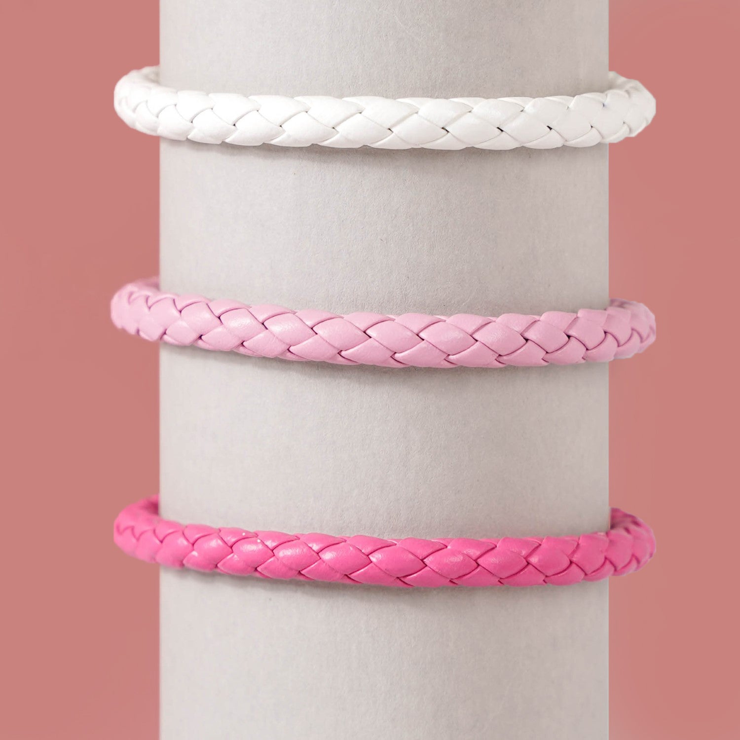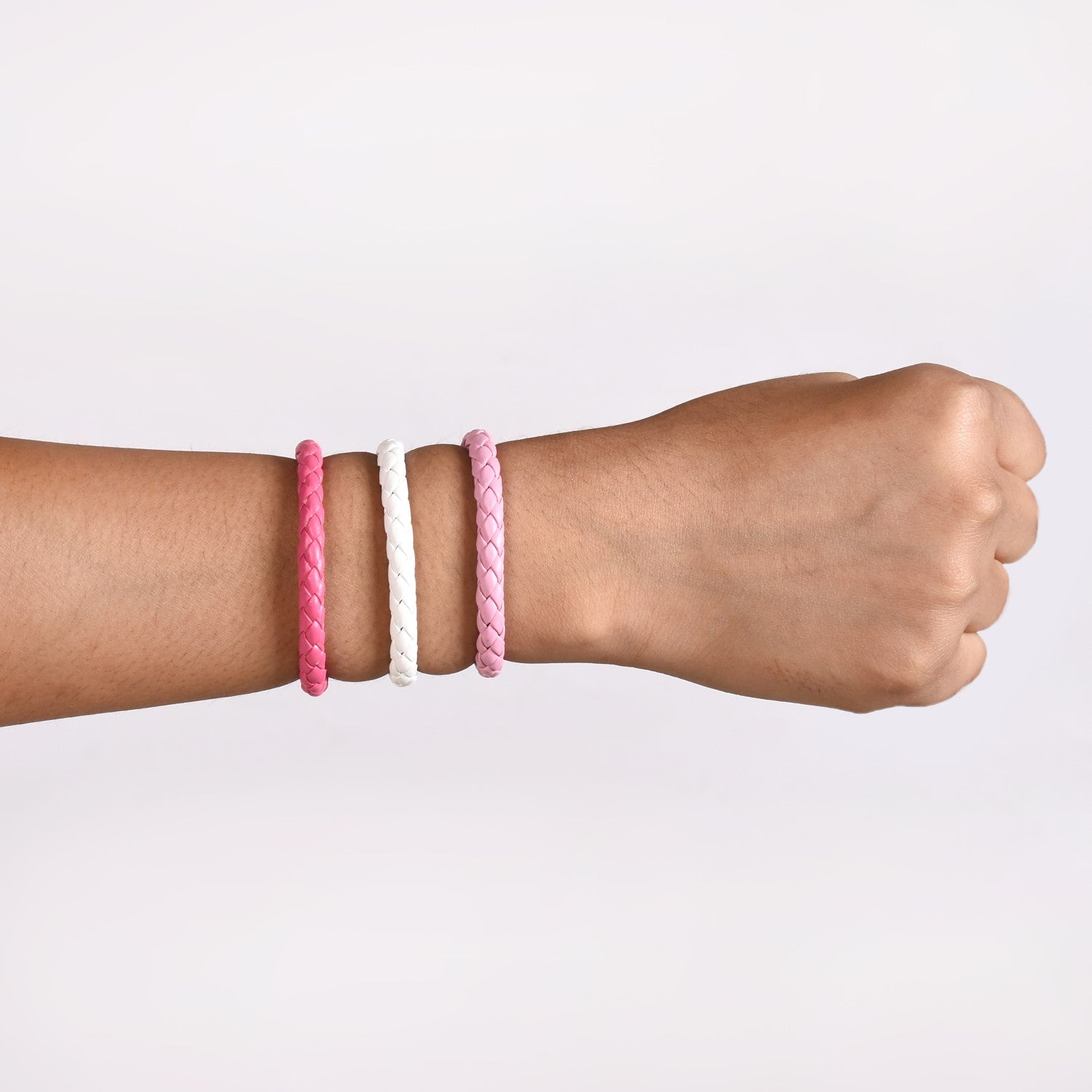 Cherish your girly side with our set of 3 stackable bracelets. Featured in 3 enchanting shades - baby pink, magenta, and white, these simple yet elegant bracelets exemplify the saying, "less is more." Crafted to seamlessly complement every look, these bracelets feature a braided design and come equipped with screw-in bayonet clasps for easy wearing. Rock it with a casual tee and denim shorts or pair it with the best floral dress in your closet, these versatile stacking bracelets will go hand in hand with every look.