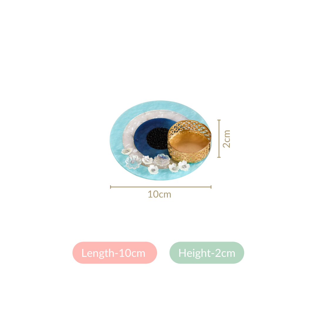 Design: Each tea light holder features a round resin base that resembles an Evil Eye, an ancient symbol that is believed to repel hostile forces and shield your home from all that's evil. Topped with black bugle beads and an opulent golden cup with intricate cutwork and dainty plastic flowers jutting out, these tealight holders exemplify precise craftsmanship.