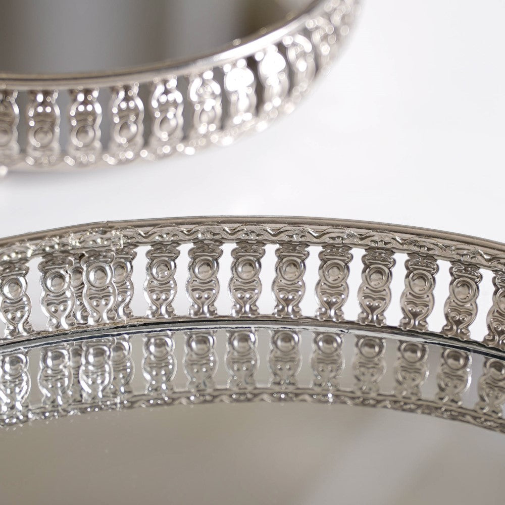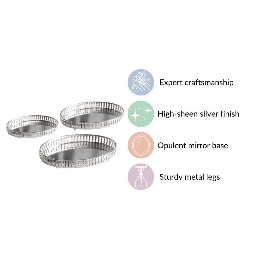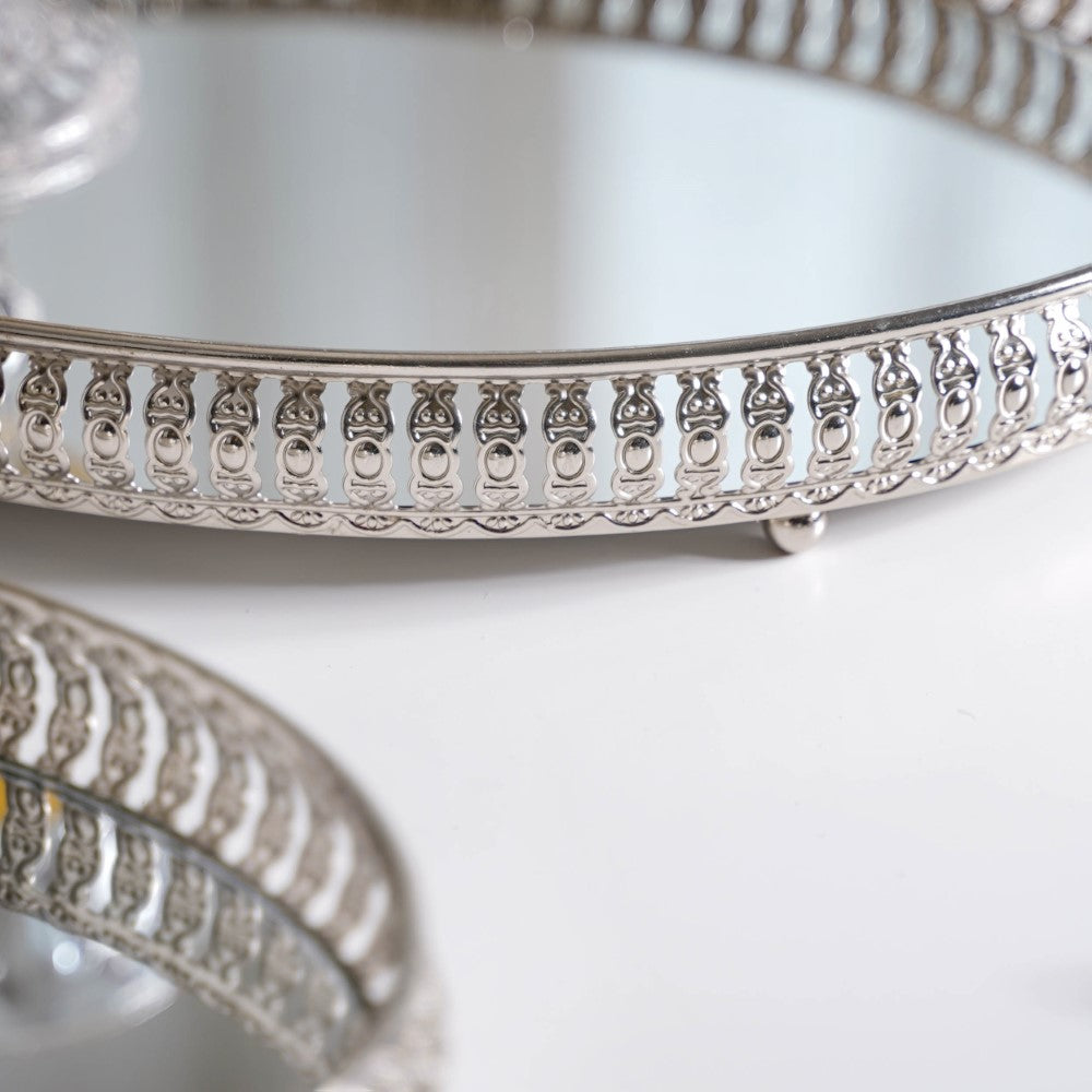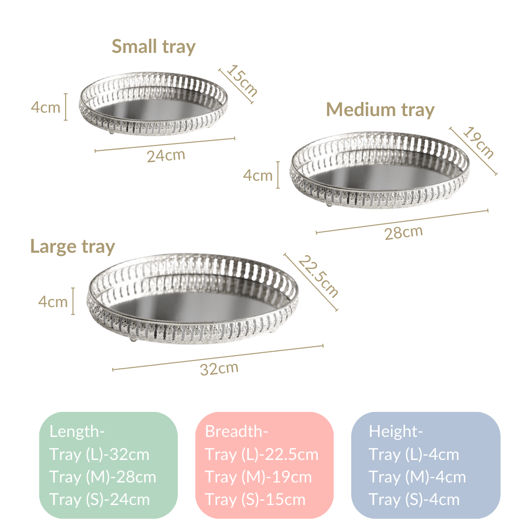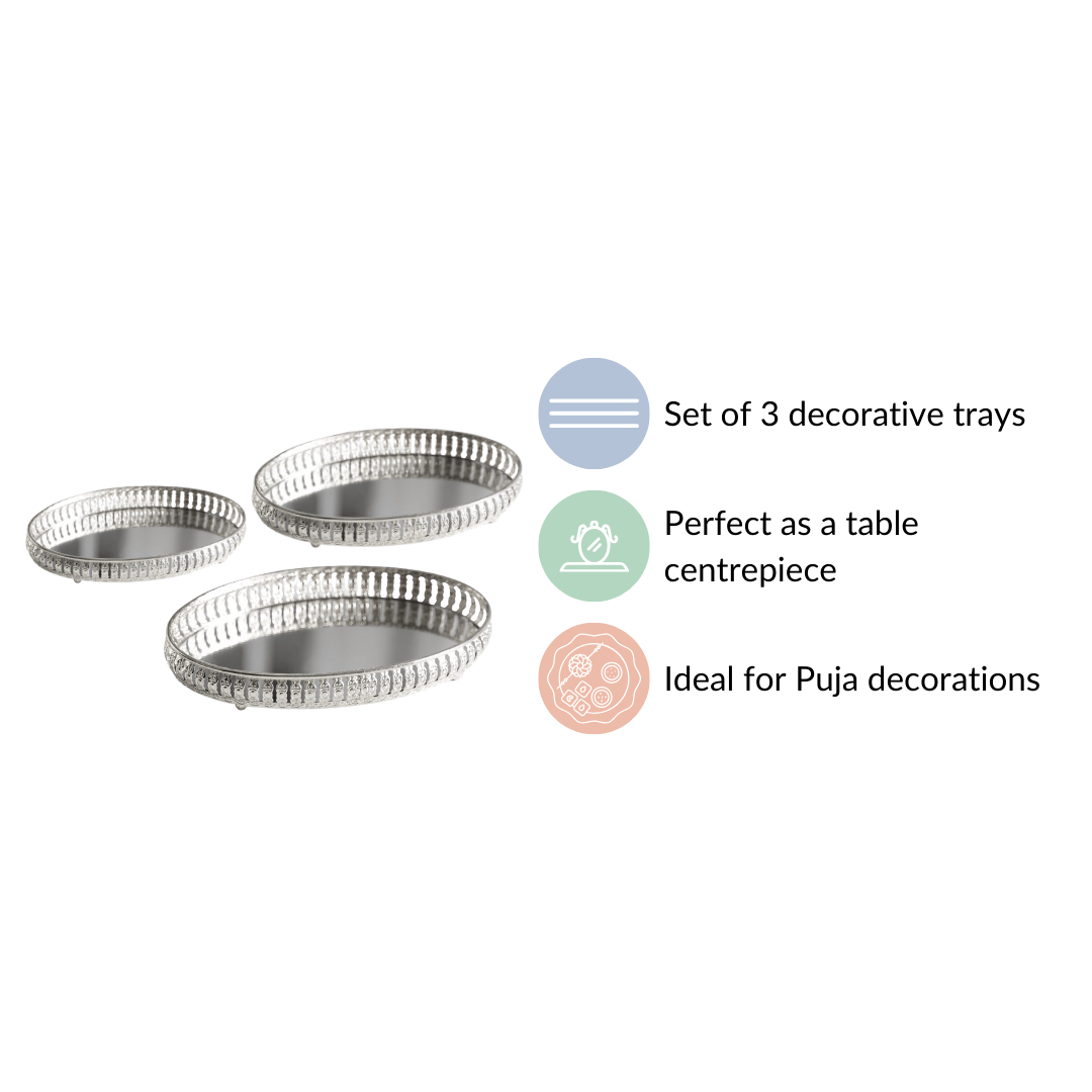 Introducing our set of 3 captivating decorative round mirror trays, a true testament to superior craftsmanship. Designed with premium quality materials, these decorative trays showcase both durability and rust resistance. The elegant rim design and high-sheen silver finish radiate luxury, complemented by the glass mirror base. Supported by sturdy metal legs, this set of 3 metal trays effortlessly combines aesthetics with functionality, making them an ideal choice for enhancing table centrepieces and adding grace to Puja decorations.