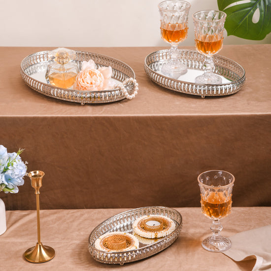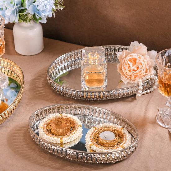 Indulge in opulent decor with our set of 3 oval decorative trays, a harmonious blend of premium glass and rust-resistant metal. Crafted to perfection, these trays feature an elegant rim design and boast a high-sheen silver finish that captivates the eye. The glass mirror base adds an extra layer of allure, while the sturdy metal legs ensure enduring quality. With varying sizes, they make a striking table centrepiece, perfect for curating treasured displays or enhancing your Puja decorations. Elevate your interior aesthetic and functionality effortlessly with this artisanal trio, where exquisite craftsmanship meets timeless appeal. Arrange your decor showpieces or idols of Gods and Goddesses on the decorative trays to add the festive vibe of Diwali to your home.