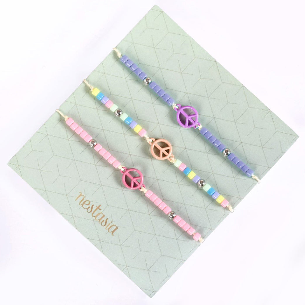 Infuse your wardrobe with a burst of colours and a message of peace, courtesy of our set of 3 stackable bracelets. Featured in lavender, pink, and rainbow colour schemes, each bracelet flaunts a peaceful symbol charm amid an array of glossy, vibrant beads and silver accents. Signifying peace, these bracelets are perfect for elevating your everyday look and spreading positive energy wherever you go. The bright colours and simple design effortlessly uplift both spirits and bring a joyful, eclectic flair to your daily wear.