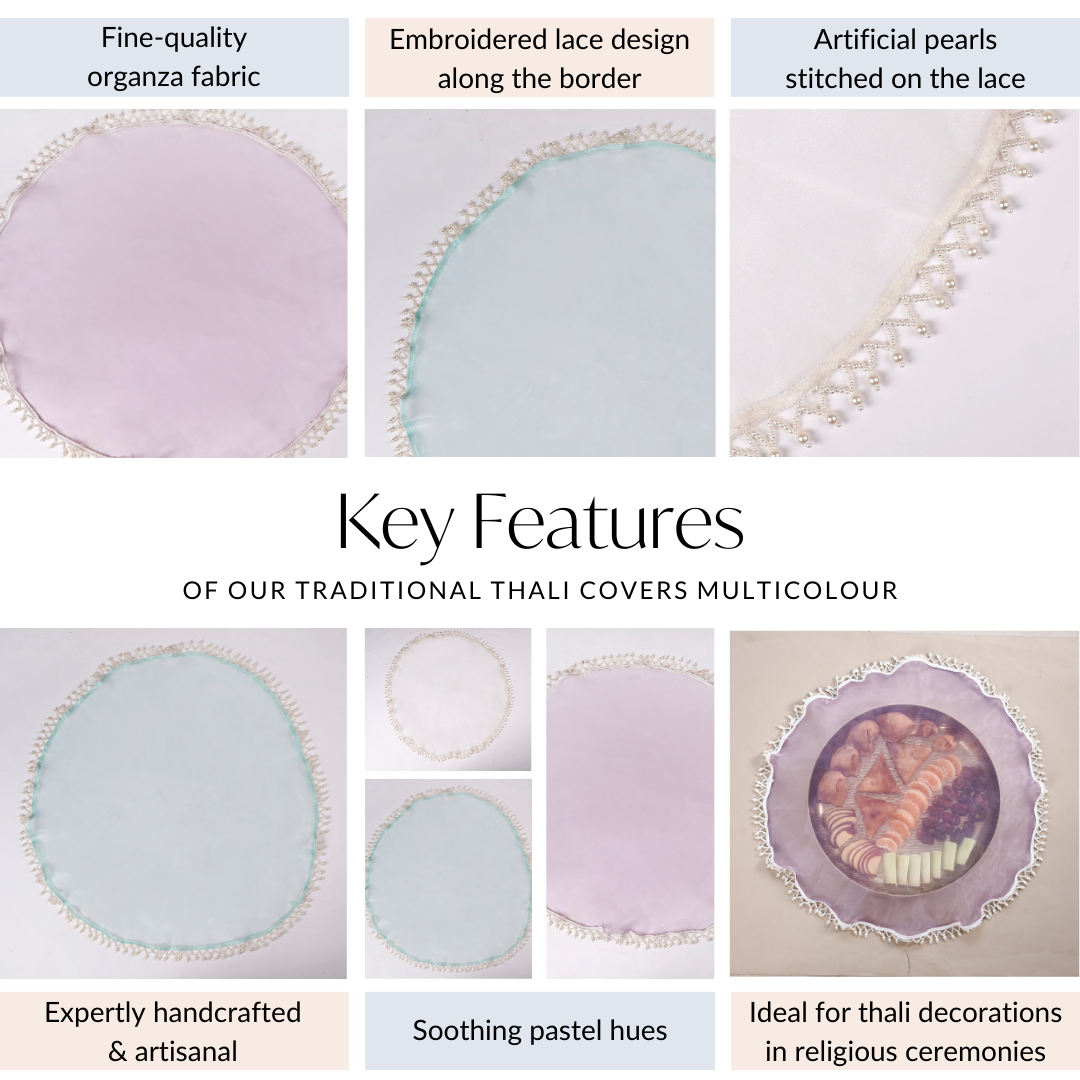 The thali covers are crafted with intricate designs and soothing pastel hues, making them ideal for enhancing the ambience of religious ceremonies such as pujas, aartis, or any auspicious occasion. They add a touch of elegance and reverence to the sacred rituals.