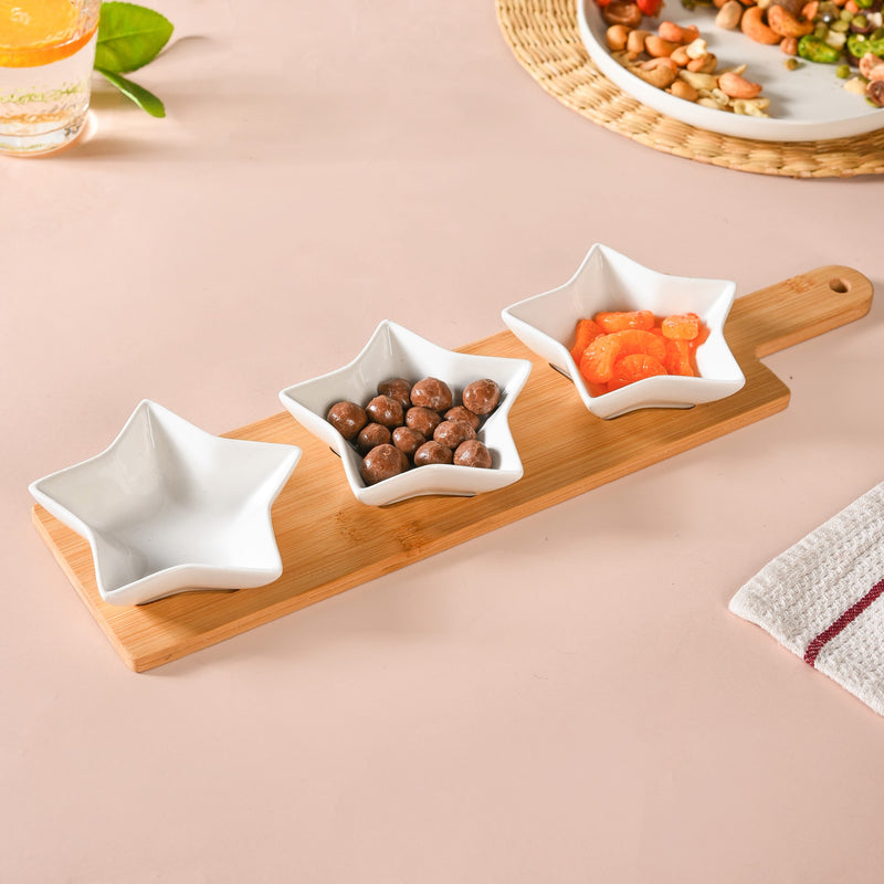 Design: The set features three white, star-shaped ceramic bowls that add a unique flair to any occasion. The bowls rest neatly on a rectangular bamboo tray, designed with easy-grip handles for effortless serving. This blend of contemporary shapes and organic materials offers both practicality and aesthetic appeal.