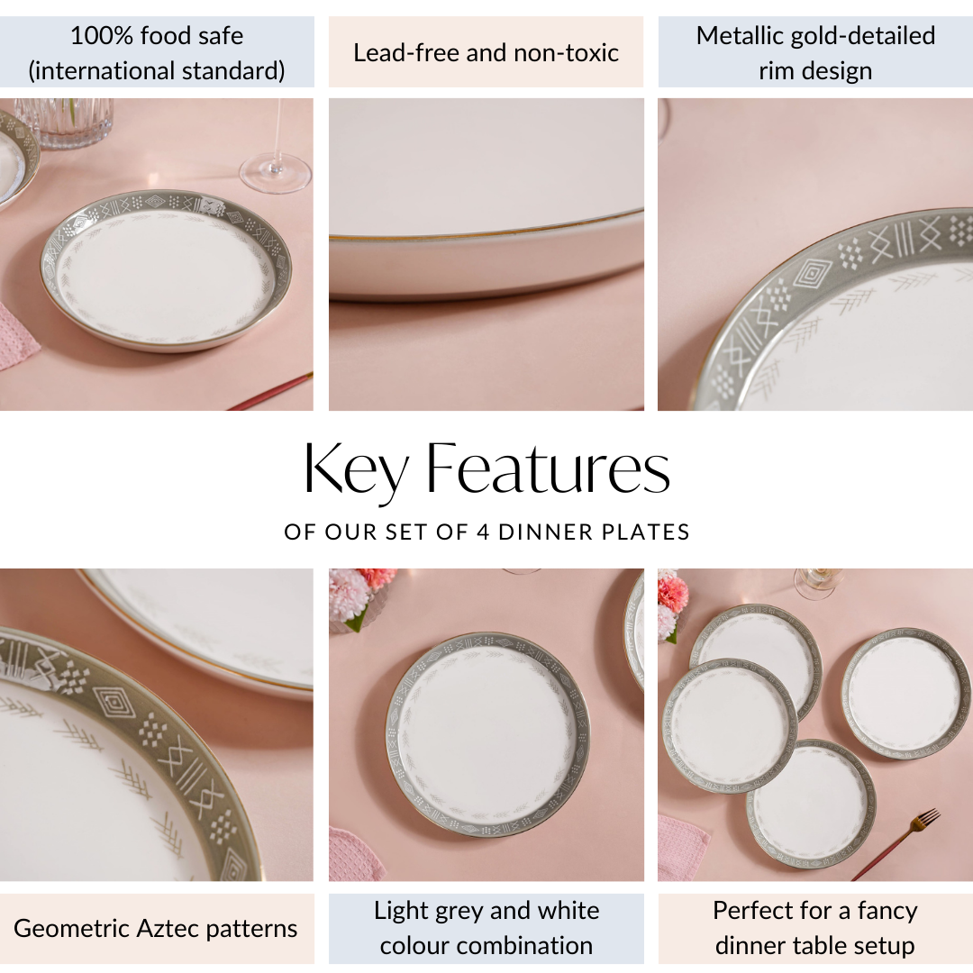 Upgrade your dining experience with our Azo Collection! Elevate your table setting with this set of 4 dinner plates. Crafted from 100% food-safe ceramic, meeting international food-grade standards, they're BPA-free and non-toxic for your peace of mind. Adorned with a sophisticated metallic gold-detailed rim design and captivating geometric Aztec patterns in a chic light grey and white colour combination, these plates are perfect for creating a fancy dinner ambience. Impress your guests with style and substance. Add the Azo grey dinner plates to your dinnerware collection today!