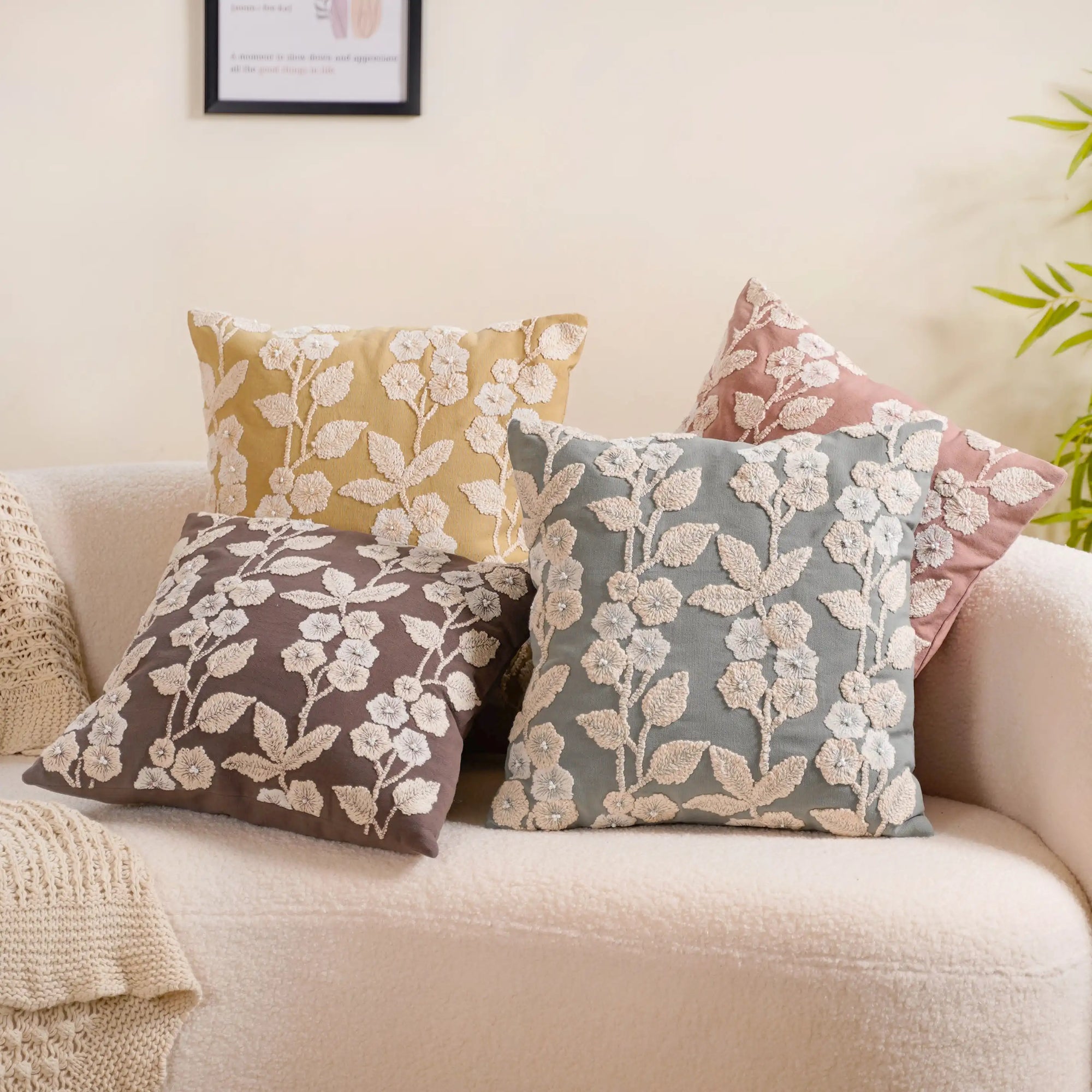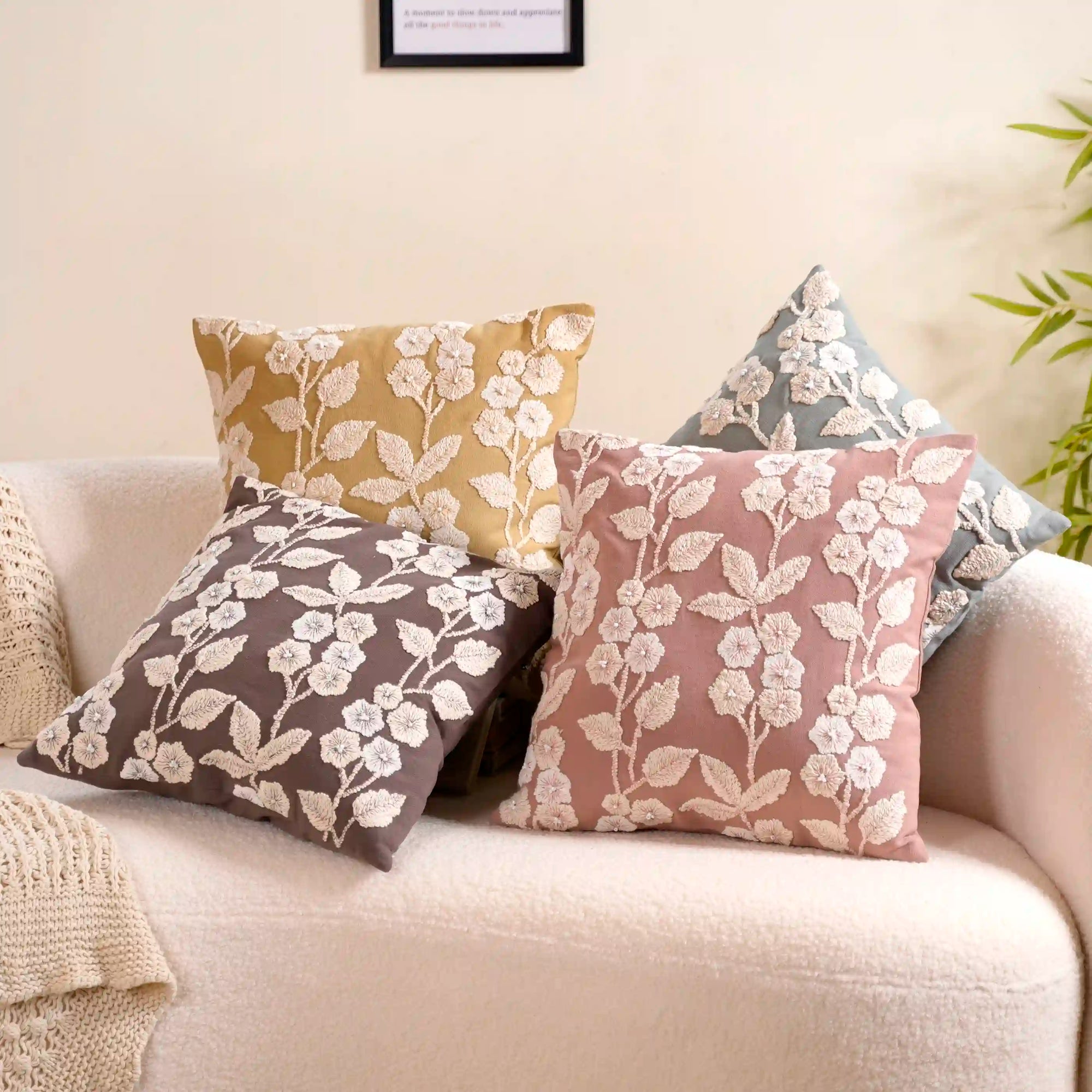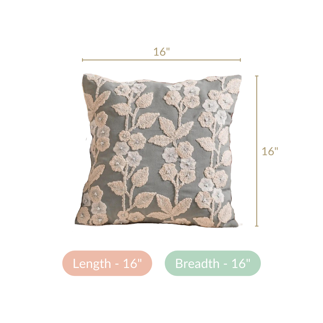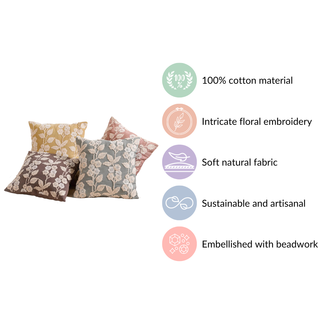 These cushion covers stand out due to their exceptional features. Crafted from 100% cotton, they epitomize quality, utility, and beauty (QUB) with intricate floral embroidery. The soft, natural fabric ensures comfort, and their sustainable, artisanal production reflects environmental consciousness. The smooth concealed zipper adds convenience, making them a perfect fit for both sofas and couches. This set of 4 cushion covers is not only an ideal personal indulgence but also a thoughtful gift choice due to their high-quality craftsmanship.