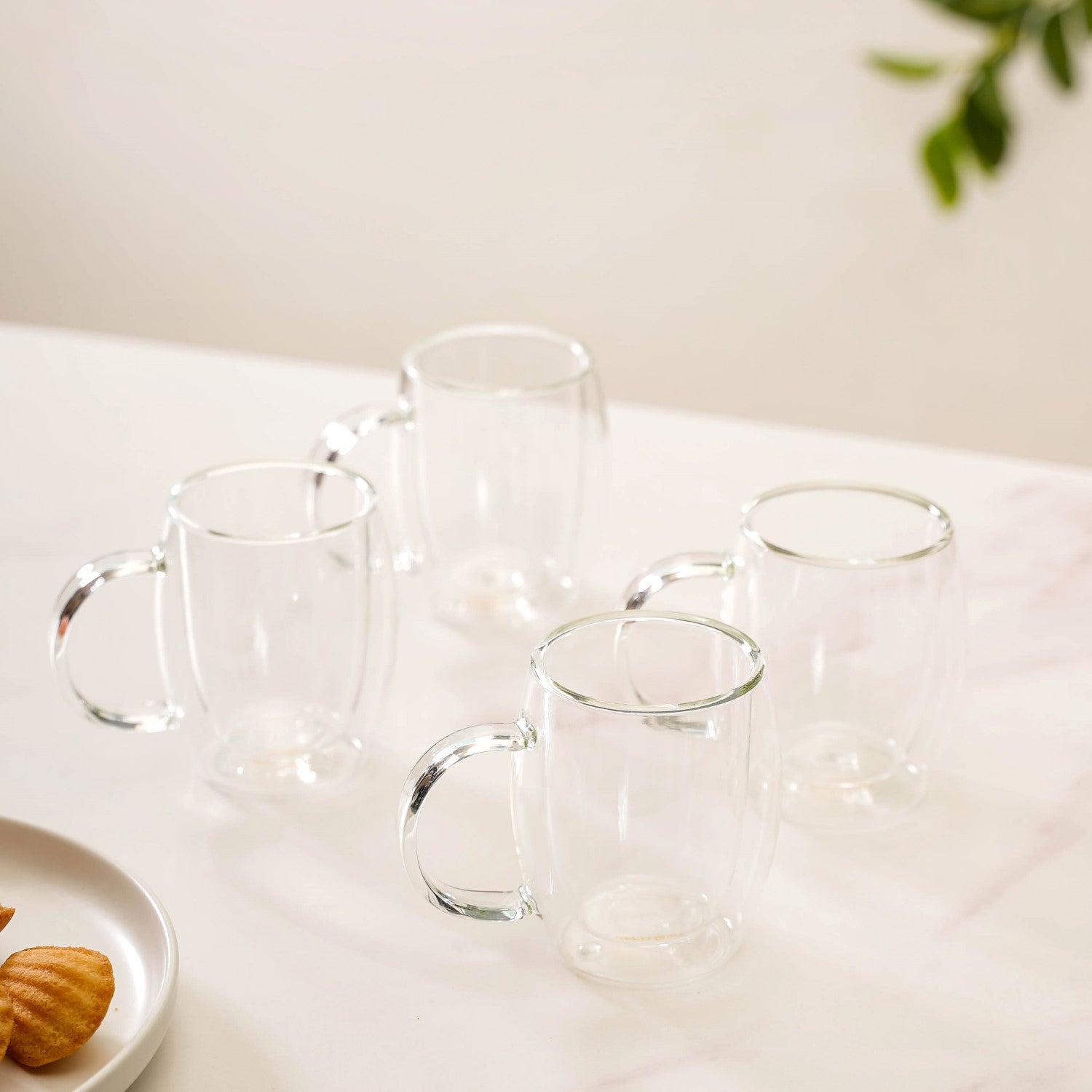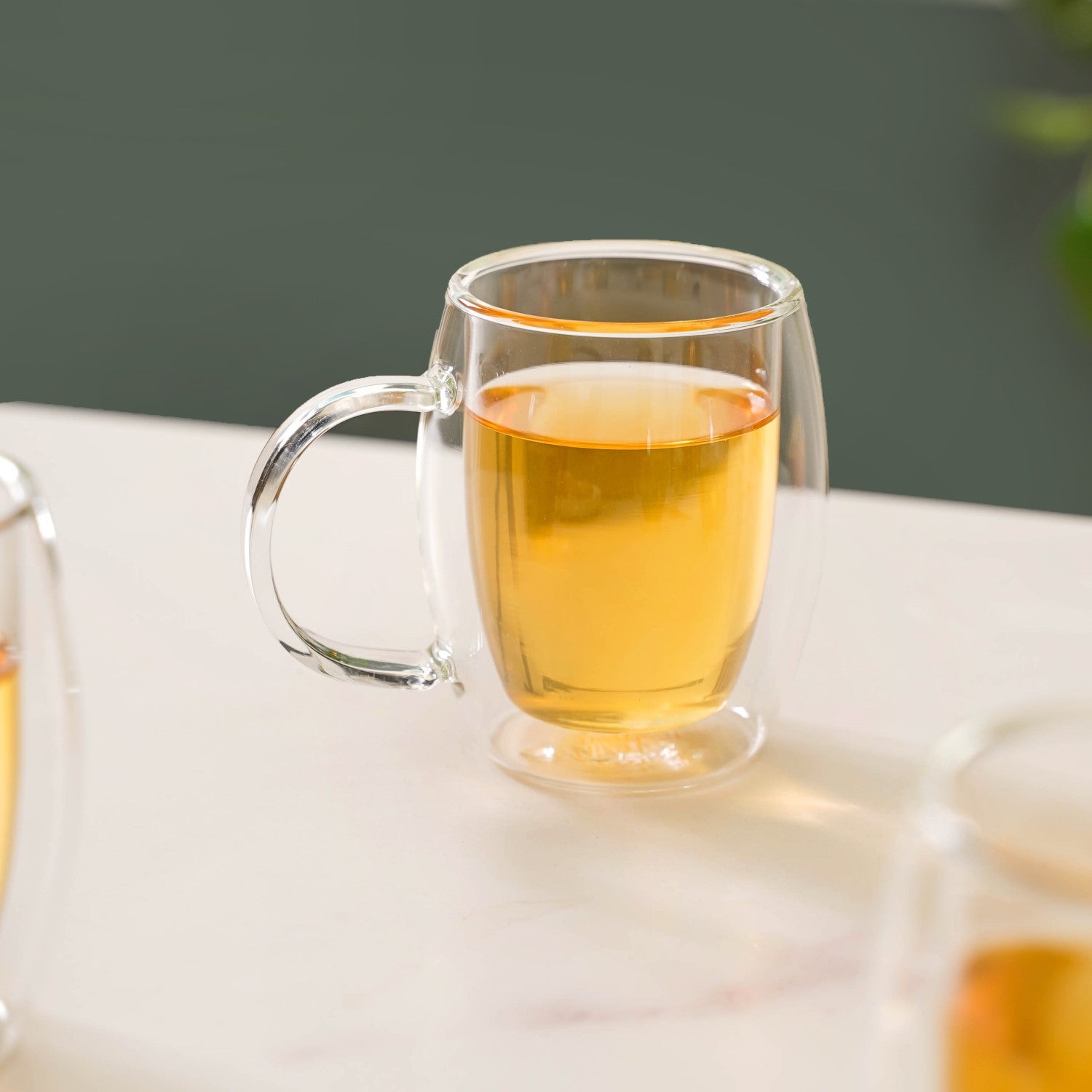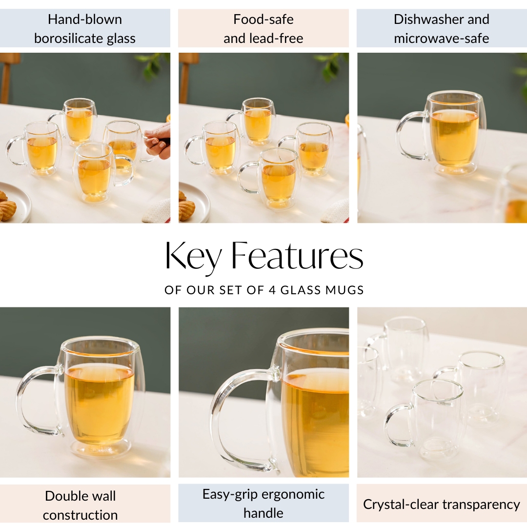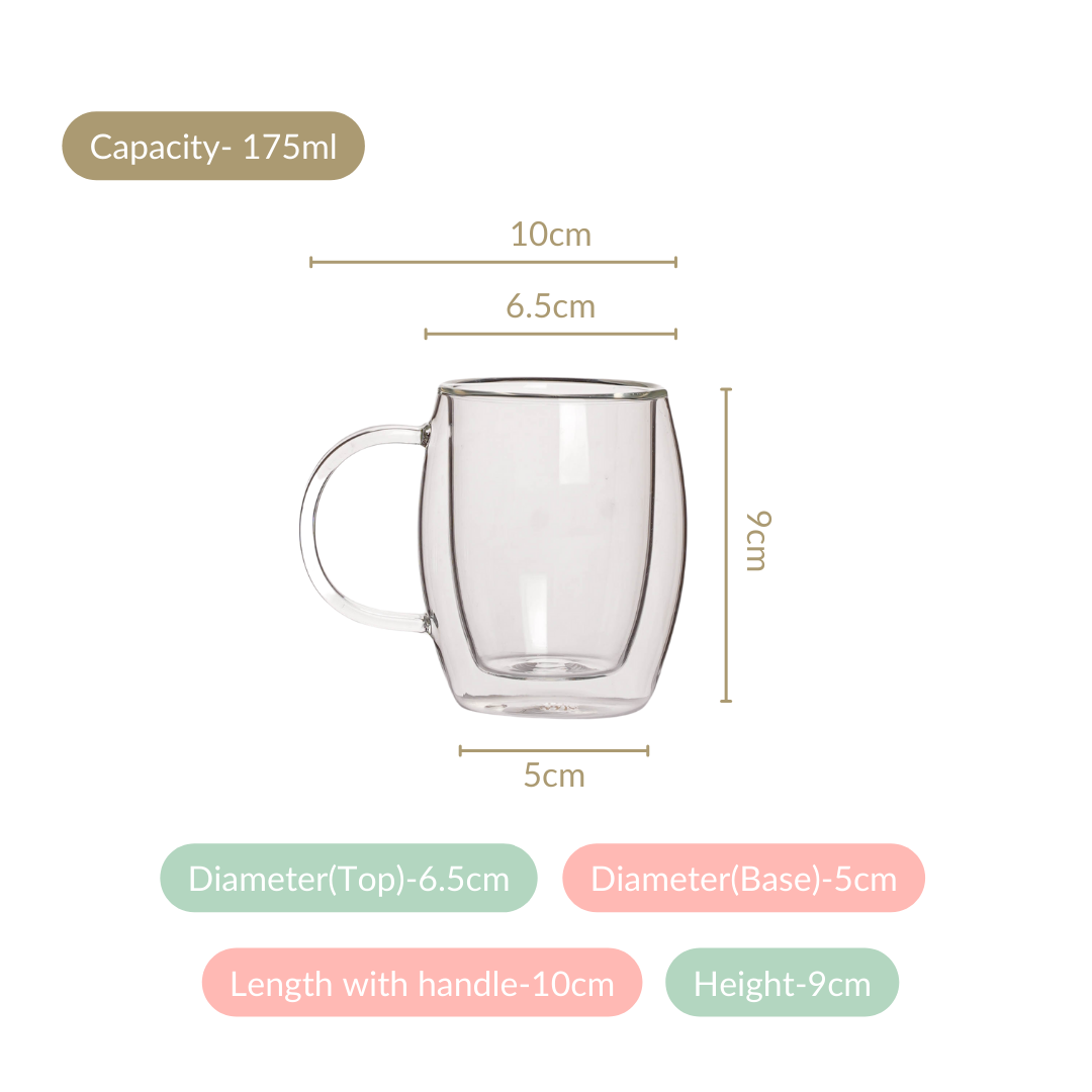 Design: Featuring an easy-grip ergonomic handle and double-walled construction, these glass coffee mugs ensure comfort and effective insulation. The crystal-clear transparency further enhances their appeal, allowing you to appreciate the beauty of your drinks.