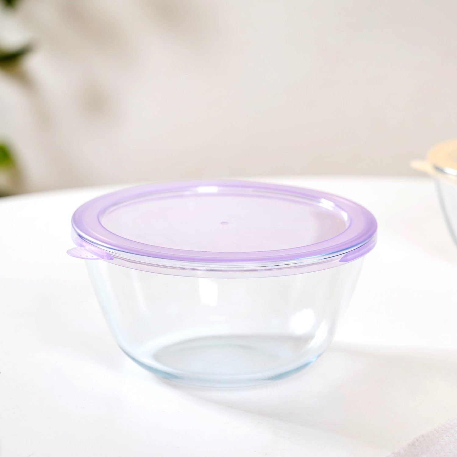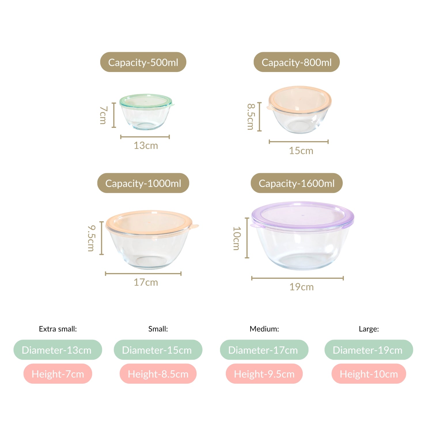 Size: XS - 13cm D x 7cm H S - 15cm D x 8.5cm H M - 17cm D x 9.5cm H L - 19cm D x 10cm H Capacity: XS - 500ml S - 800ml M - 1000ml L - 1600ml Colour: Transparent, green, peach, yellow, purple Material: High borosilicate glass, Polypropylene (PP)
