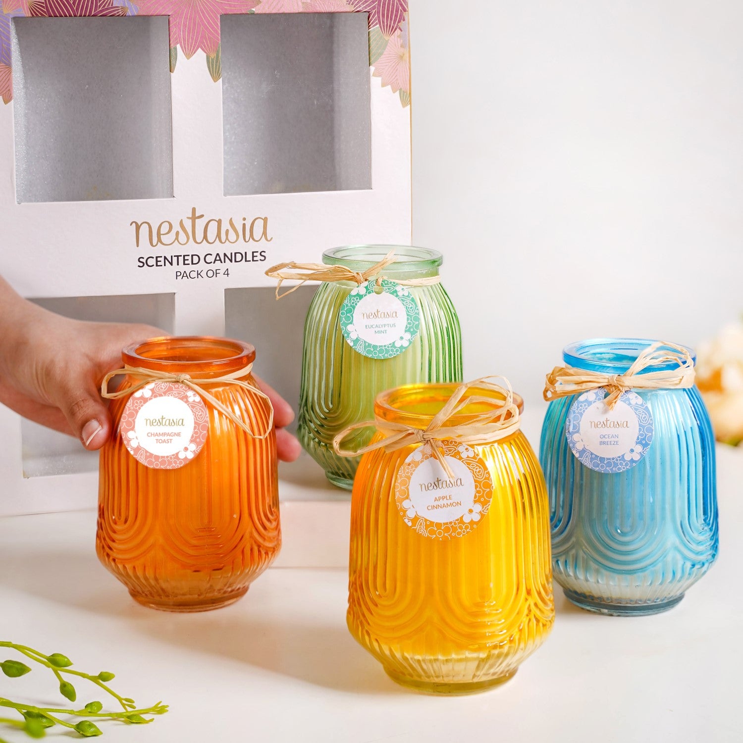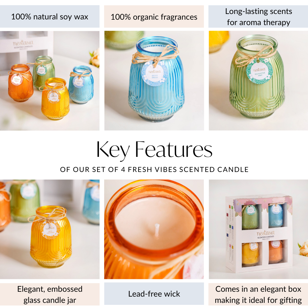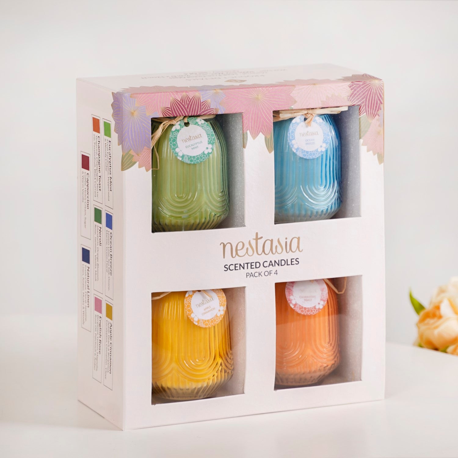 Bring a calming warmth into your home with this set of four scented candles. Made from natural wax, each organic scented candle combines beautiful scents with a stylish look.