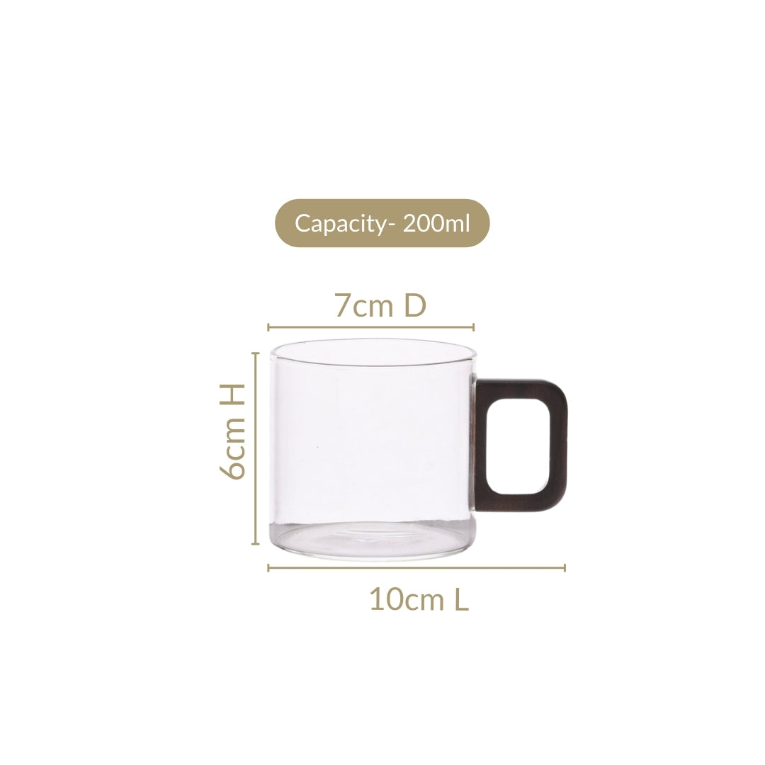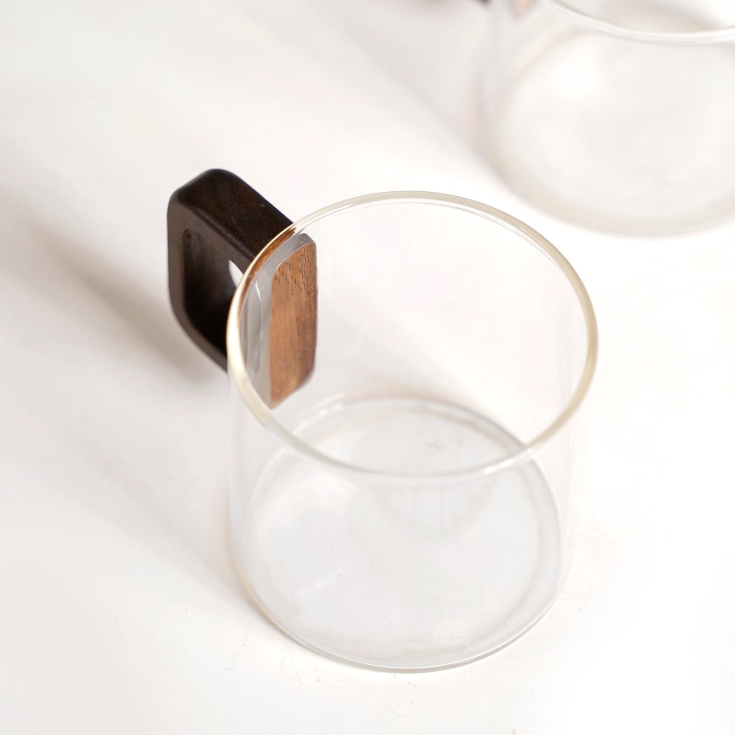 Design: Each espresso cup in this set features a sleek, cylindrical body made of clear high borosilicate glass. The minimalist design ensures that the beverage inside is the centre of attention, making it ideal for showcasing coffee, tea, or layered drinks. The wooden handle is crafted from dark-toned wood, offering a warm contrast to the cool transparency of the glass. Its rectangular frame with curved corners provides a comfortable grip, while the flat base and uniform rim ensure stability and a clean aesthetic. This combination of glass and wood gives the set a sophisticated Scandinavian or Japanese-inspired vibe, perfect for modern homes.