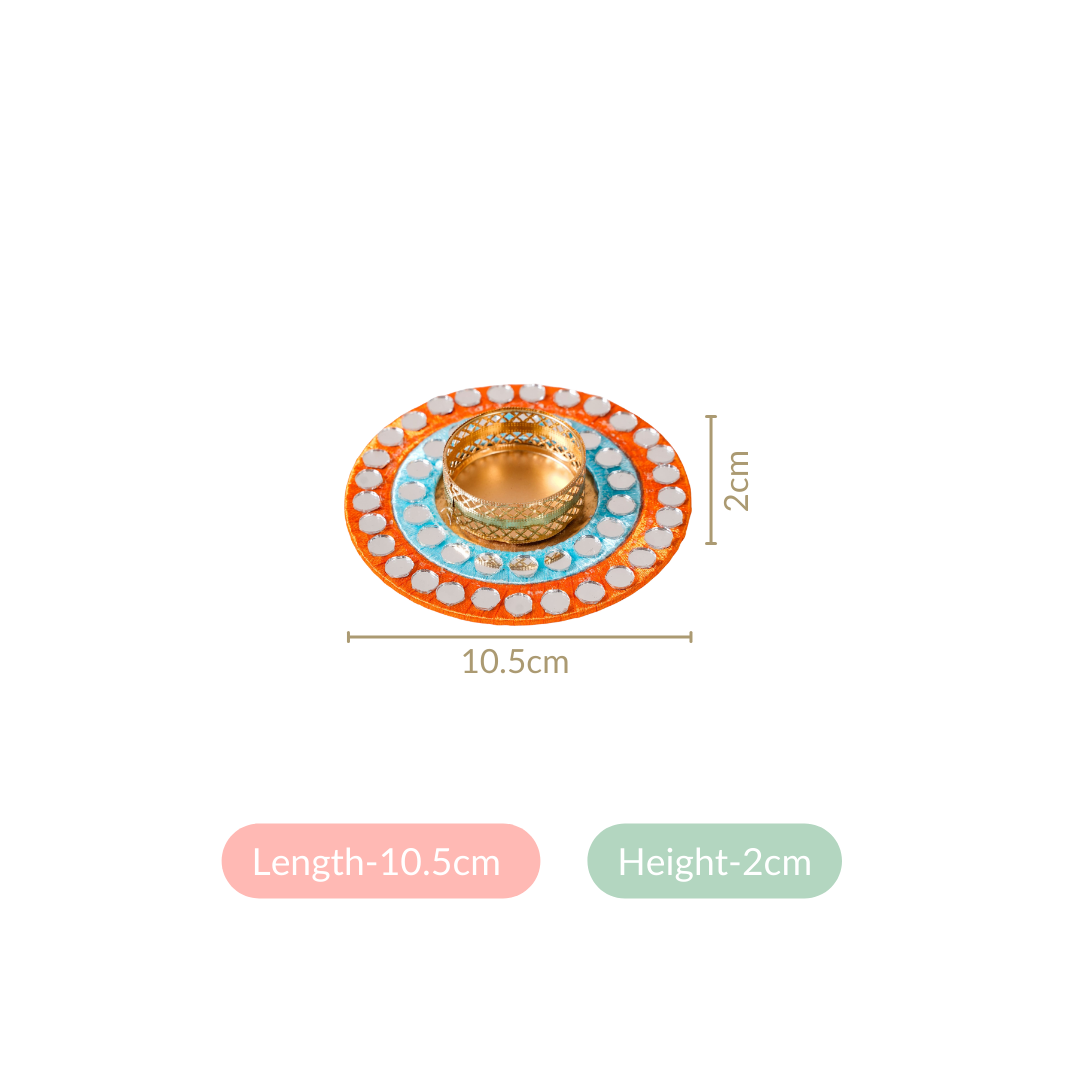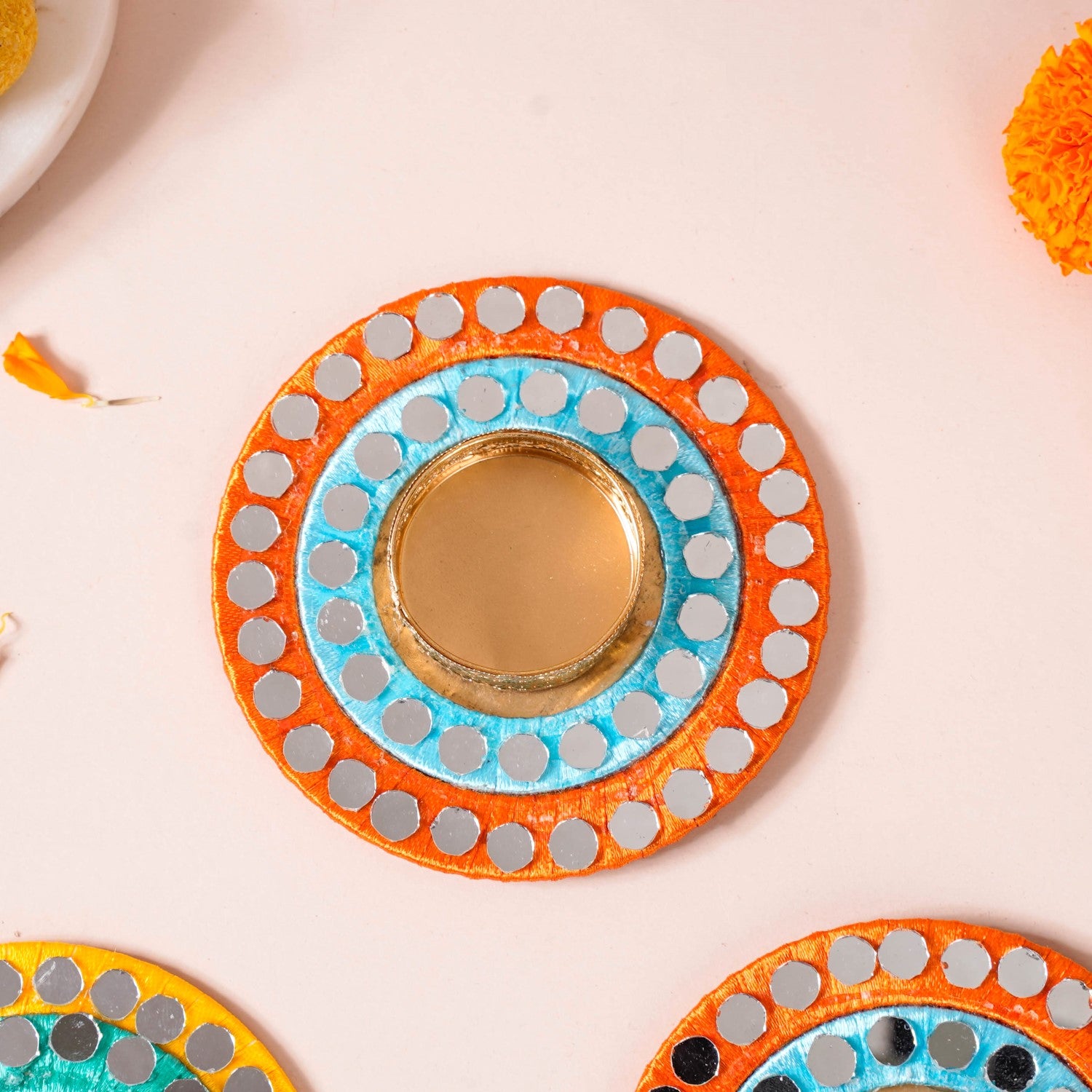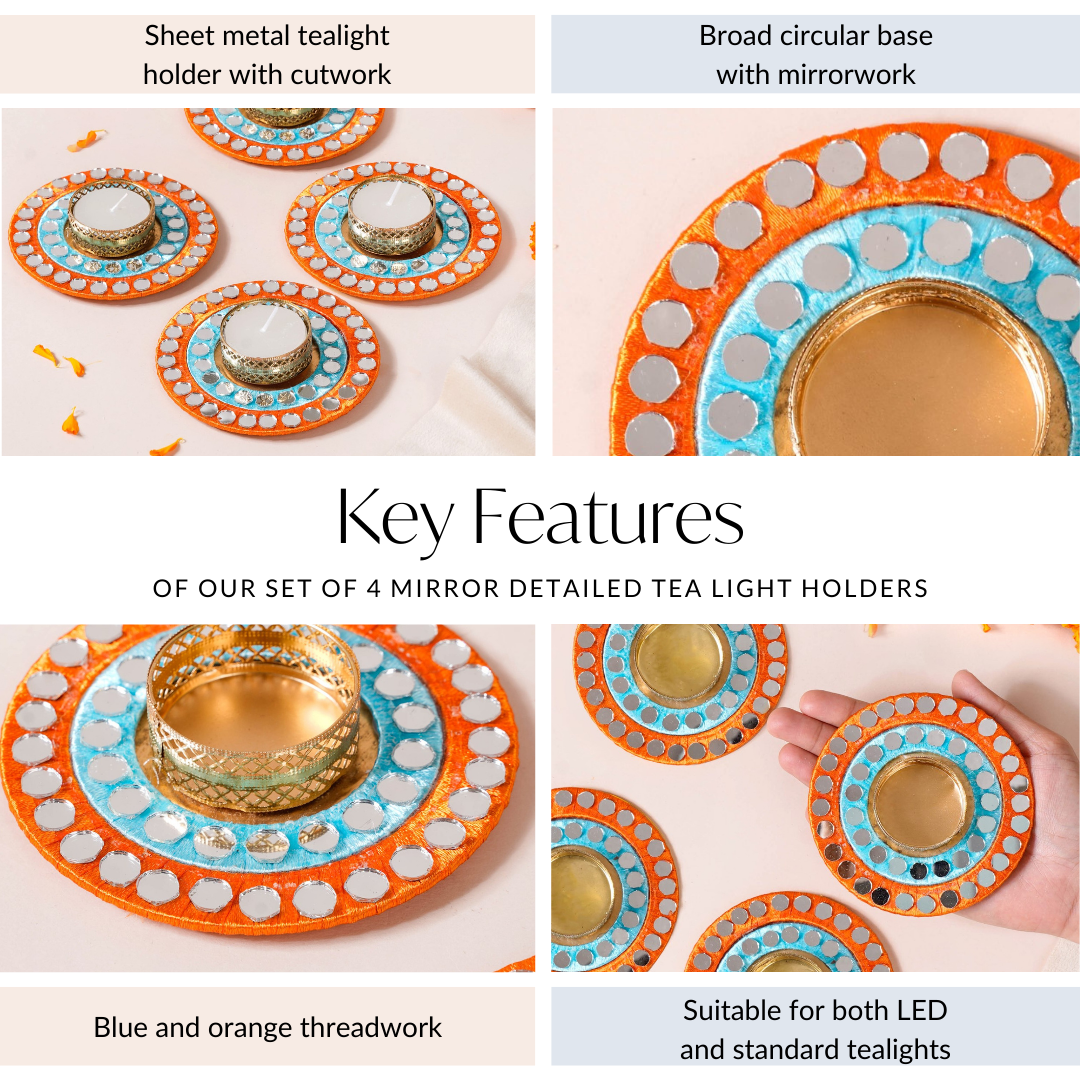 Design: Boasting a circular base with vibrant orange and blue threadwork, these candle holders are designed to add refreshing pops of colour to your decor setup. The thin metal cup with intricate cutwork further enhances the aesthetics of the tea light holders. Adorned with sparkly mirrorwork that reflects light and amps up the glow, these beauties make your space beam with radiance.