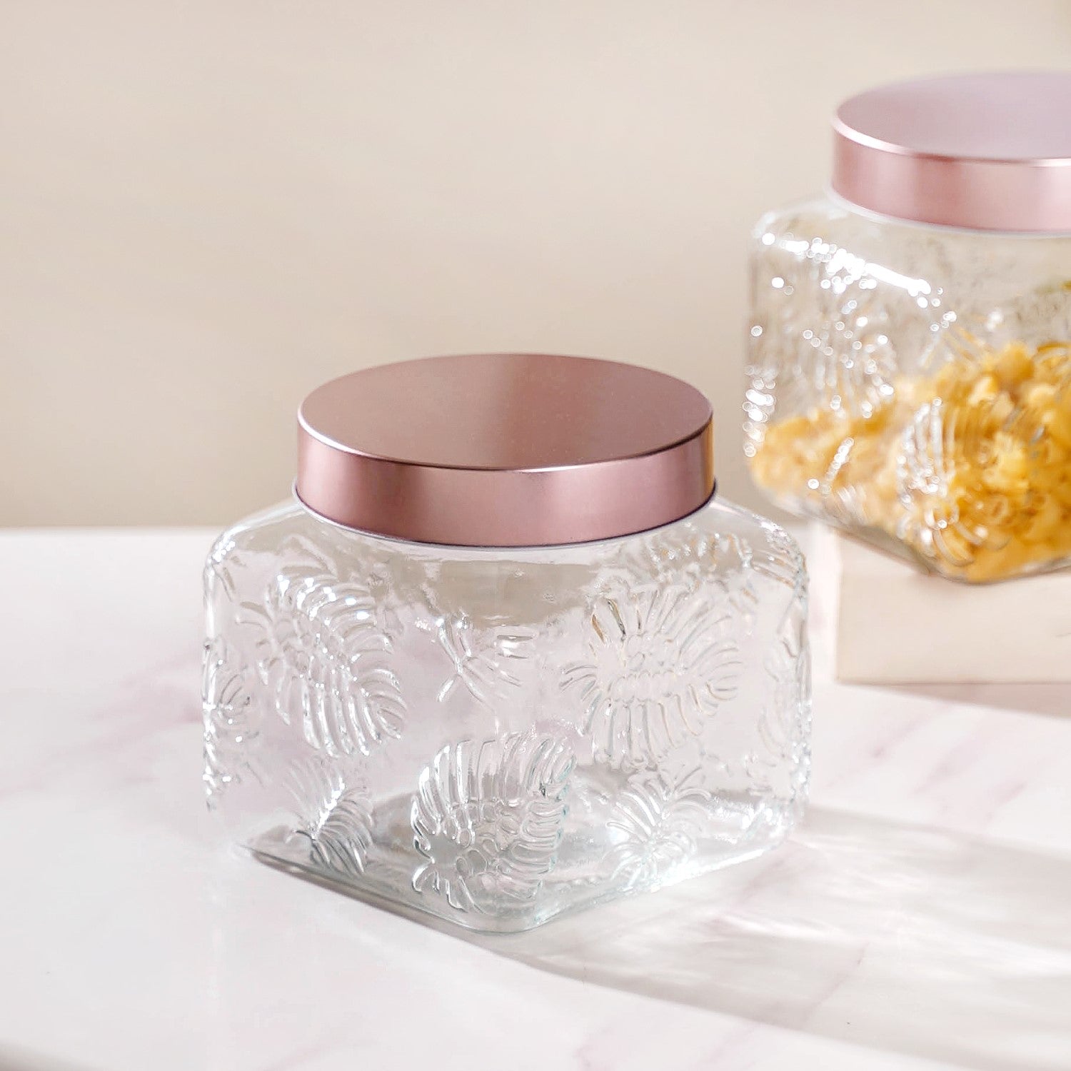 Certainly! These exquisite glass jars, adorned with eye-catching Monstera leaf textures and rose gold lids, make for a delightful present for loved ones. The airtight feature offers unmatched practicality, making the set suitable for gifting on a range of occasions.