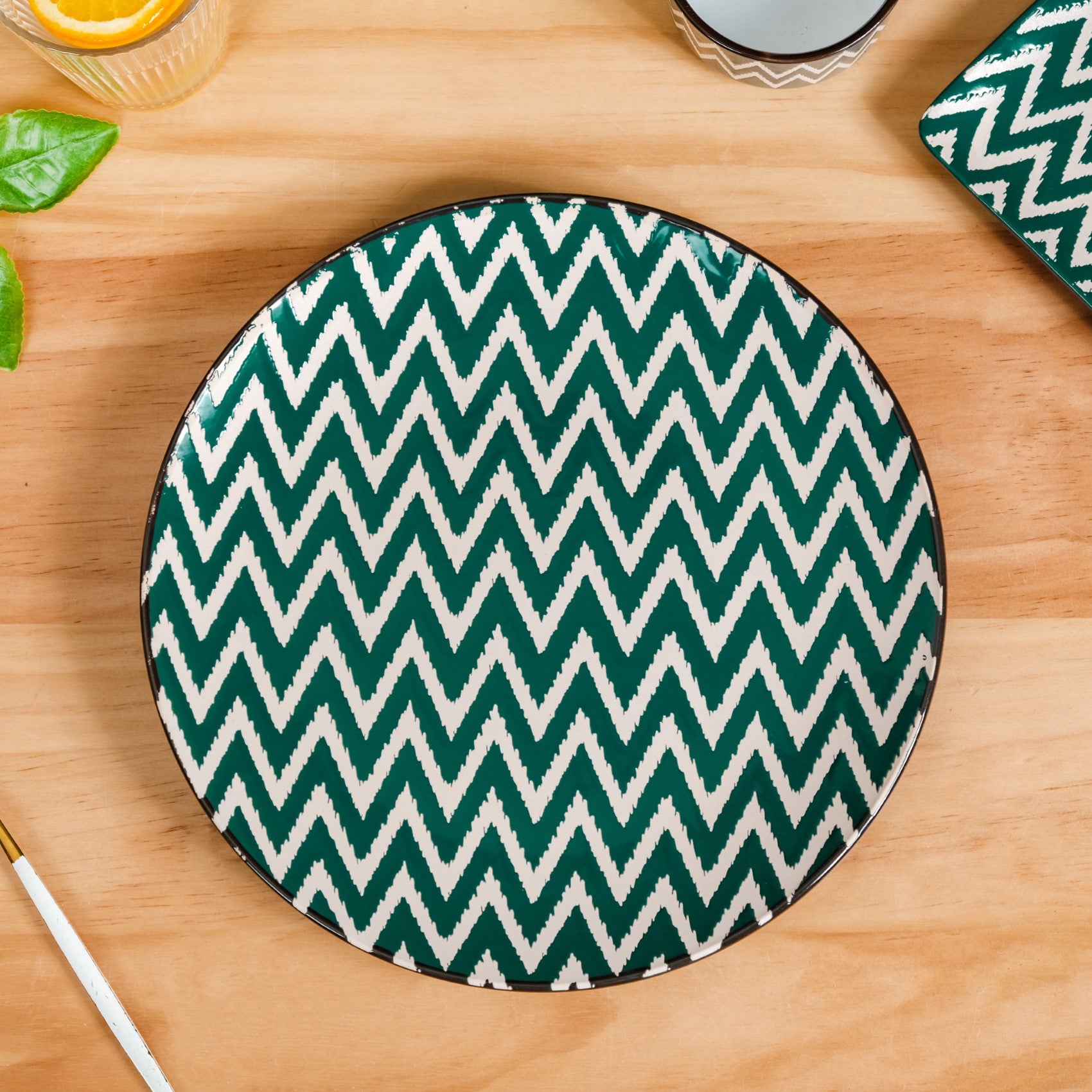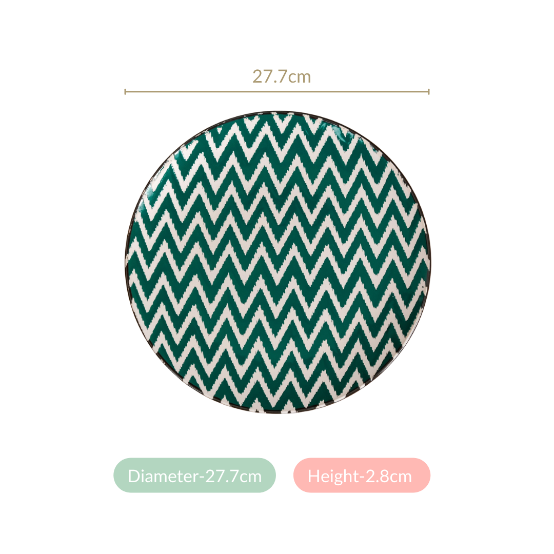 Design: Embrace timeless style with these classic round plates, showcasing a bold dark green and white zigzag pattern. The design effortlessly blends modern chic with a touch of tradition, making these plates a versatile choice for both everyday dining and special gatherings.