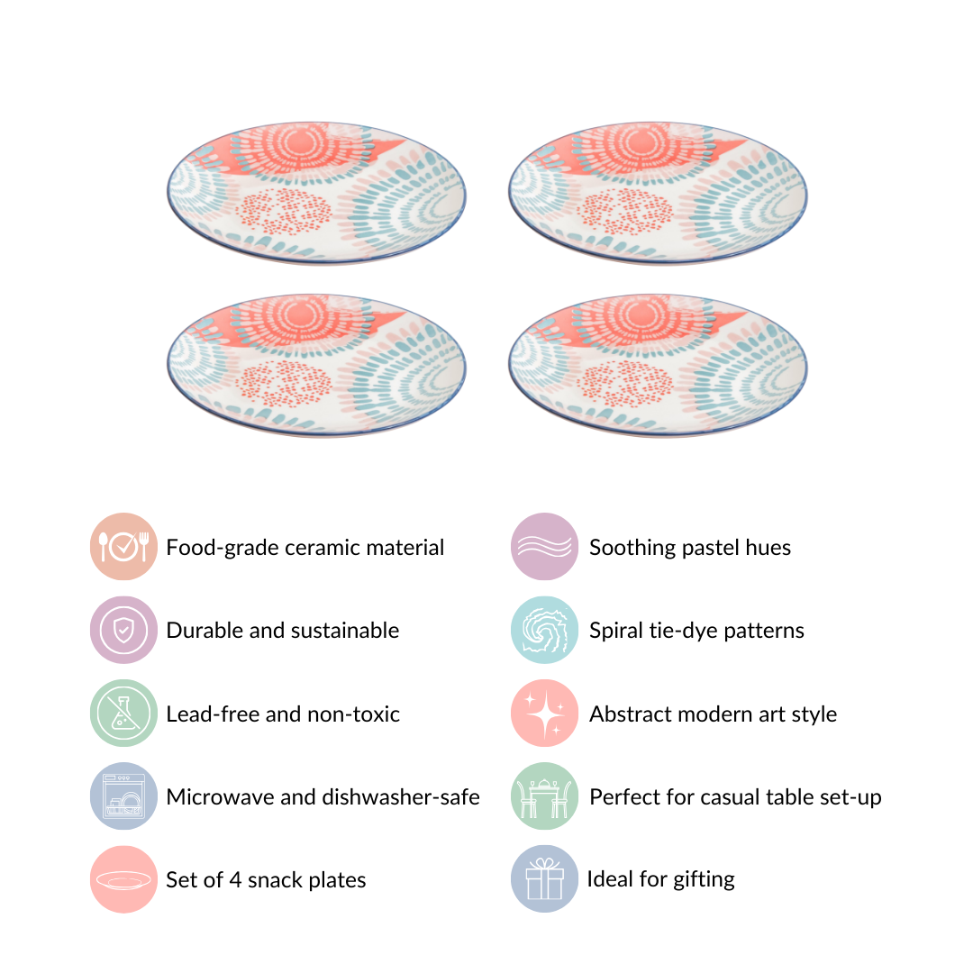Yes, the ceramic snack plates can double as stylish decorative pieces when not in use. Their captivating design, featuring unique spiral tie-dye patterns in soothing pastel hues, adds a touch of elegance to any room or dining area.