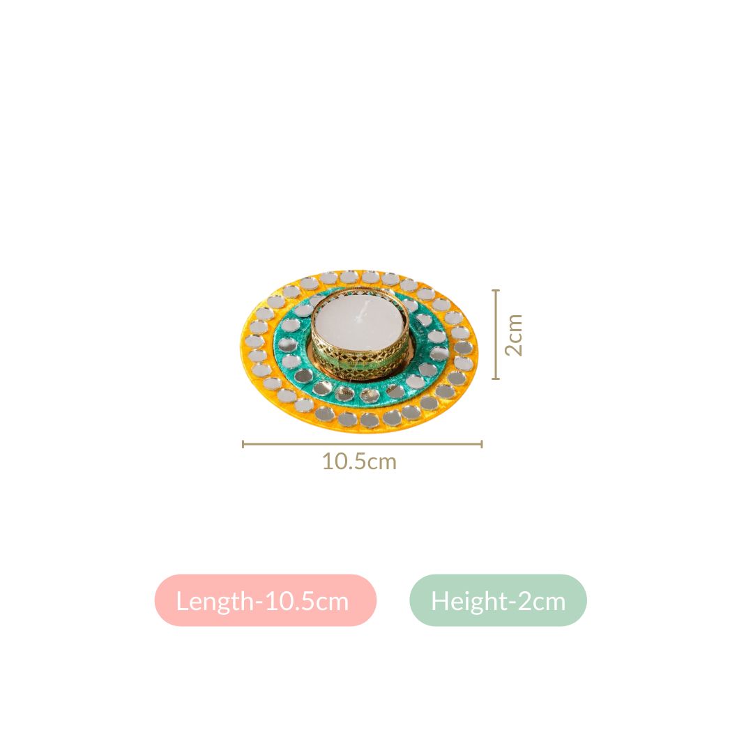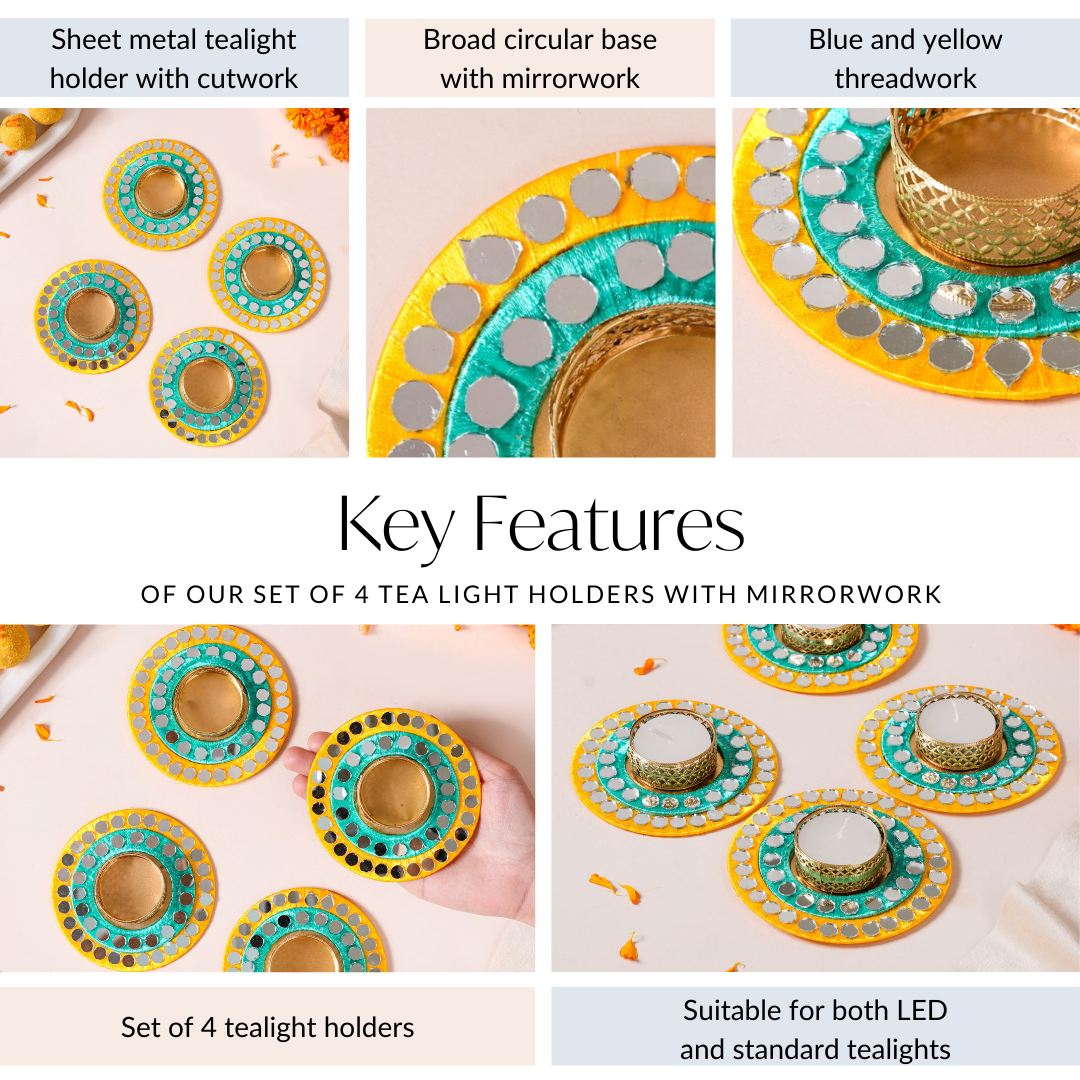 Design: Each candle holder features a broad circular base with concentric yellow and blue threadwork. Complemented by exquisite mirrorwork that reflects light and intensely brightens your space, these tea light candle holders are a work of art. Complete with an opulent sheet metal case with intricate cutwork, these little gems are perfect for illuminating your home with warmth and radiance.
