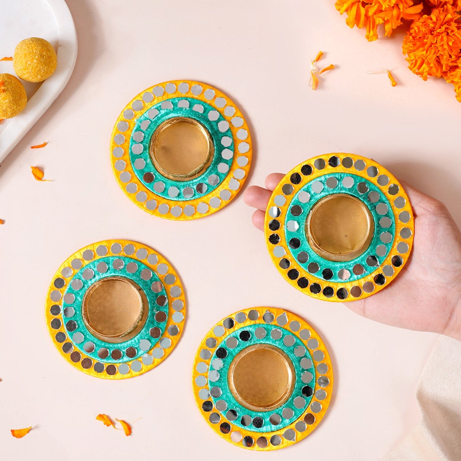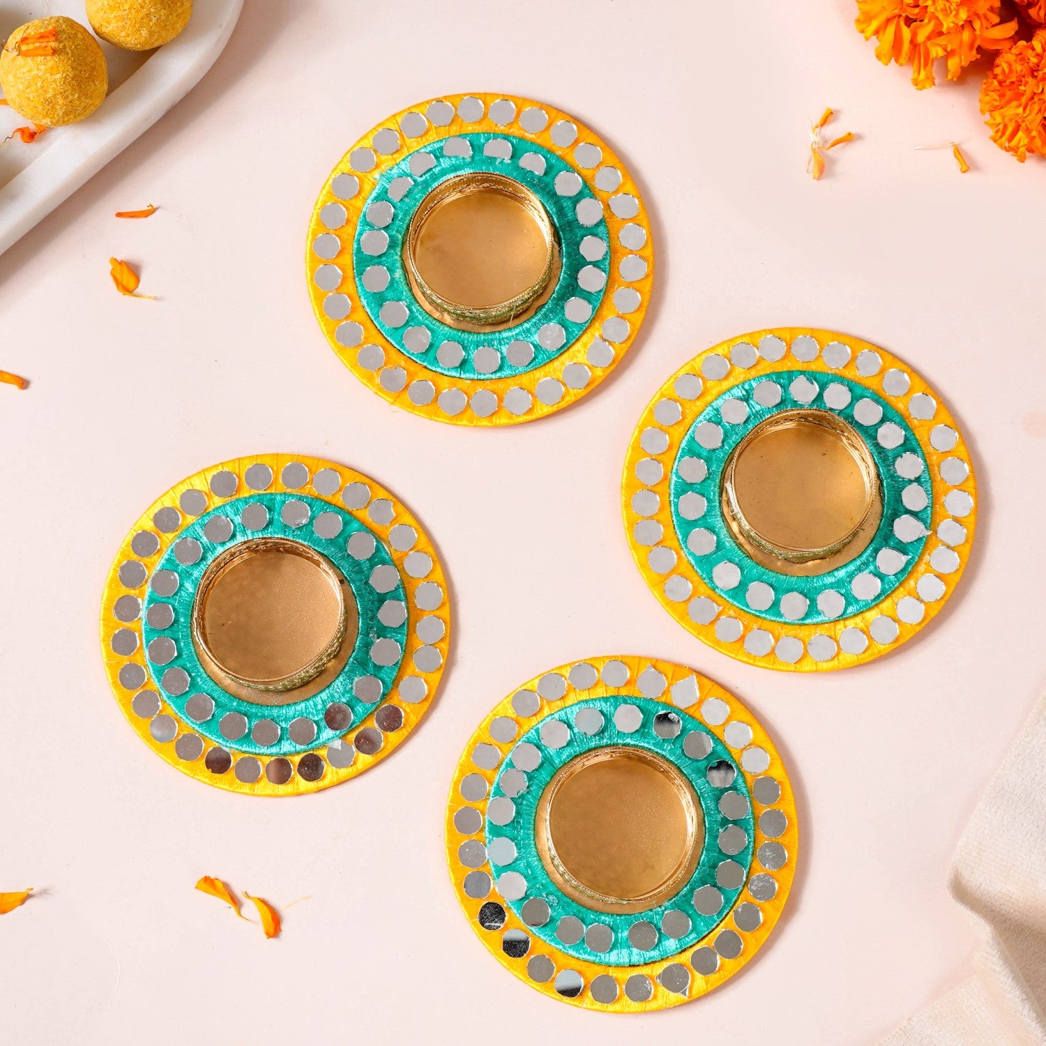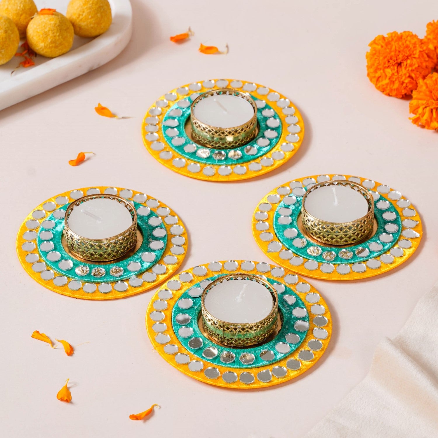 Set Of 4 Tea Light Holders With Mirrorwork