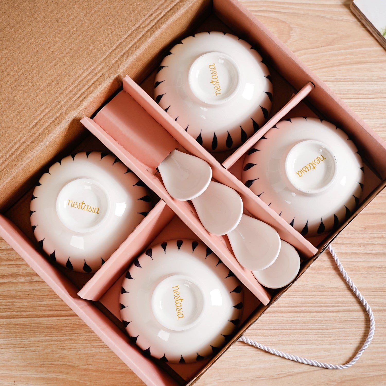 Design: Crafted from smooth white ceramic, these soup bowls are adorned with a striking blue teardrop design and complemented by dark brown rims, giving them a fresh, modern feel. The gently raised footed base adds a subtle lift, providing both stability and elegance. The matching ceramic spoons boast a wide, inviting scoop, with a brown-rimmed handle that feels comfortable in your hand. The handle is delicately decorated with a teardrop design, and a small hole at the edge offers the perfect touch of practicality for easy hanging when not in use.
