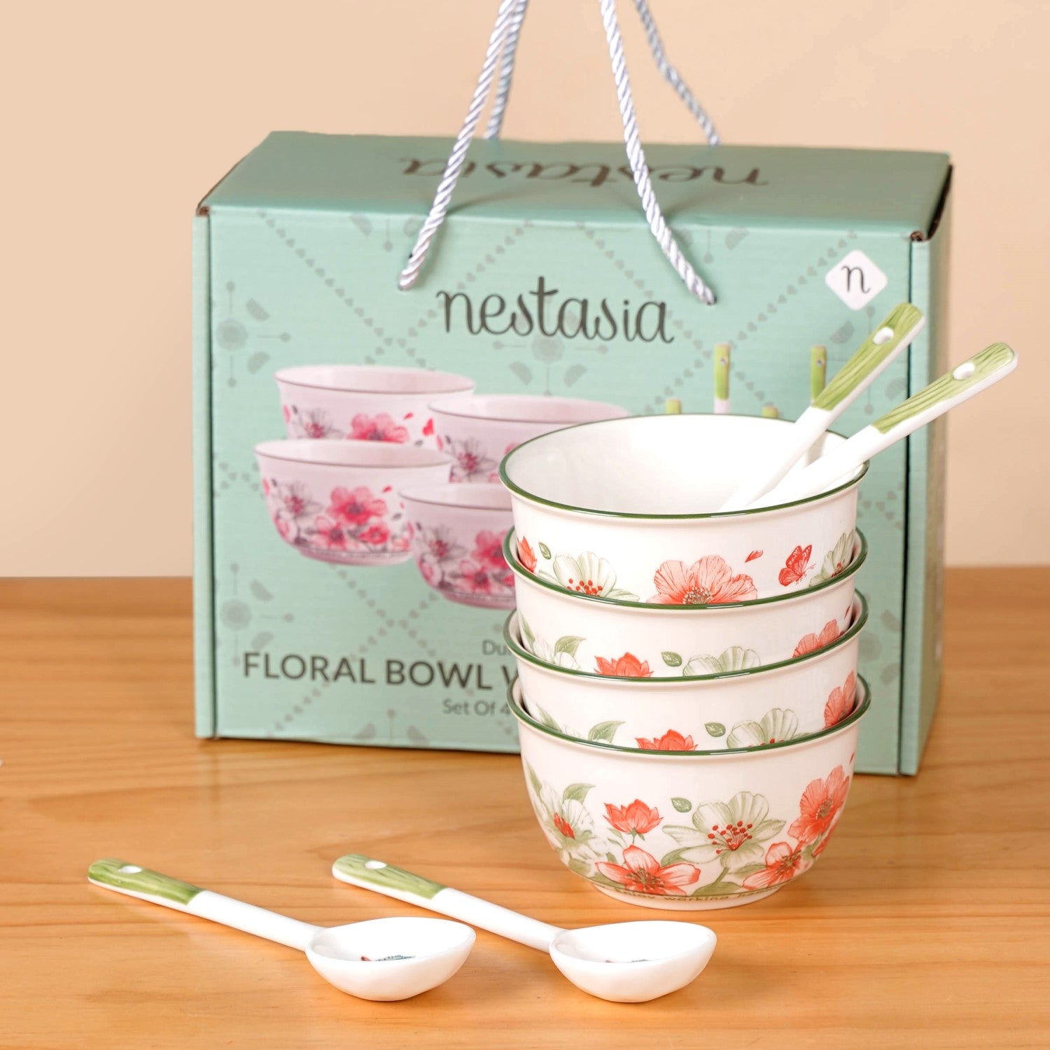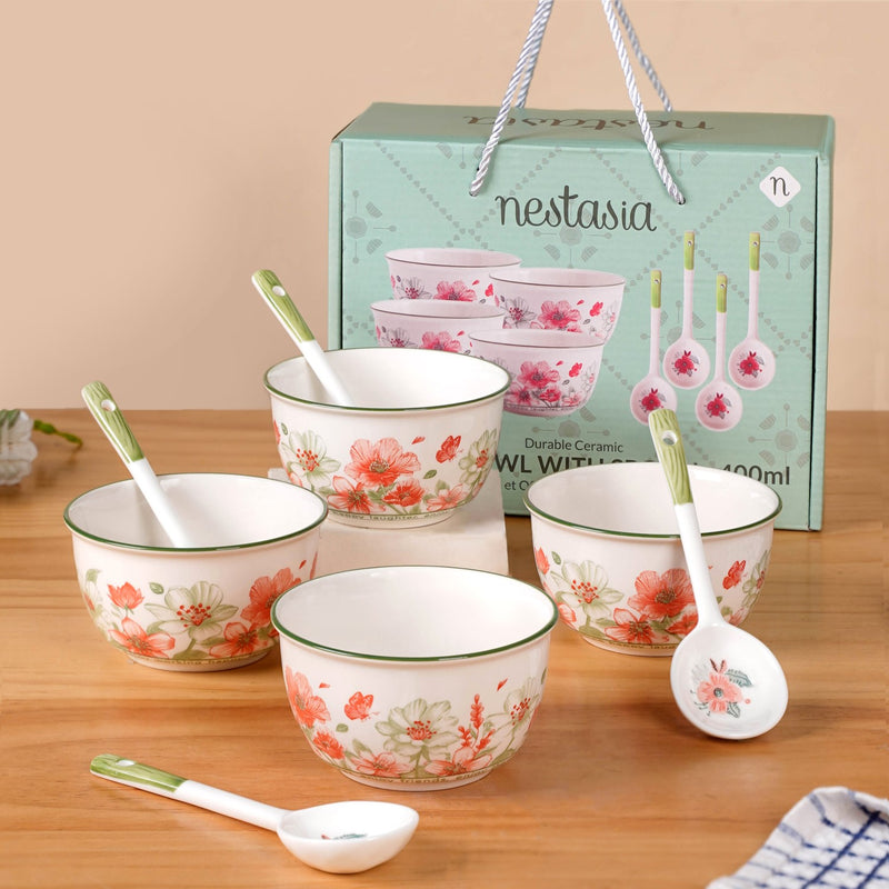 Design: This elegant ceramic soup bowl set beautifully blends soft floral prints with thoughtful design details. The bowls feature a classic white base accented by a soothing green rim, while the body is adorned with delicate floral motifs that lend an ethereal charm. Each bowl is paired with a matching soup spoon, featuring a green-and-white handle and a dainty pastel red flower at the centre, perfectly tying the whole look together with grace and elegance.