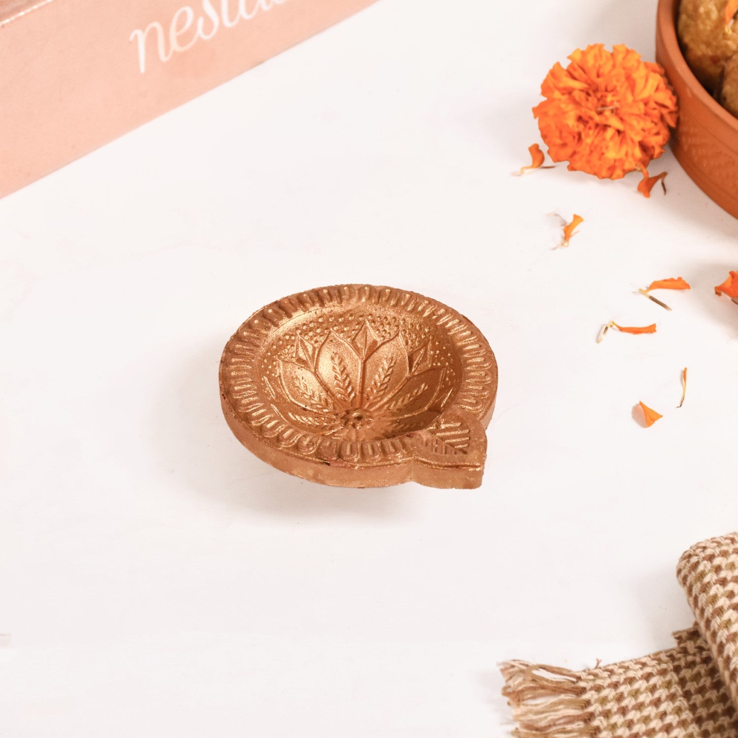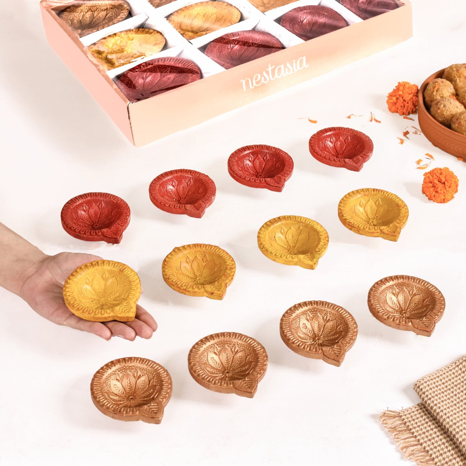 Design: Available in 3 enchanting shades - gold, yellow, and brown, the clay diyas feature a neatly crafted flower motif with hand-engraved patterns running along each petal. Bordered by geometric petals and complemented by a seamless matte finish, these terracotta diyas add a touch of warmth to every occasion.