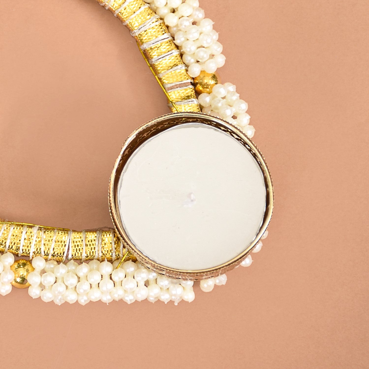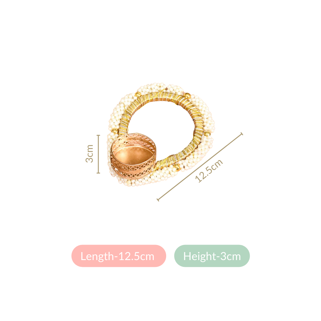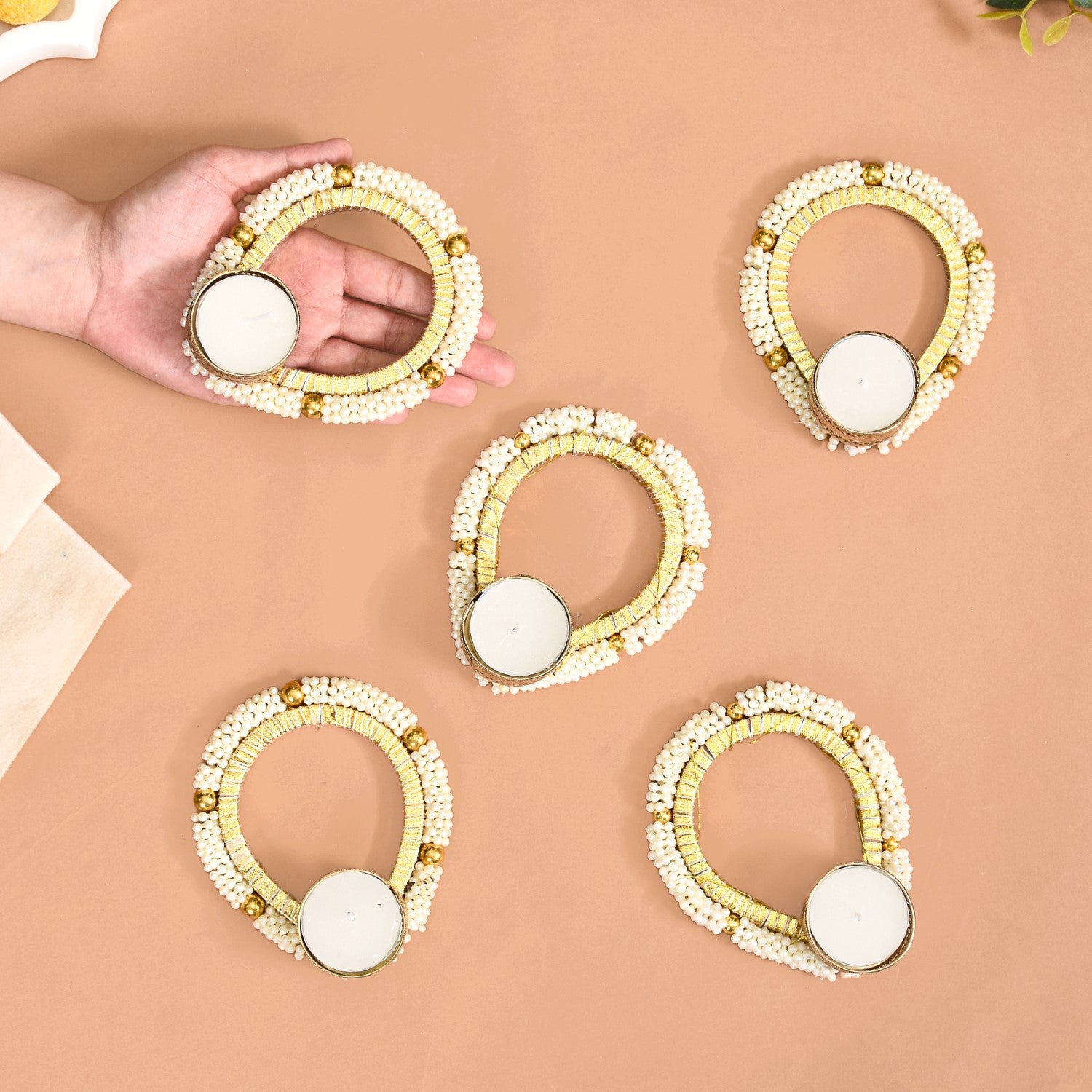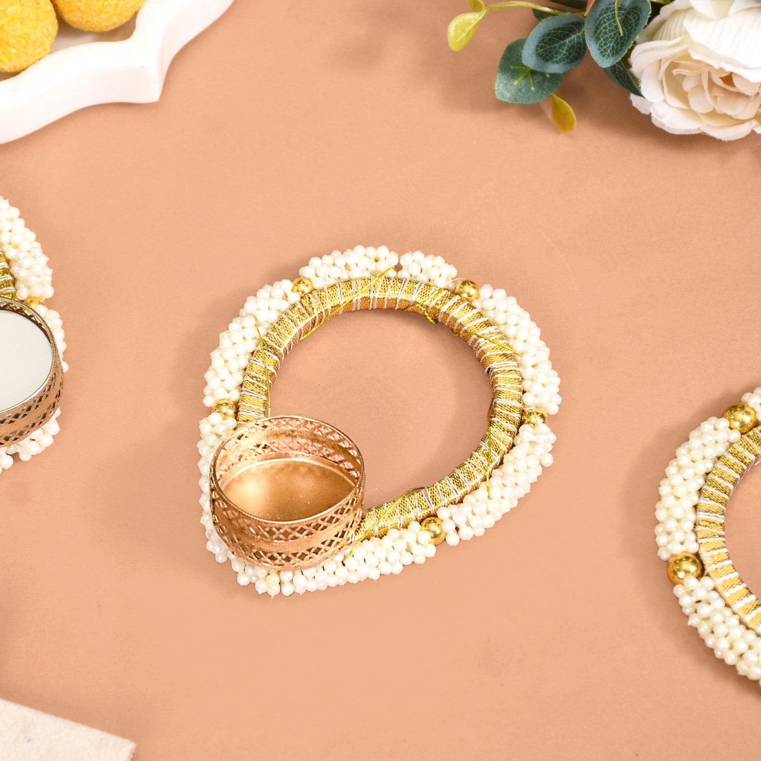 Design: Set on an oval frame covered with shimmering gold lace and bordered by mini clusters of glistening artificial pearls and golden moti balls, these tea light holders infuse elegance into every nook and corner of your home. Complete with a thin gold cup accentuated by intricate cutwork, these alluring tealight holders add a lot of character to your festive decor.