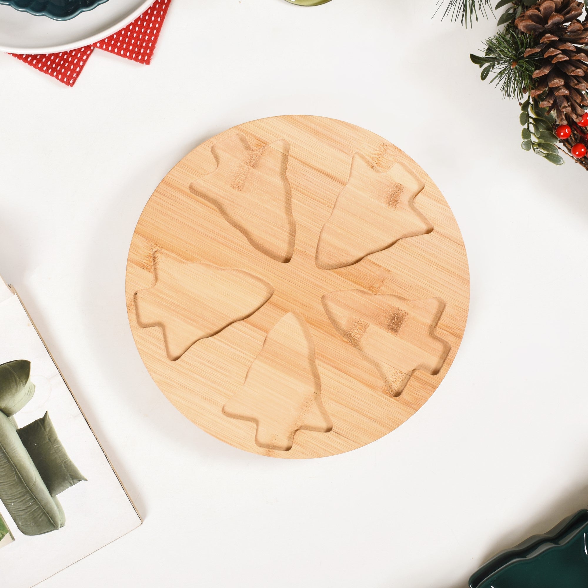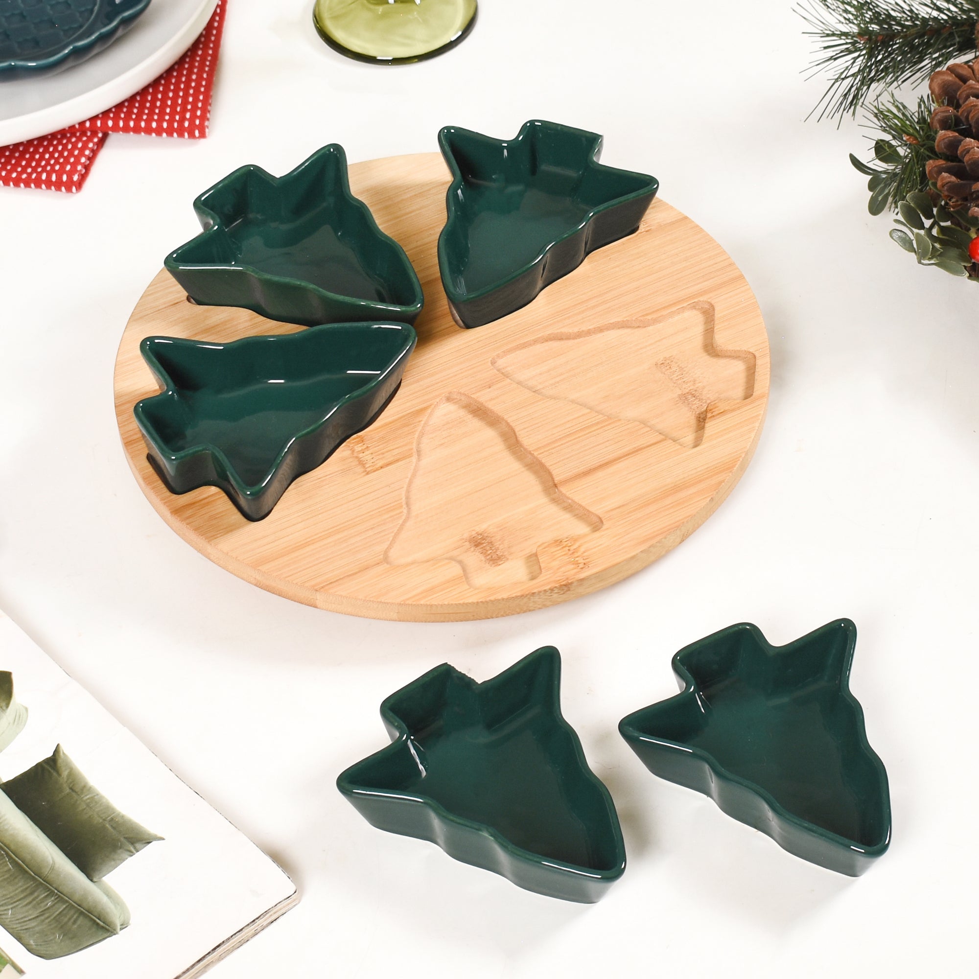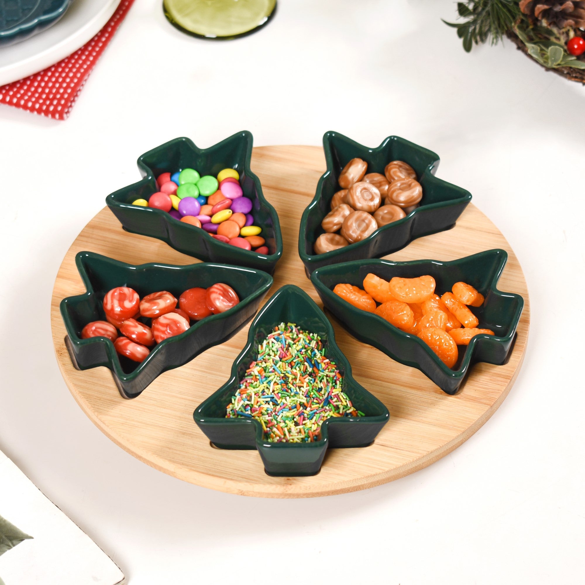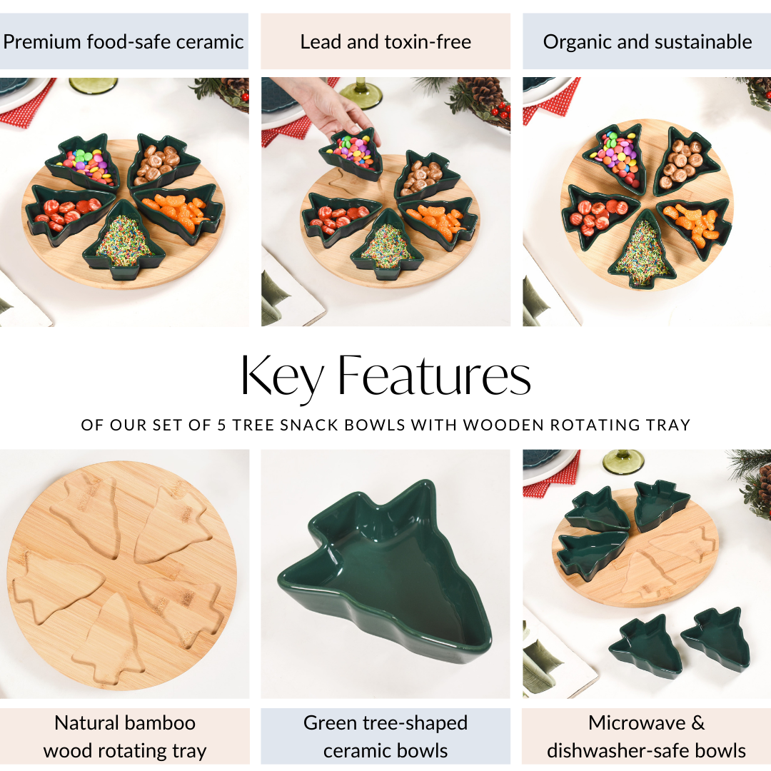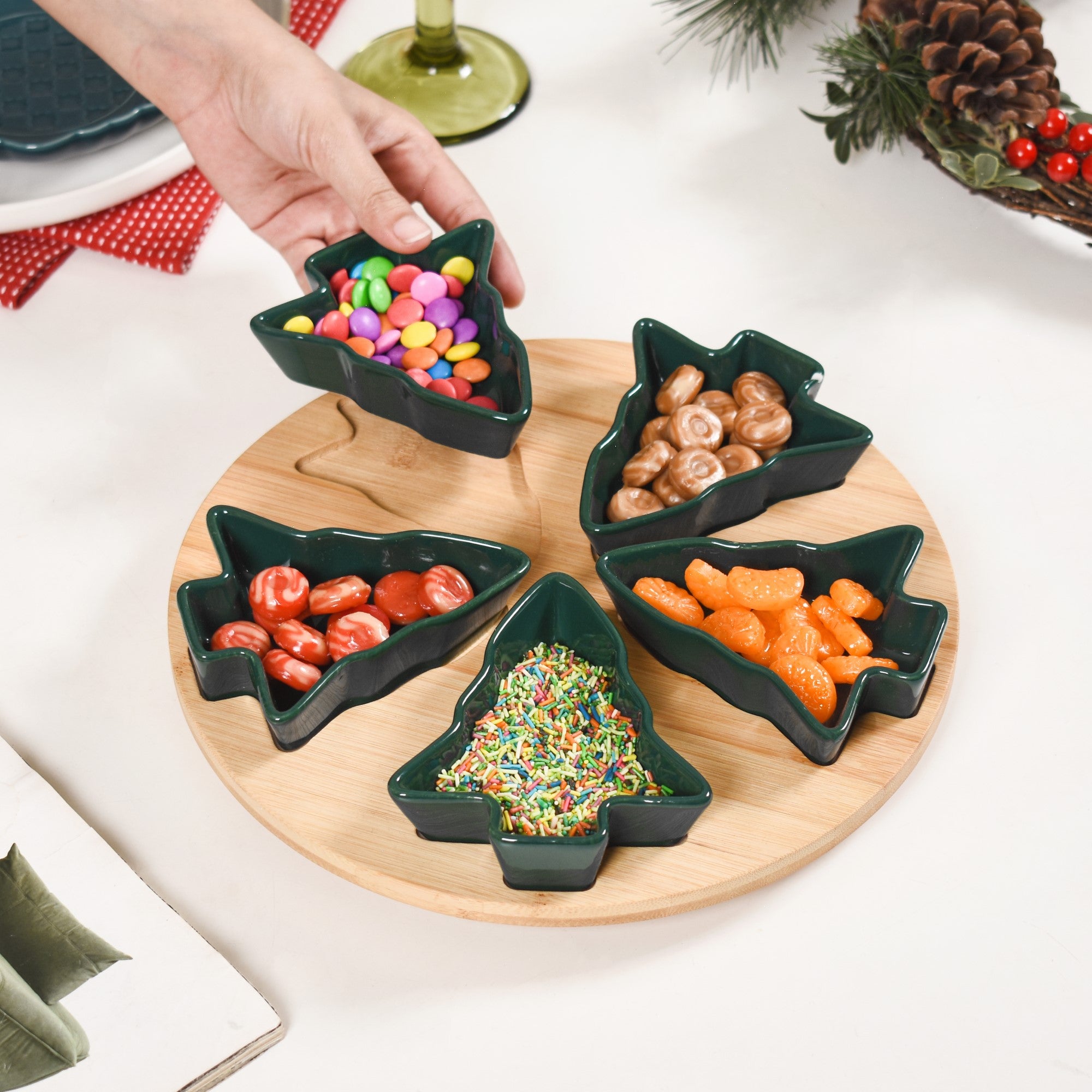 Design: Each small bowl is crafted in a unique green, tree-shaped design, adding a charming and festive touch to your table. The round bamboo tray rotates smoothly, making it easy to access the snack bowls from any angle. Ideal for serving small portions, the set is perfect for family gatherings or entertaining guests.