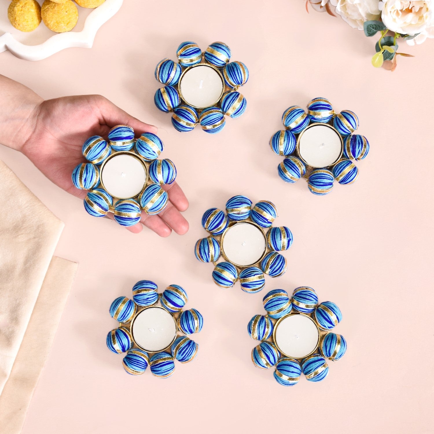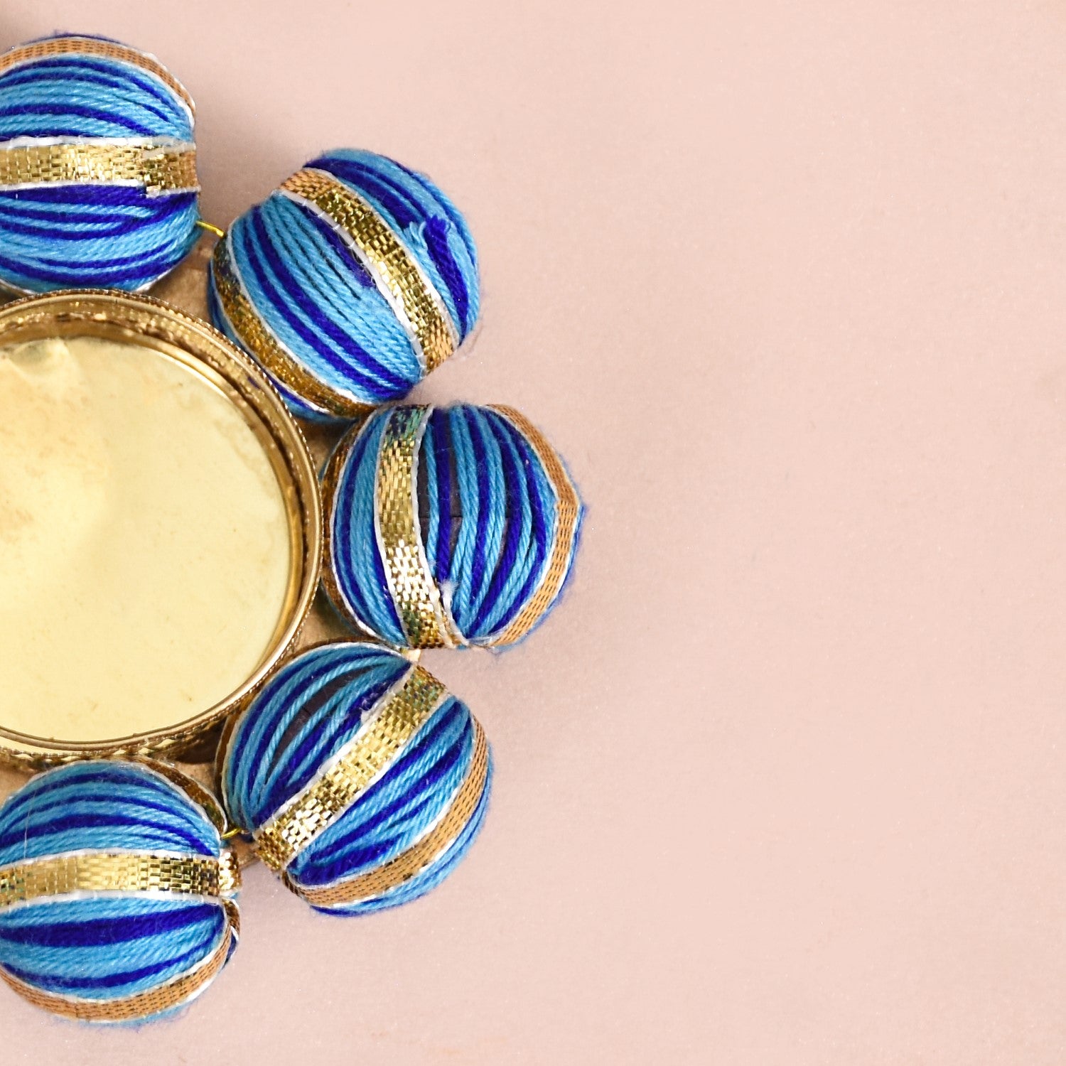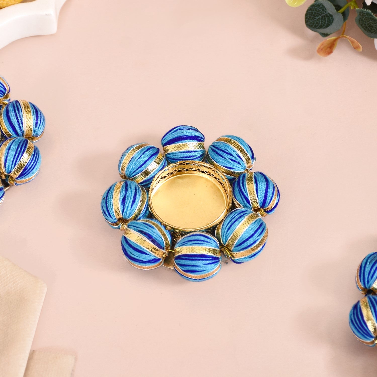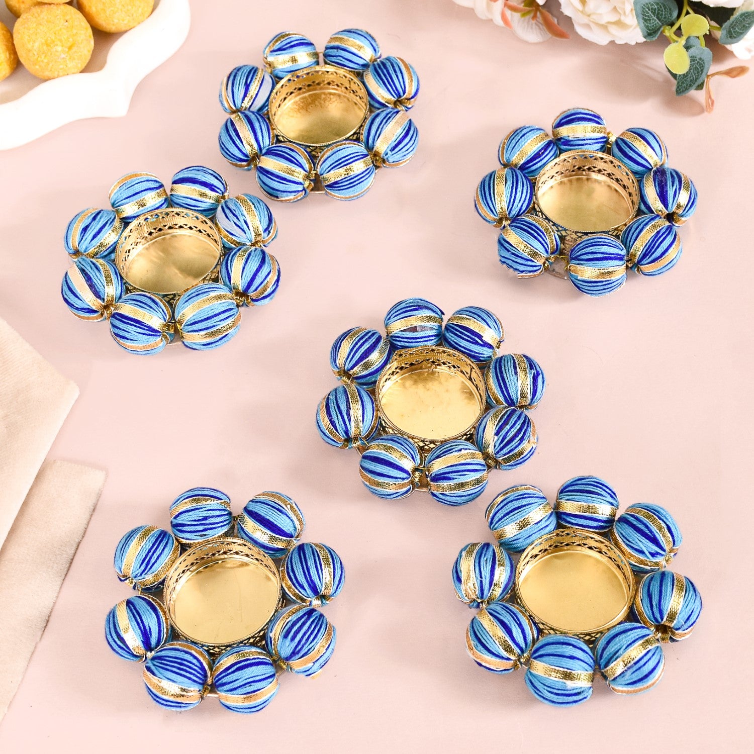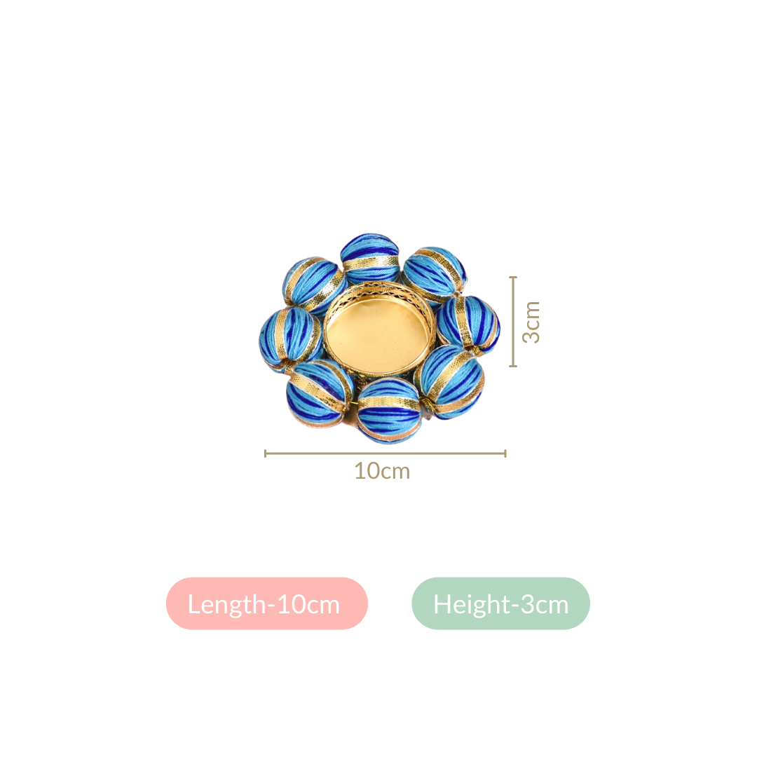 Design: These gorgeous tealight holders flaunt luxurious metal cups with intricate cutworks. Each cup is surrounded by big moti balls accentuated by vibrant blue threadwork and gold lace.