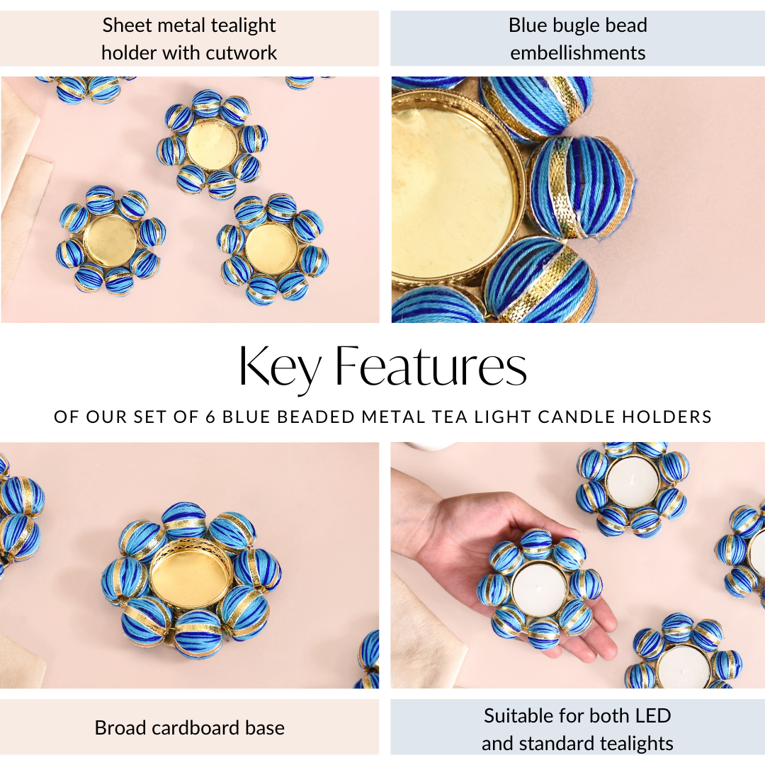 Set Of 6 Blue Beaded Metal Tea Light Candle Holders