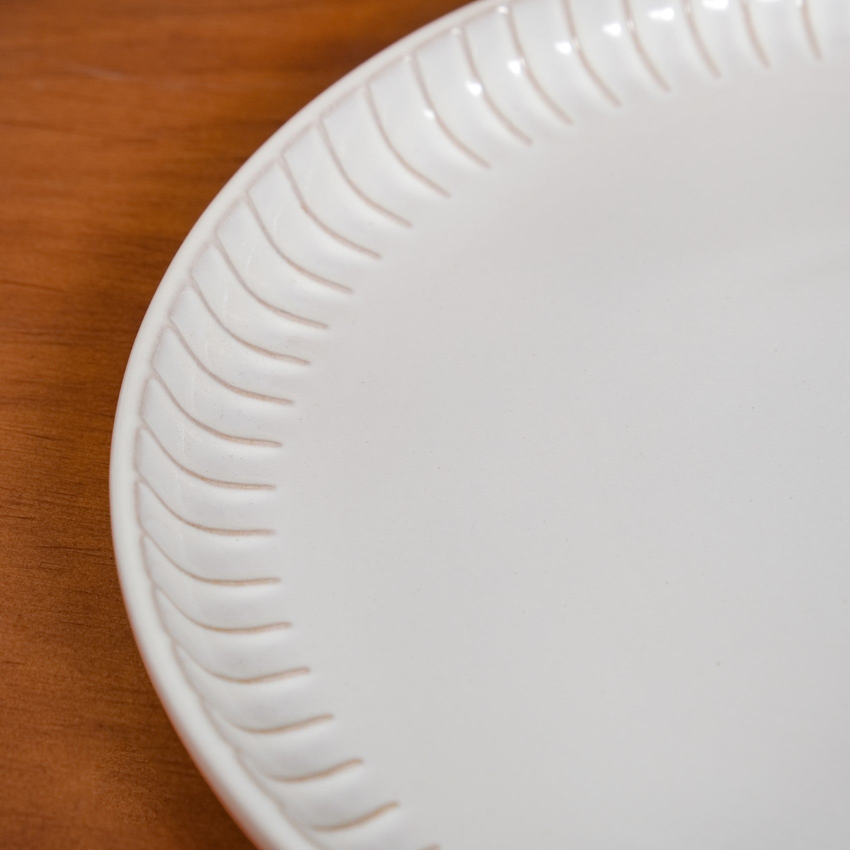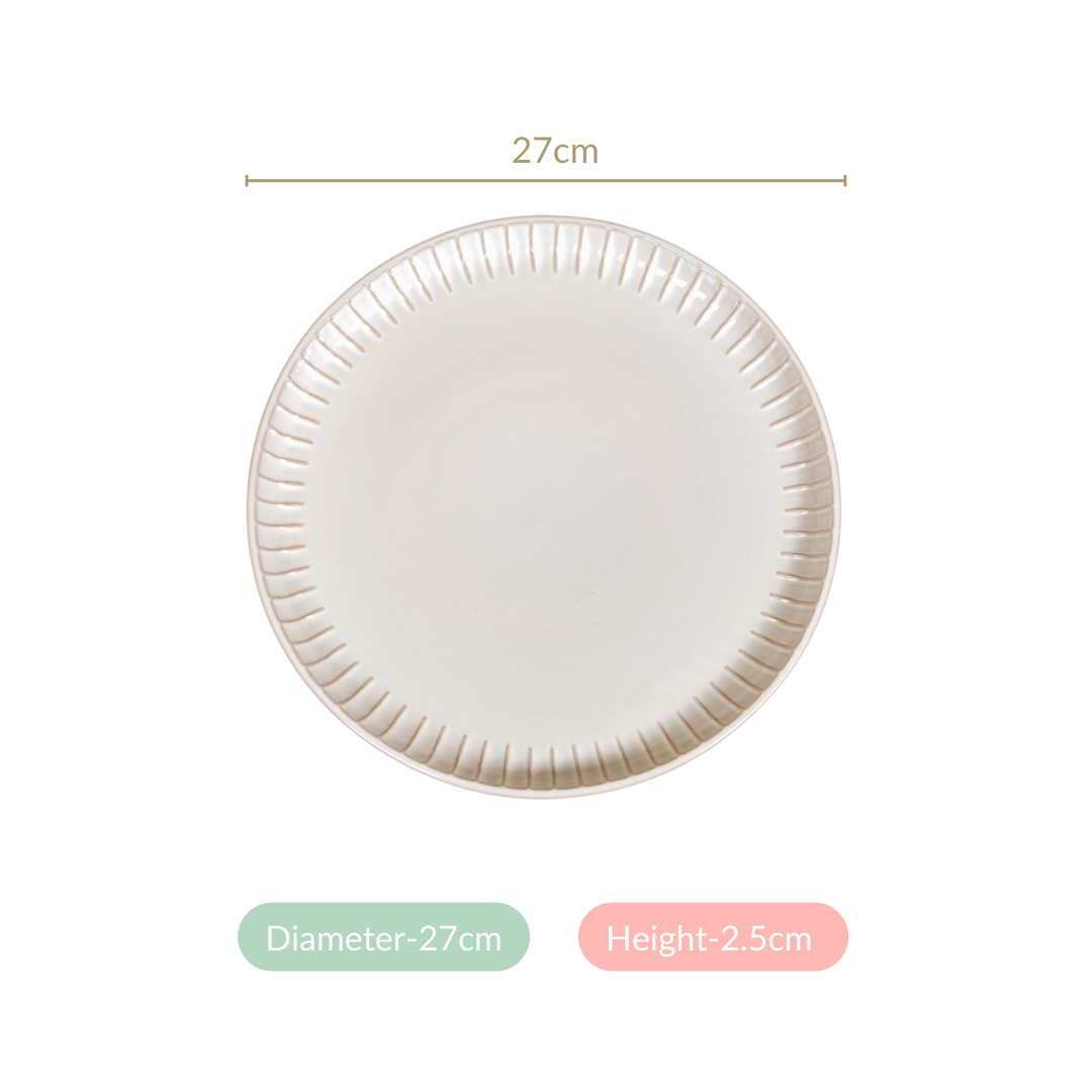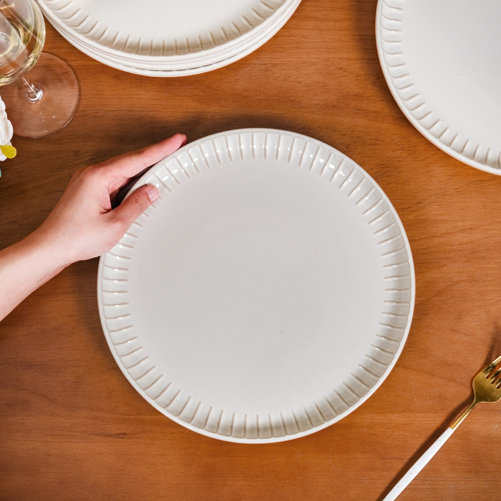 Design: Crafted from high-quality ceramic, these dinner plates blend timeless appeal with practical design for an effortless presentation. Each dinner plate features elegantly elevated edges and a distinctive fluted, ribbed texture along the rim, adding a touch of artistic charm.