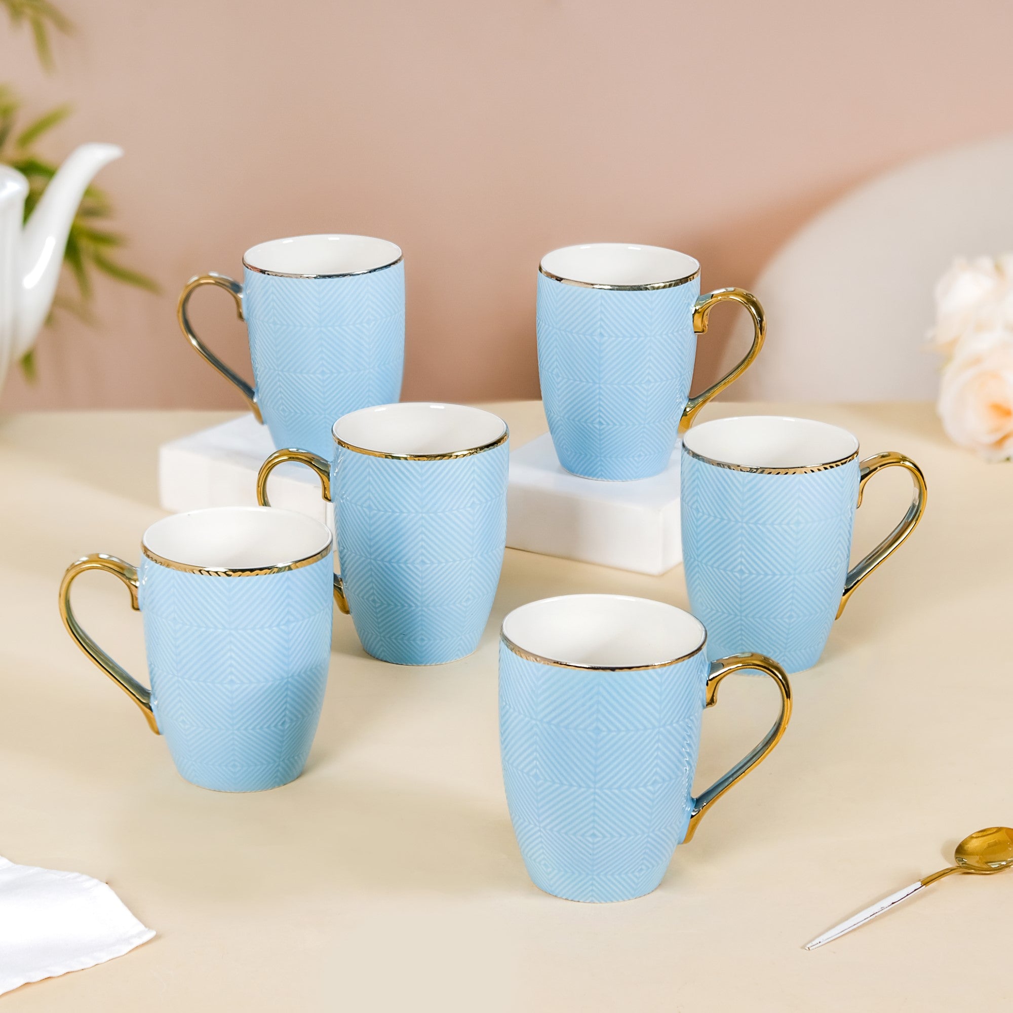 Enhance your beverage experience with our elegant ceramic cup set, a collection of six exquisite cups in a serene shade of blue that promises to elevate your tea and coffee moments. The cups are not just functional but a work of art, with intricate geometric patterns adorning their exteriors, creating a visual charm that's sure to captivate your senses. These versatile cups are perfect for serving a variety of beverages, from indulgent cappuccinos to comforting cups of tea.