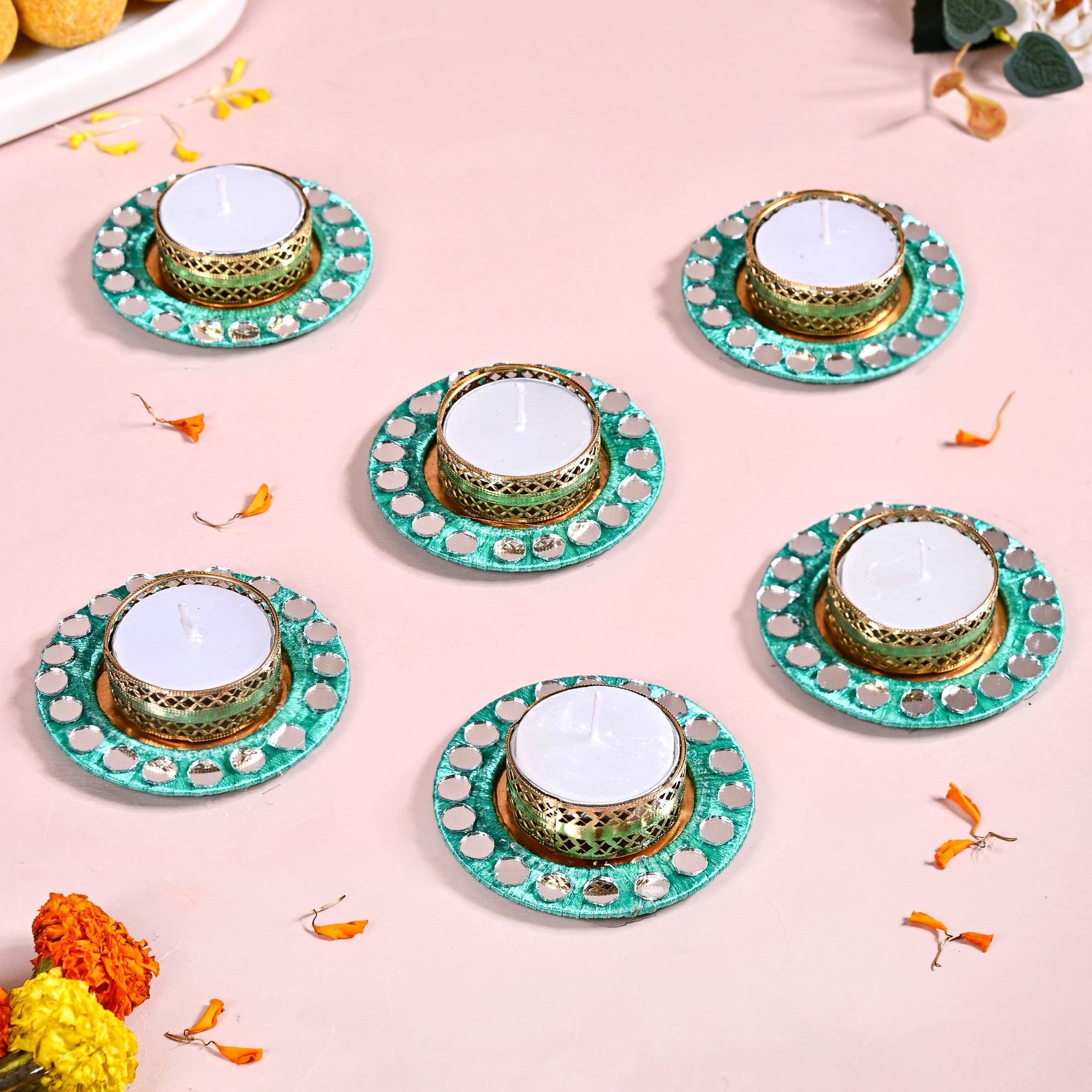 Set Of 6 Firozi Tea Light Holders With Mirrorwork