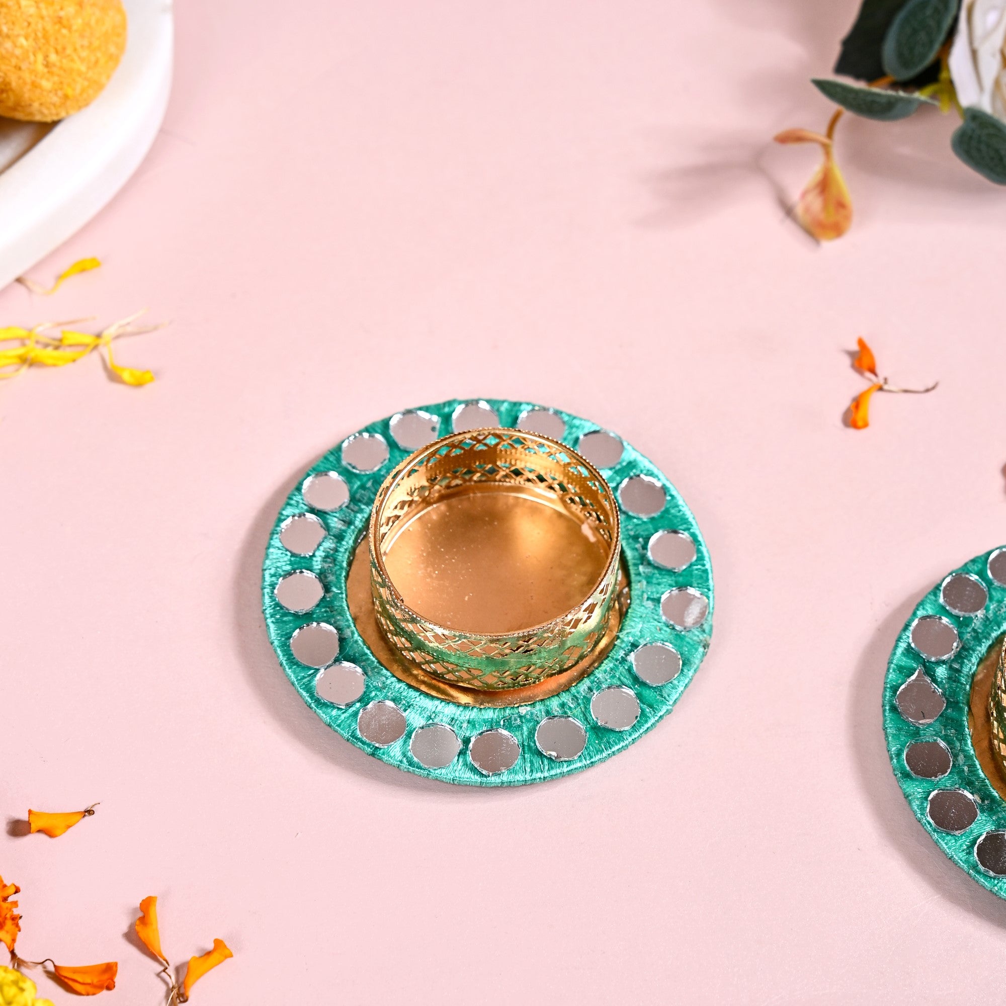 Design: Each tealight holder features a sturdy circular base adorned with vibrant teal threadwork and gleaming mirror patches to amplify the luminosity. Topped with a delicate golden metal cup with intricate cutwork, these delightful pieces are the epitome of immaculate craftsmanship.