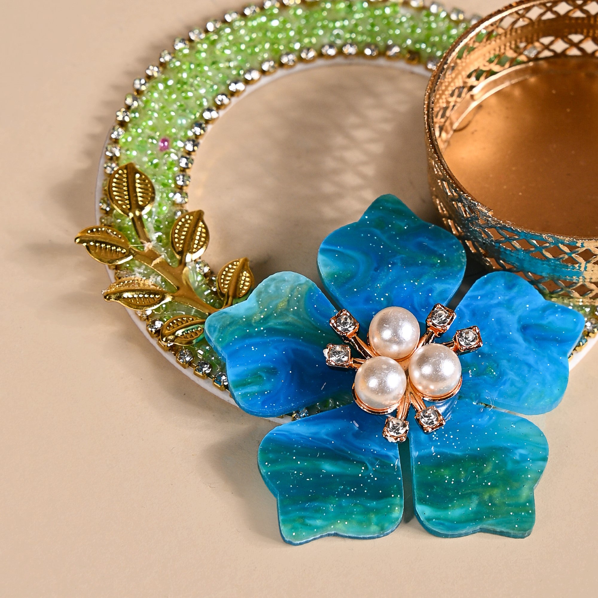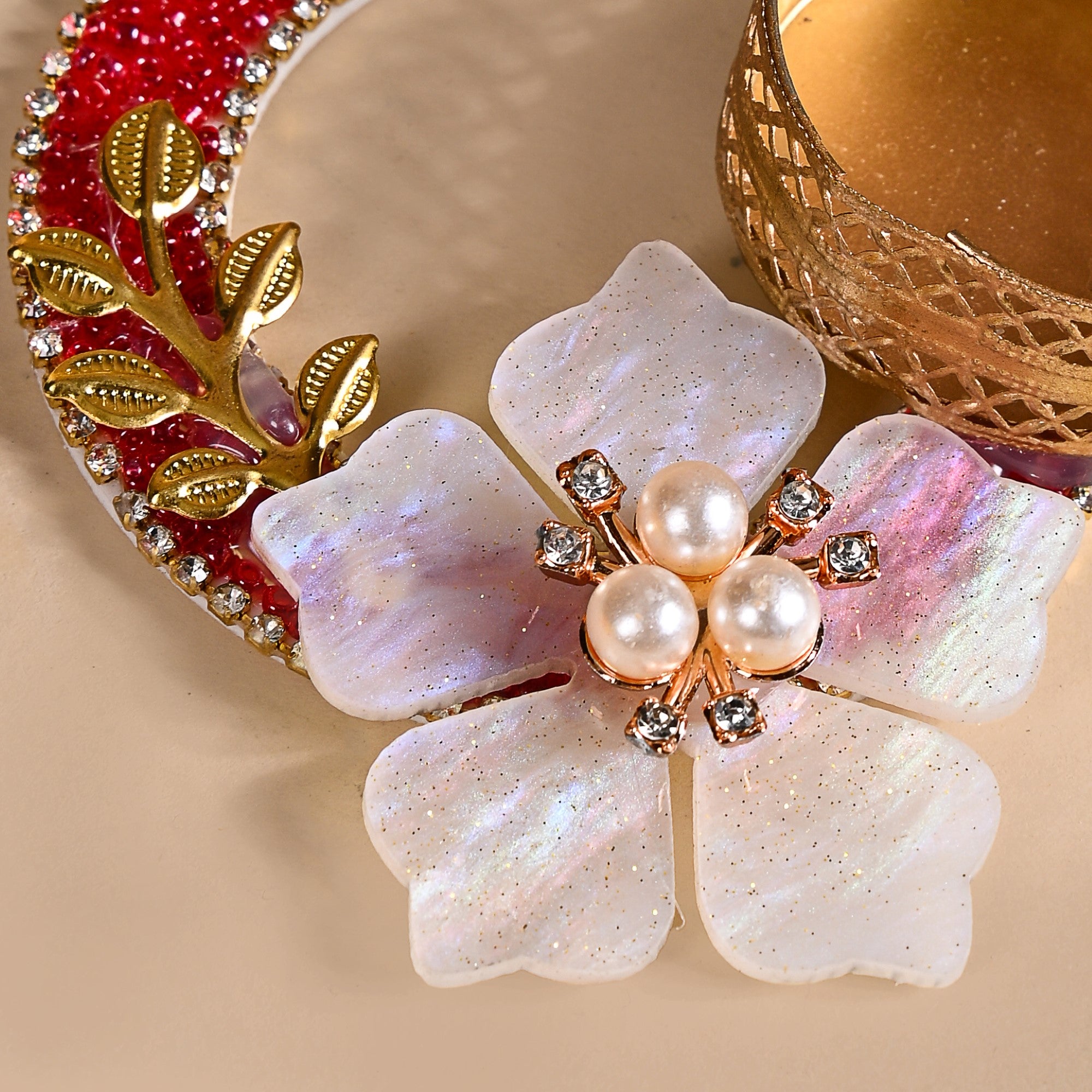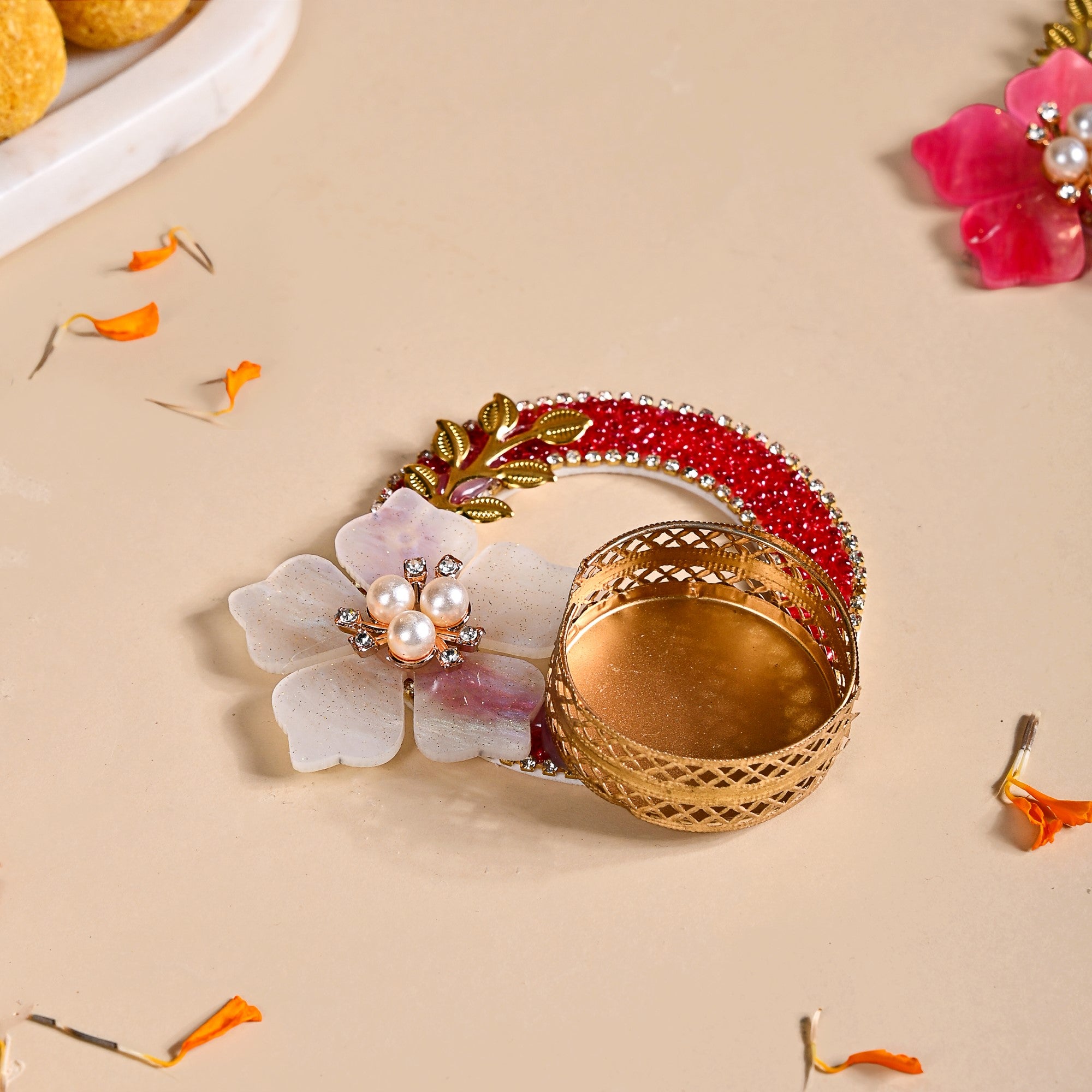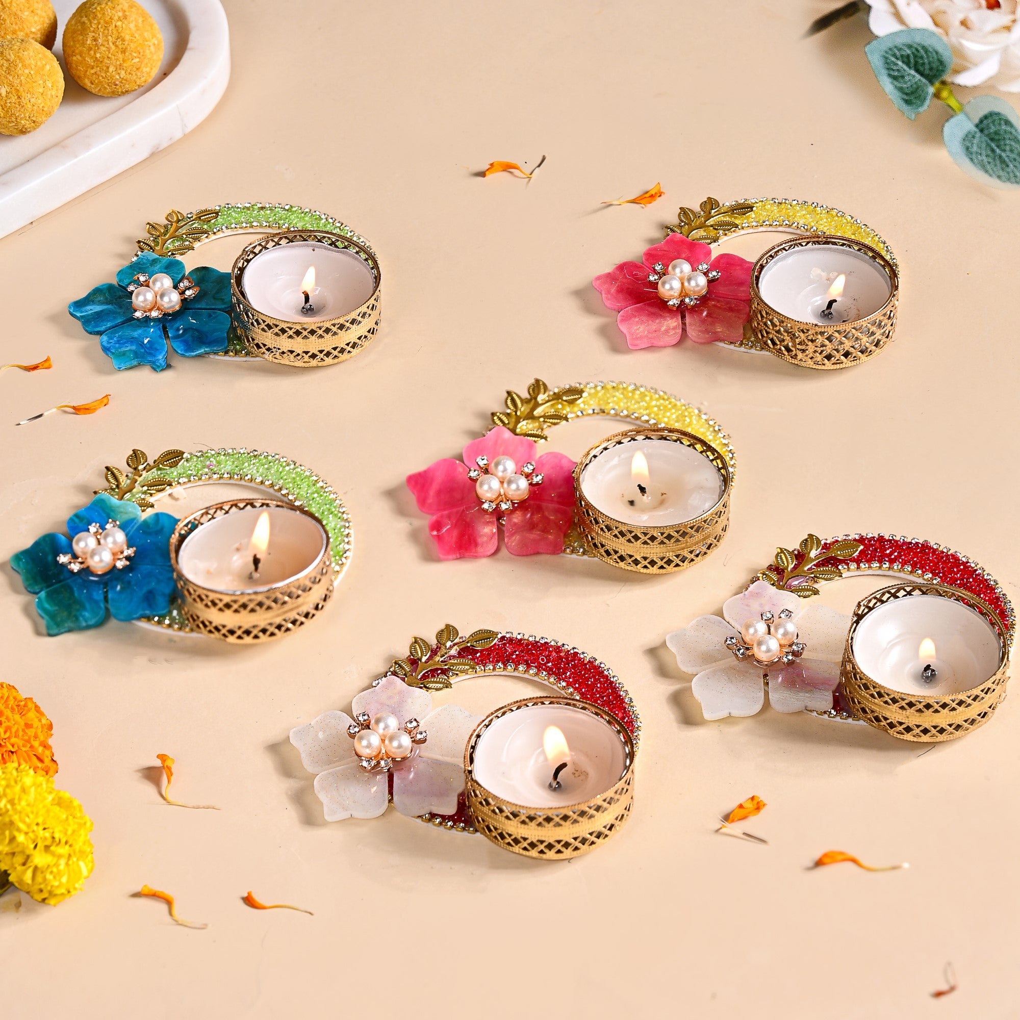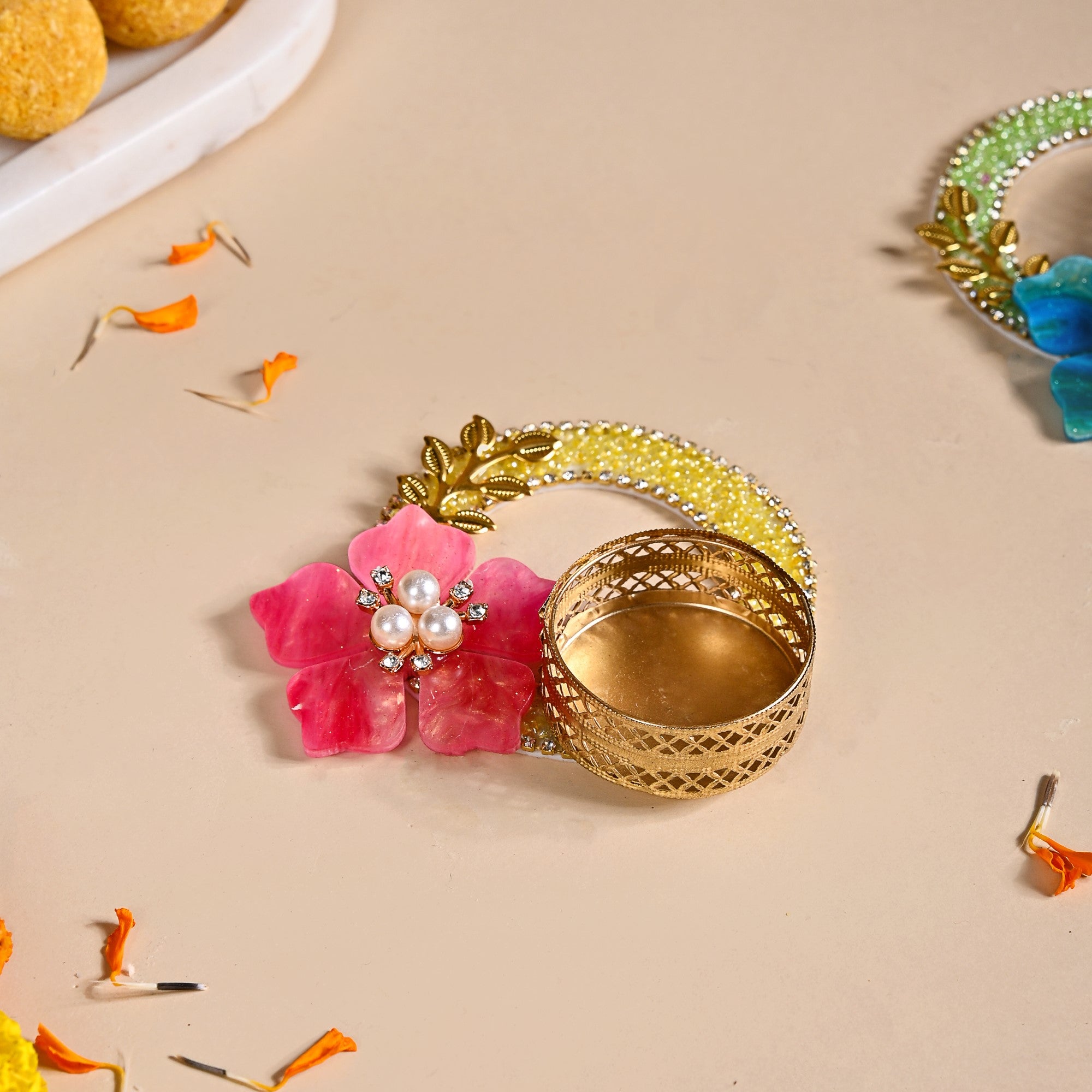 Design: Each tea light holder features a ring base embellished with glimmering beads and a captivating resin flower with subtle gradients and flecks of glitter. Topped with a cluster of faux pearls and dazzling stones, and further enhanced by intricately crafted golden metal leaves, these candle holders add a touch of intrigue to your decor. Resting beside is a golden metal cup with precise cutwork, serving as the perfect receptacle for your tea lights. Available in 3 wonderful colour combinations - red, green, and yellow, these tealight holders add a special touch to every occasion.