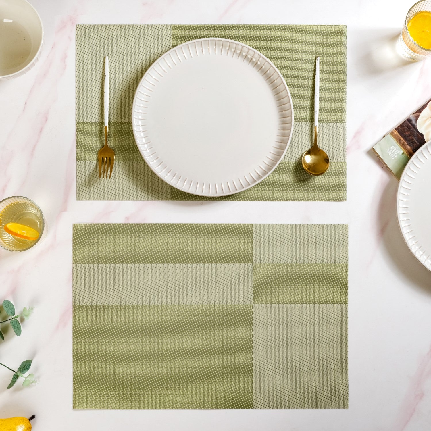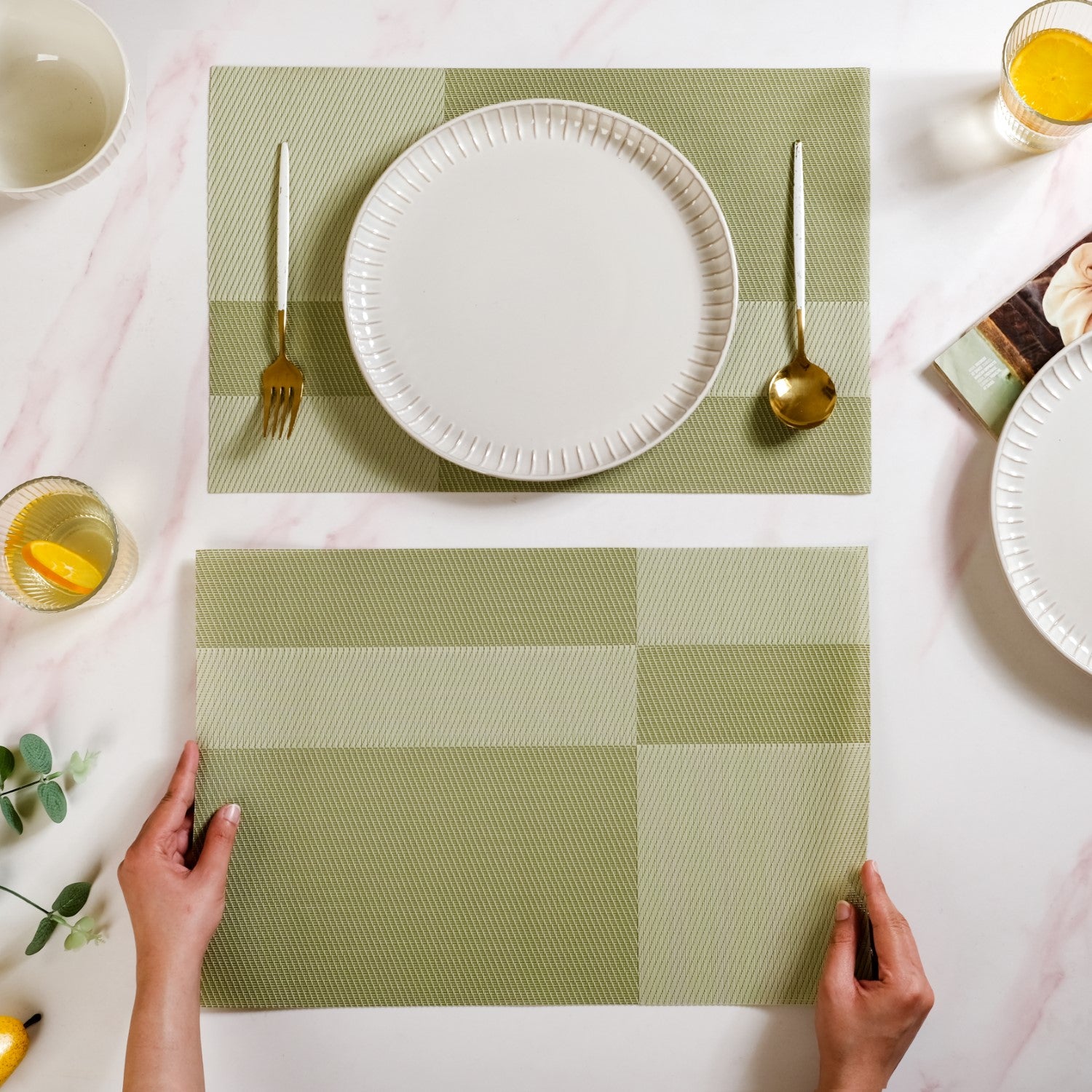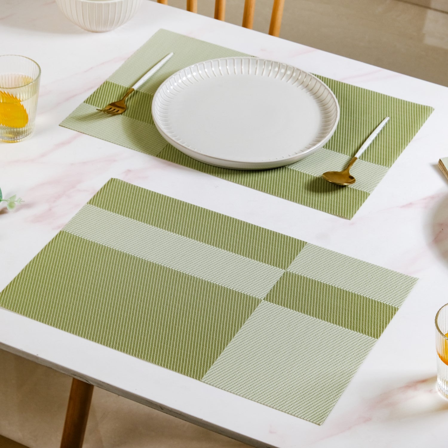 A dinner setting that scores full marks for style, function, and just the right pop of green. These reversible placemats bring both charm and practicality to your table, making them an ideal choice for modern homes.