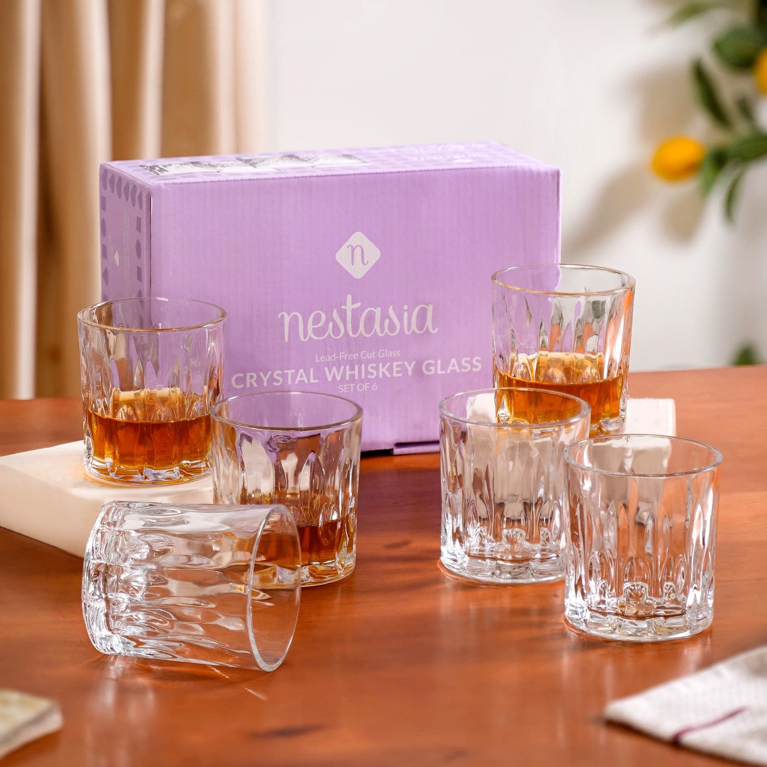 Raise a glass to elegance with this set of six luxurious whiskey tumblers. Crafted from high-quality glass, these timeless drinking glasses combine beauty and practicality, making them the perfect addition to any home bar or special occasion.