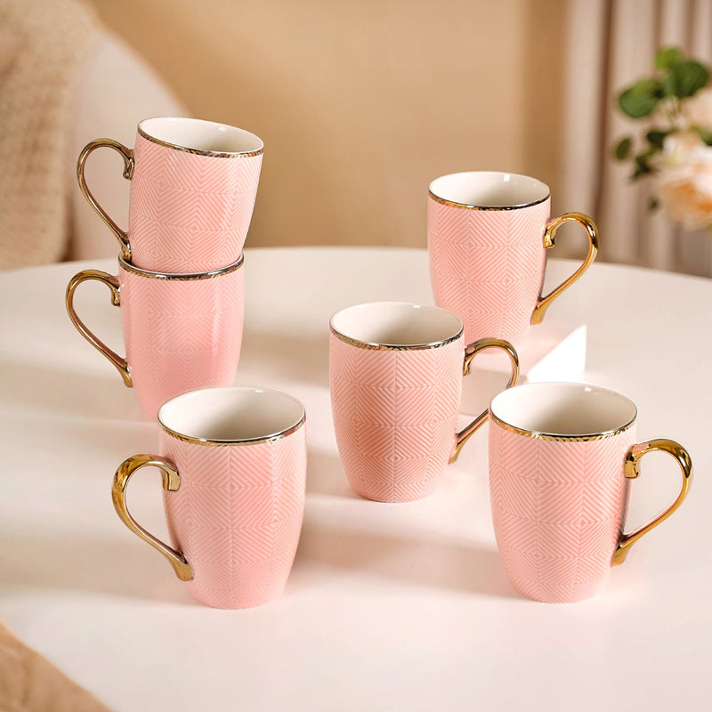 The ceramic cup set includes six stunning teacups, all featuring a delightful shade of pink and adorned with intricate pink floral motifs, elegantly complemented by golden leaf motifs. Each cup in the set is a masterpiece, meticulously crafted from premium quality non-porous ceramic material. These cups are designed to elevate your tea and coffee moments, infusing an element of luxury into your daily beverage rituals or special occasions. With their radiant golden rims and sturdy C-shaped golden handles, they offer both style and functionality. However, it's important to note that these cups are not microwave or dishwasher-safe, as excessive heat can potentially harm the delicate golden accents. Transform your beverage experience with this exquisite ceramic cup set, where every sip becomes a celebration of refined elegance.